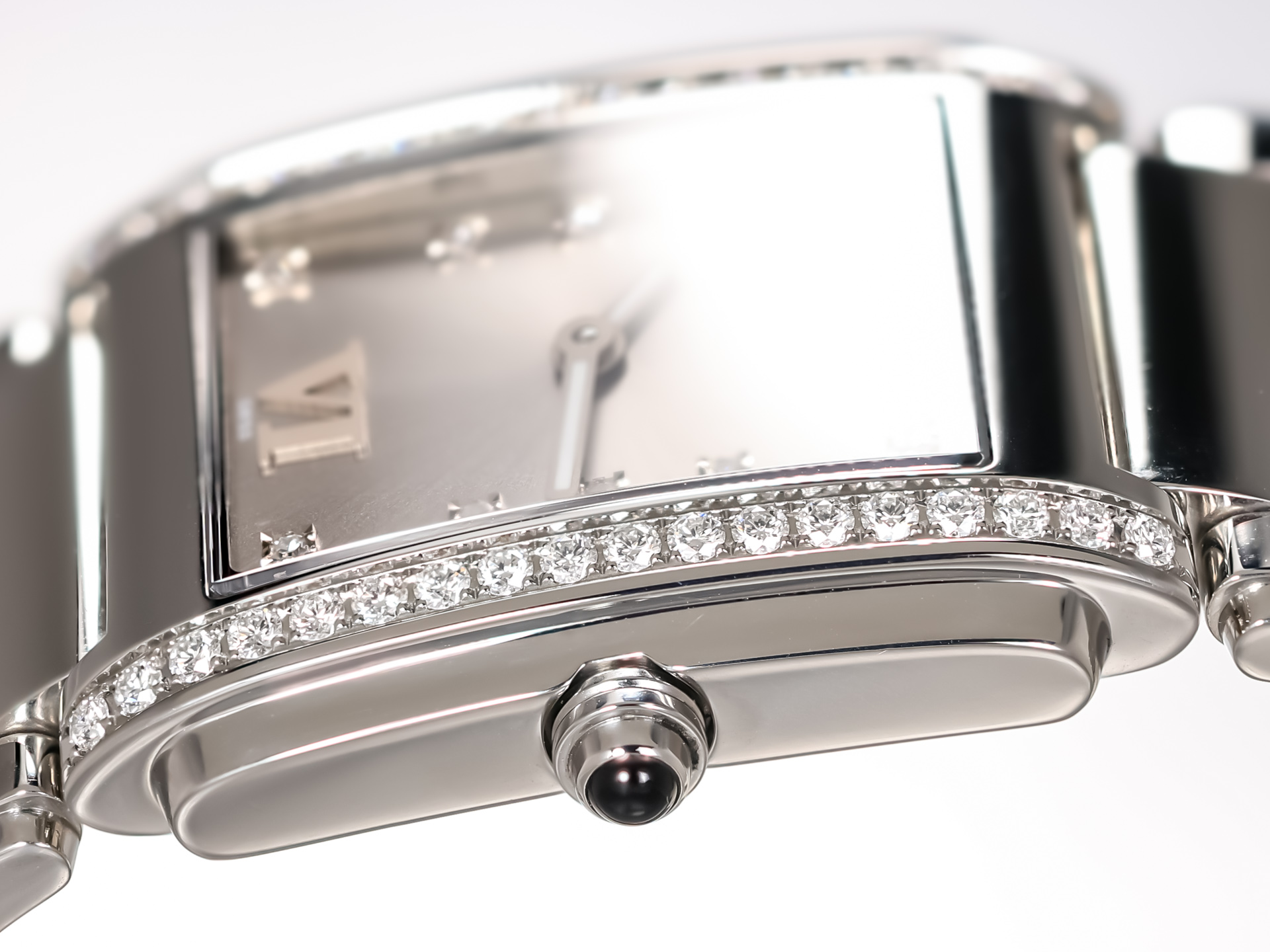 The curved case gives the watch an elegant silhouette, while the diamond-set bezel adds a subtle touch of luxury without compromising on restraint. The clearly designed dial emphasizes the classic lines of the timepiece and ensures excellent readability.