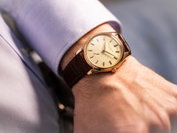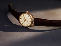 The watch is fitted with a high-quality leather strap, maintaining its elegant and classic character.