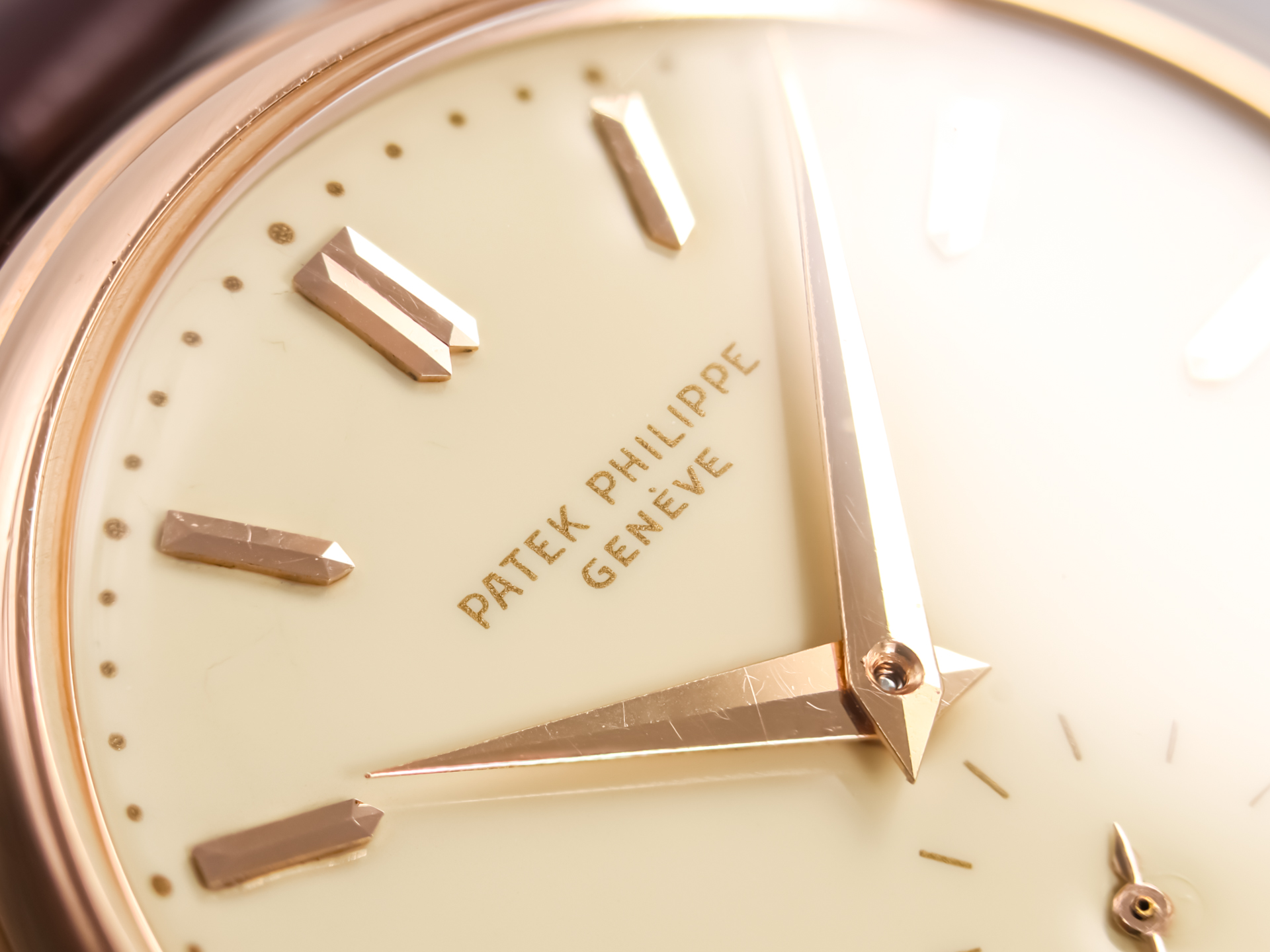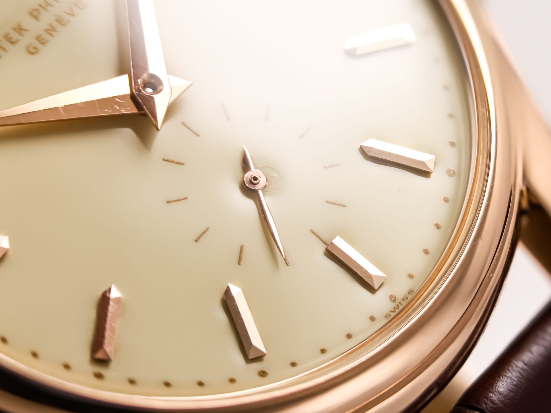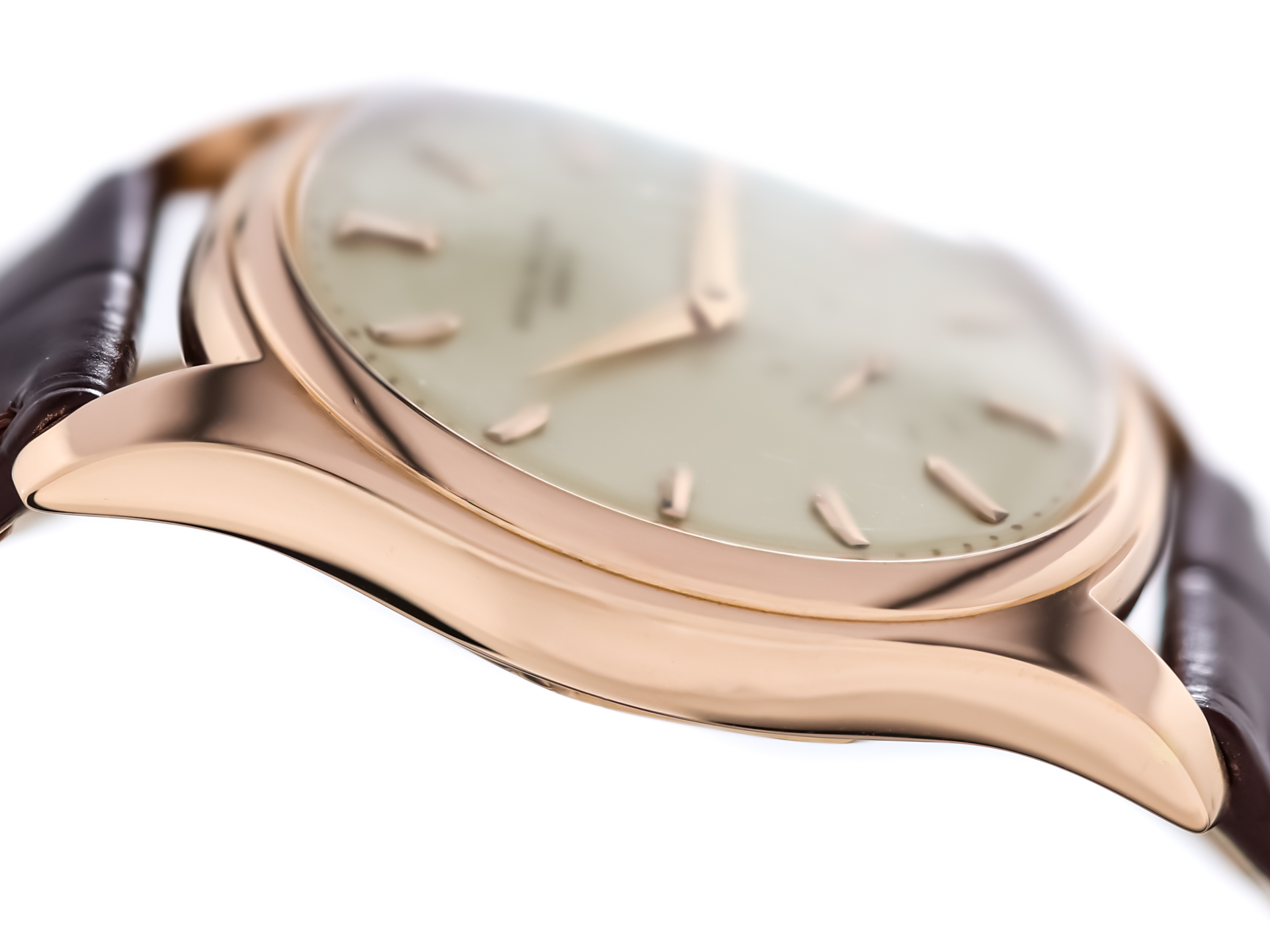 Crafted in solid 18k rose gold and dating to 1955, this exceptional example embodies the timeless elegance that defines the Calatrava line. The beautifully proportioned 36 mm case, with its smooth bezel and refined lugs, offers a perfect balance of presence and sophistication, enhanced by the warm tone of the rose gold. And of course we also find the original rose gold PP crown on the case.
