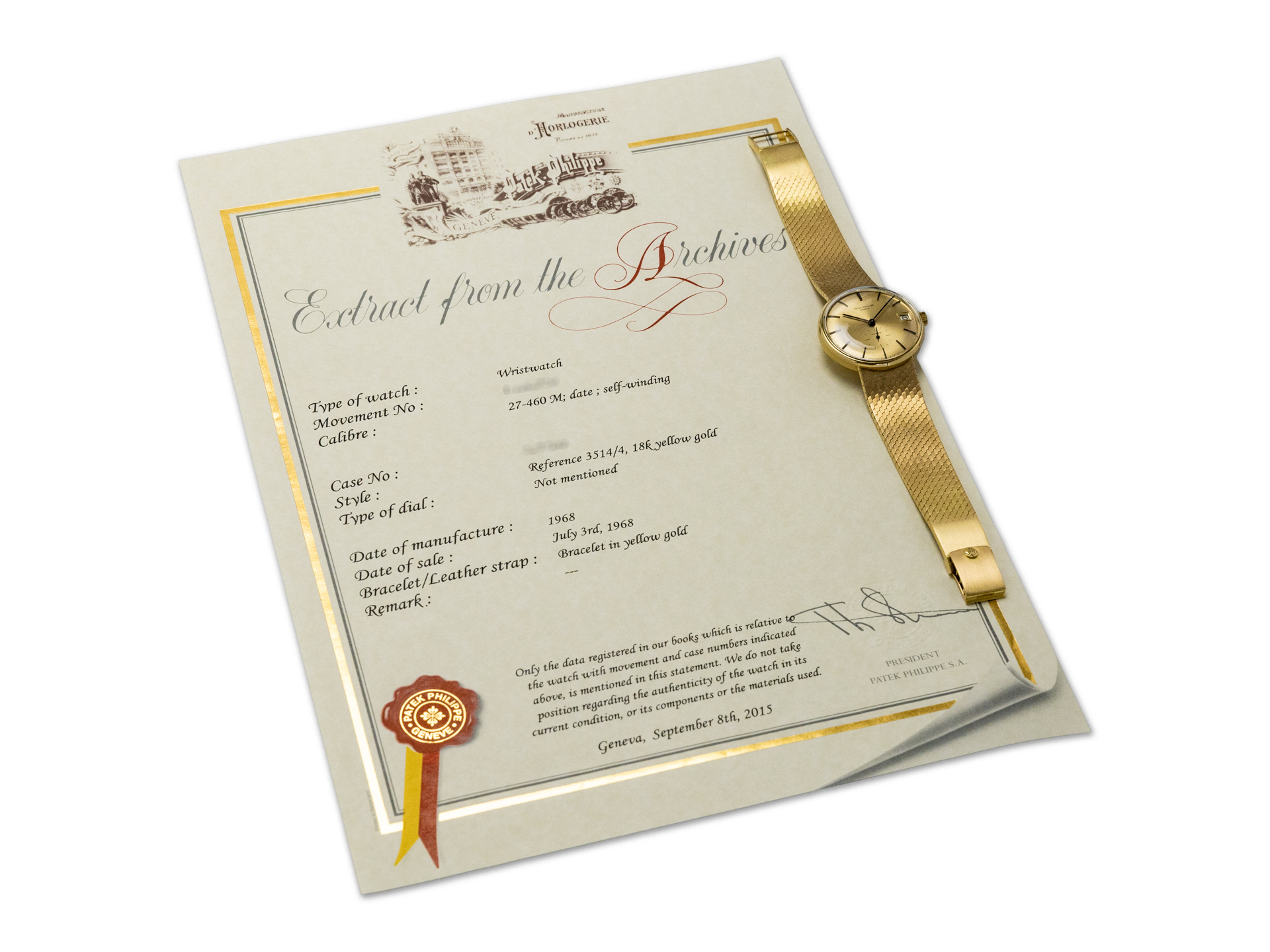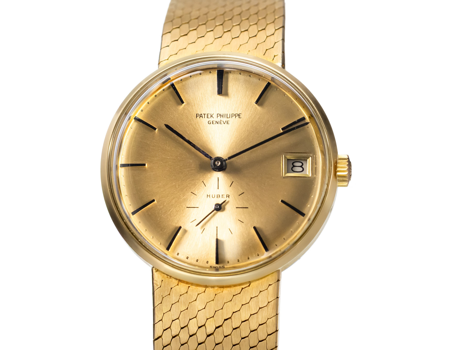 An exceptionally rare and elegant Patek Philippe Calatrava Monodate Automatic Ref. 3514-4 in 18k yellow gold, featuring a gold-colored retailer-signed Huber dial, fitted with a period Milanese bracelet and accompanied by an Extract from the Archives, preserved in excellent condition, circa 1968.