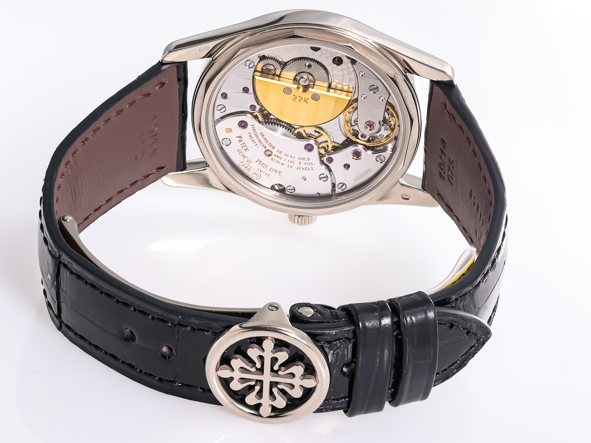 The watch is fitted with a correct Patek Philippe white gold folding clasp, enhancing both security and wearability, and is further accompanied by its original Patek Philippe travel box — desirable accessories that elevate the overall completeness of the set.