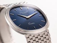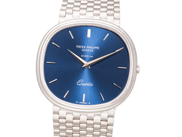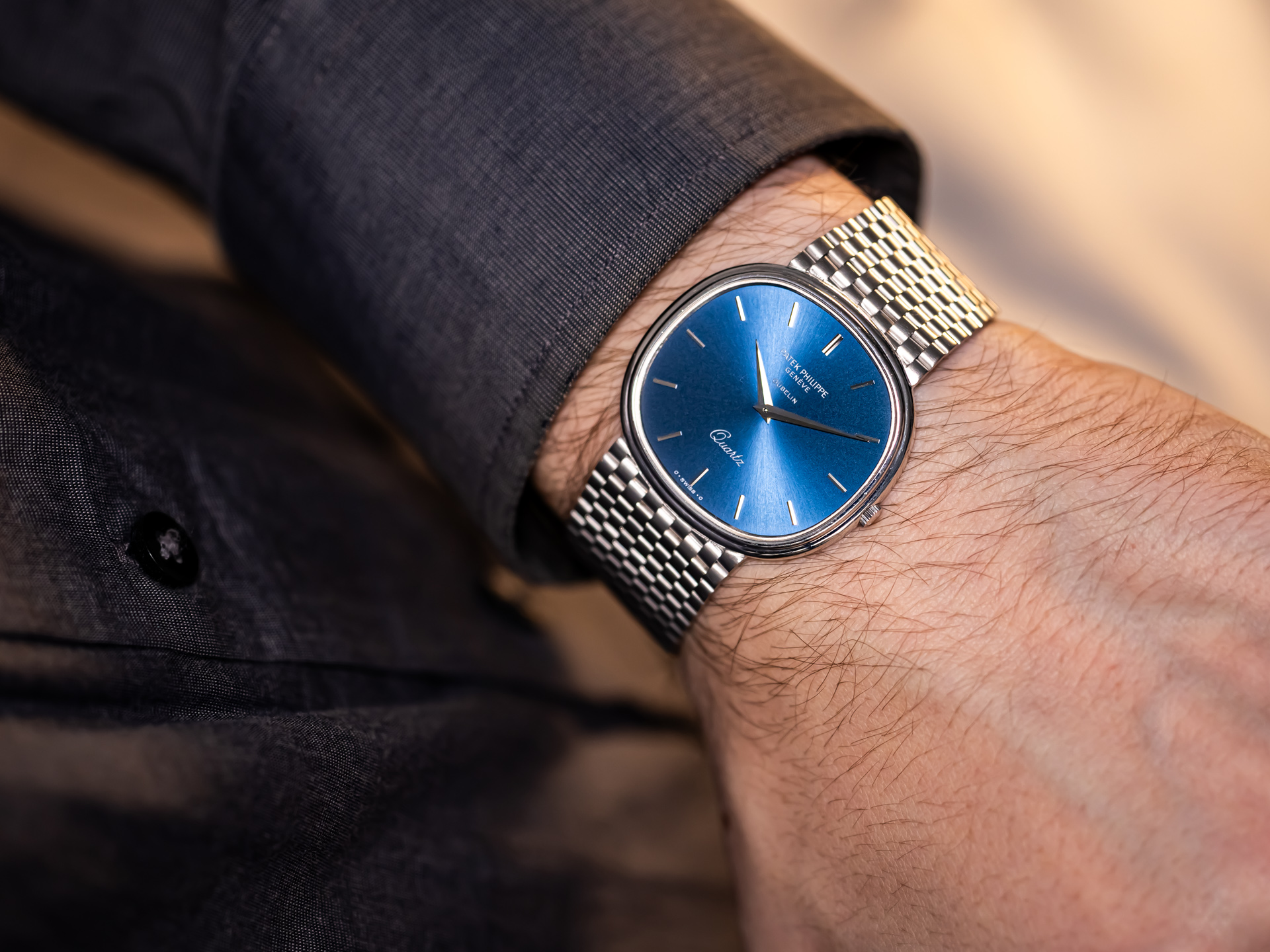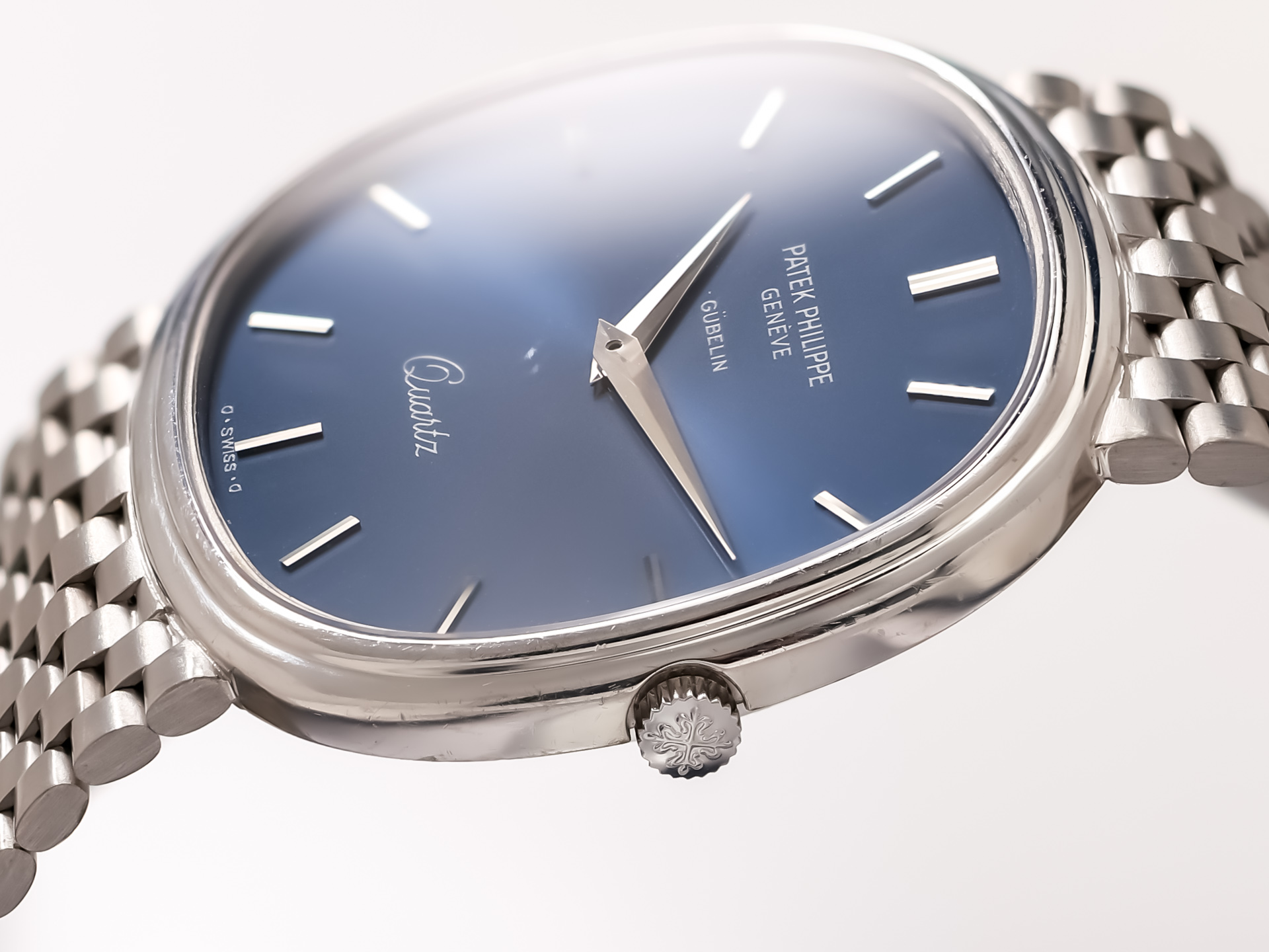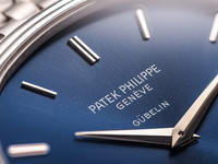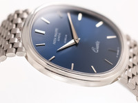 The deep blue sunburst dial — free of numerals and beautifully balanced by slender white-gold baton hands — allows the elliptical geometry to speak for itself. This calm, architectural design language remains one of the most celebrated philosophies in Patek’s history.
