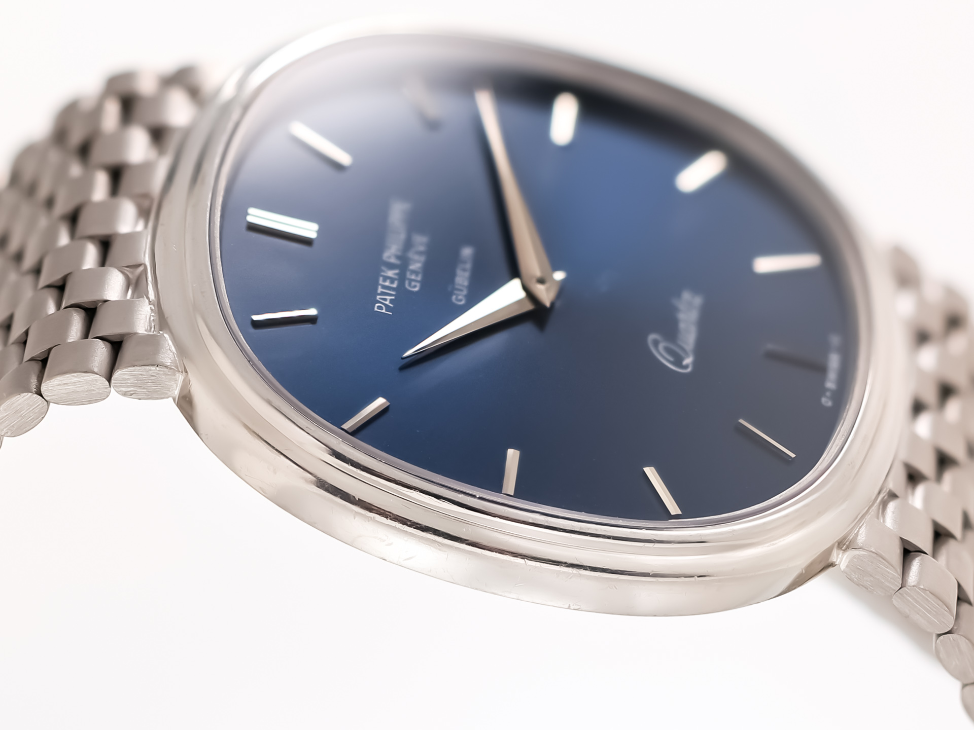 PATEK PHILIPPE VINTAGE GOLDEN ELLIPSE QUARTZ – Ref. 3879/002 – 18k White Gold – Milanese Bracelet – Box & Papers – 1982 – Excellent – Fully Serviced – Rare