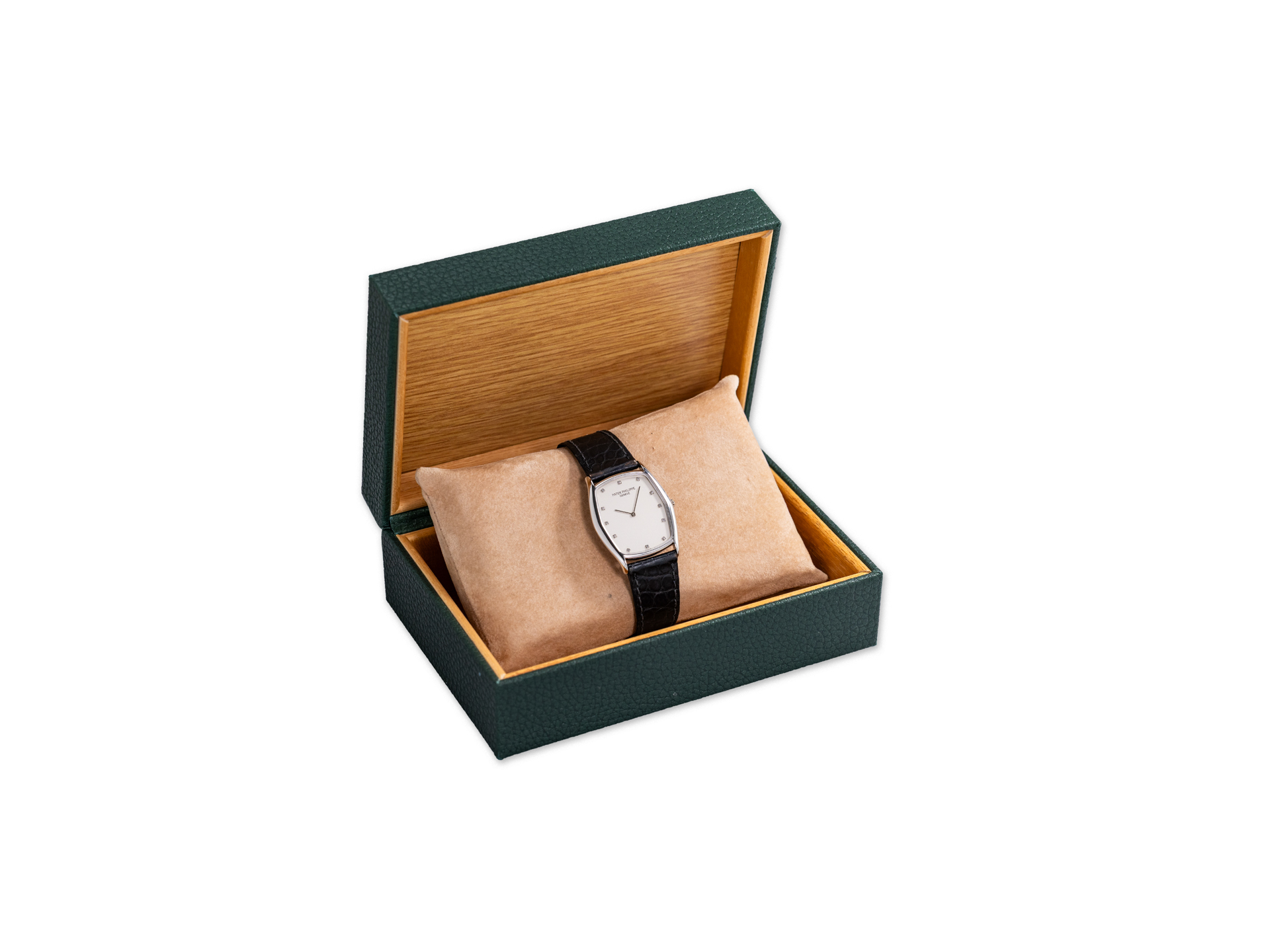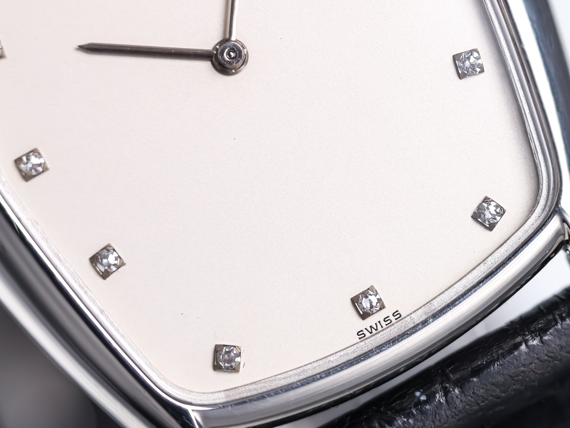 Crafted in 950 platinum and dating to 1991, this exceptional vintage example is offered in excellent condition and accompanied by its original box. With its sophisticated diamond-set dial and classic rectangular profile, it represents a rare and distinguished piece for the discerning collector.