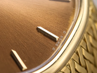The watch features a stunning honey gold-colored Sigma dial, distinguished by its applied gold baton hour markers and discreet sigma symbols flanking “Swiss” at 6 o’clock—confirming the use of solid gold indices, a detail prized by collectors.