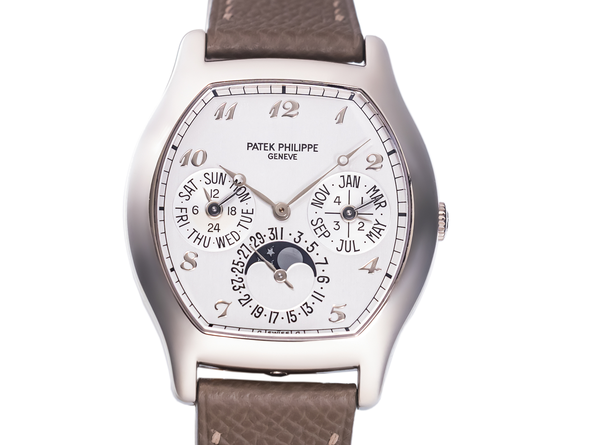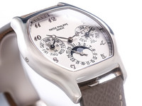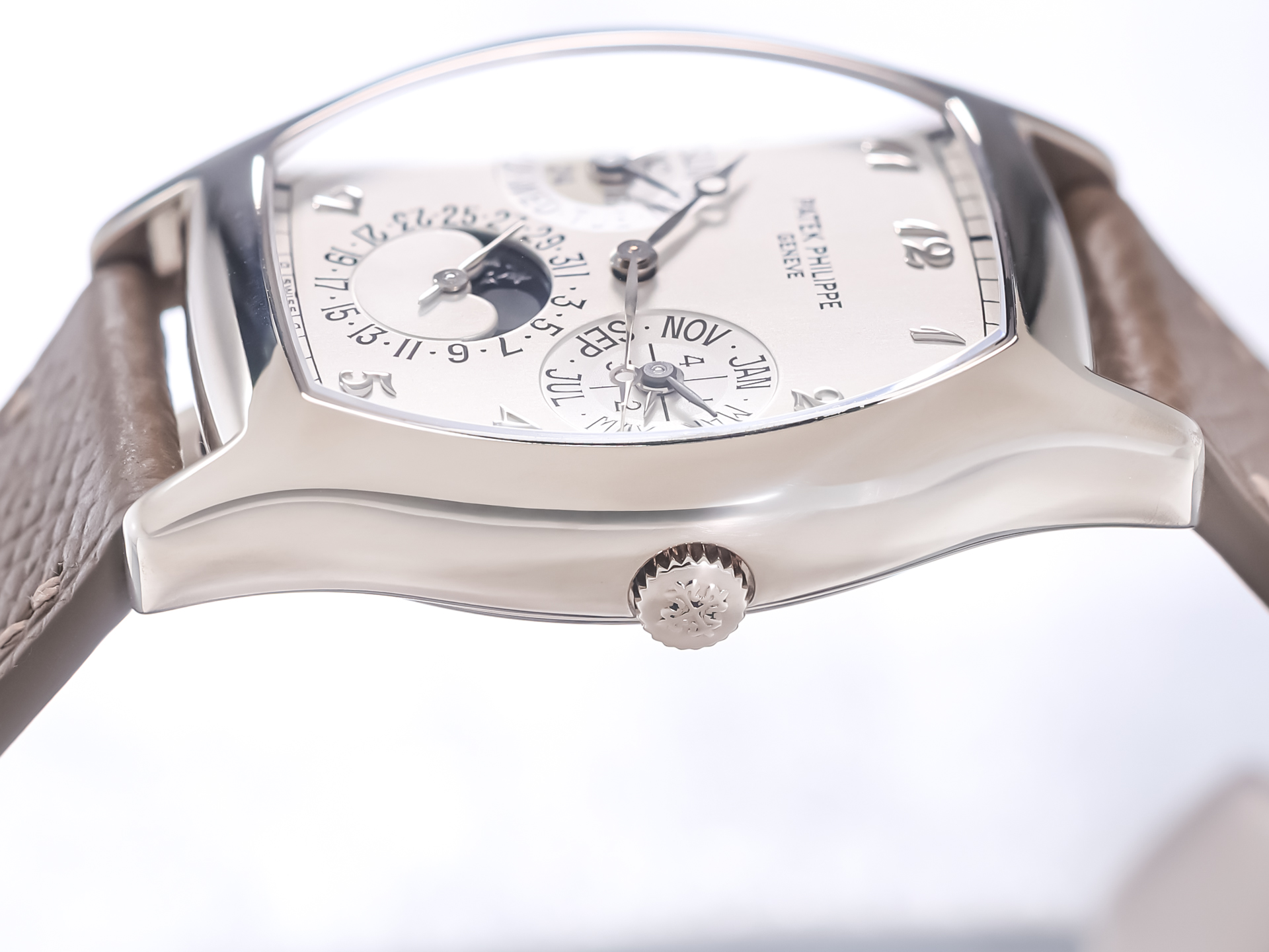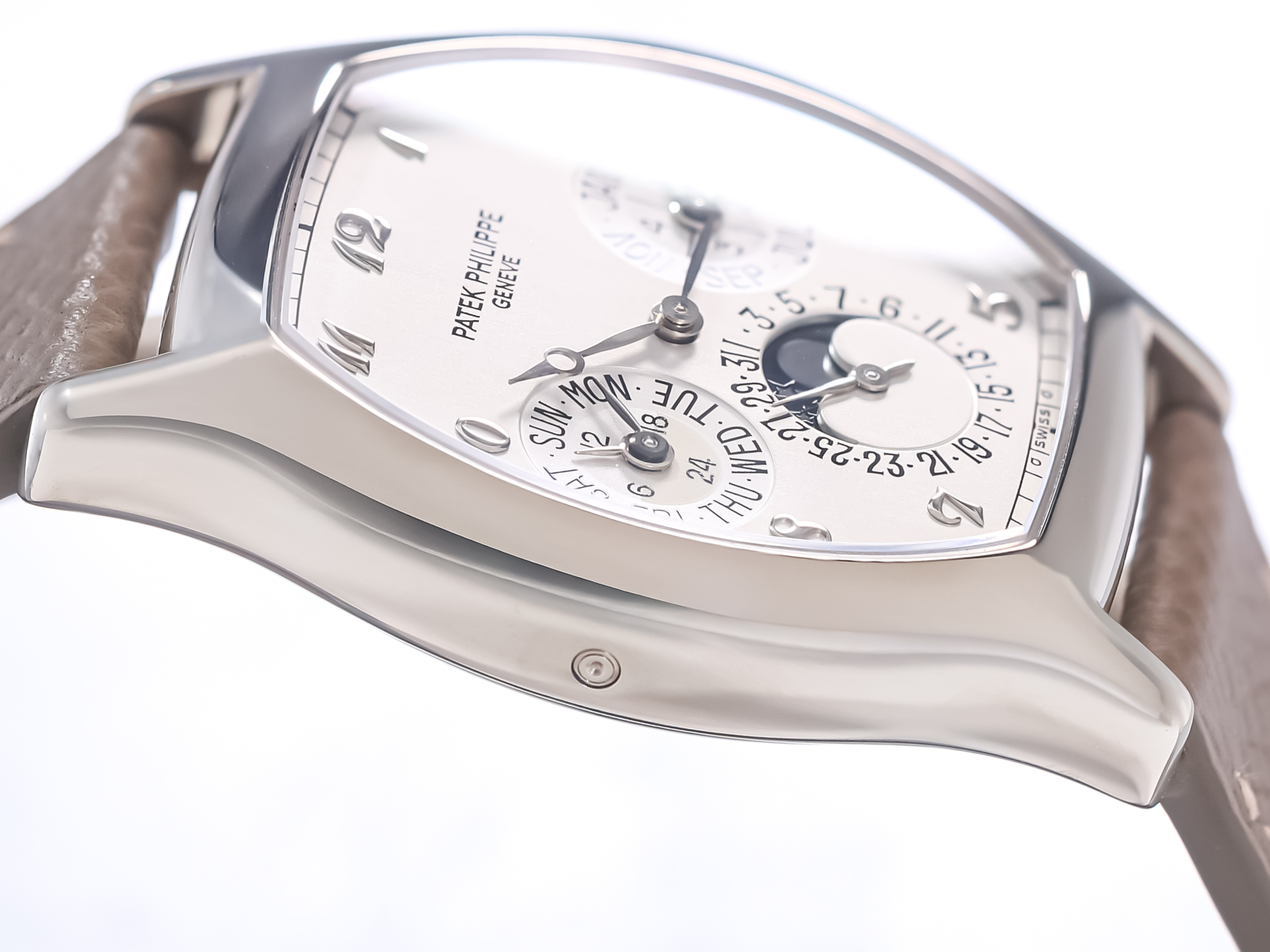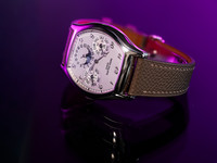 The elegant tonneau-shaped case in 18k white gold sets this reference apart from traditional round designs, reflecting a bold yet timeless aesthetic. Its curved profile and refined proportions ensure exceptional comfort on the wrist, while showcasing Patek Philippe’s mastery in case construction and finishing.
