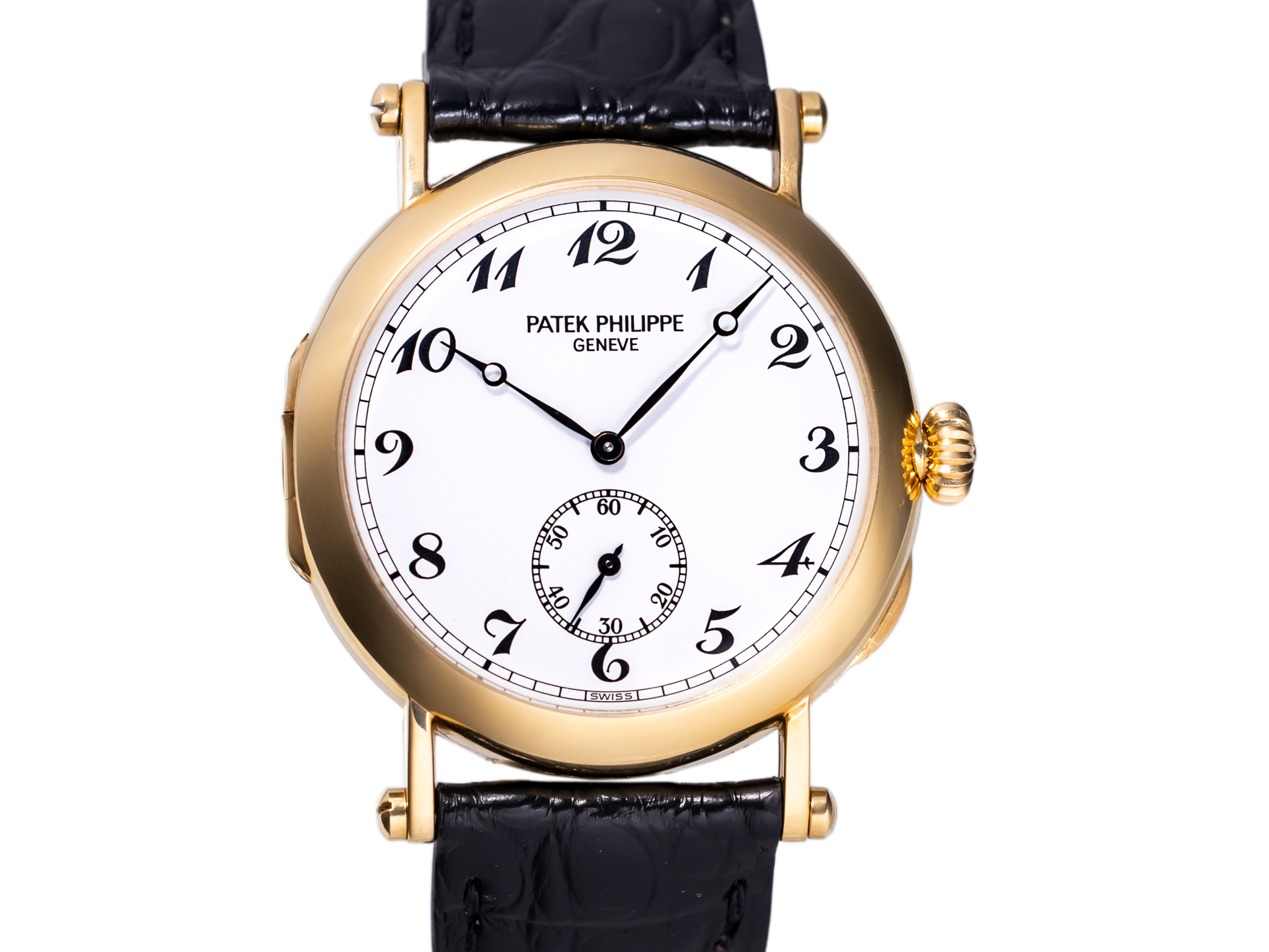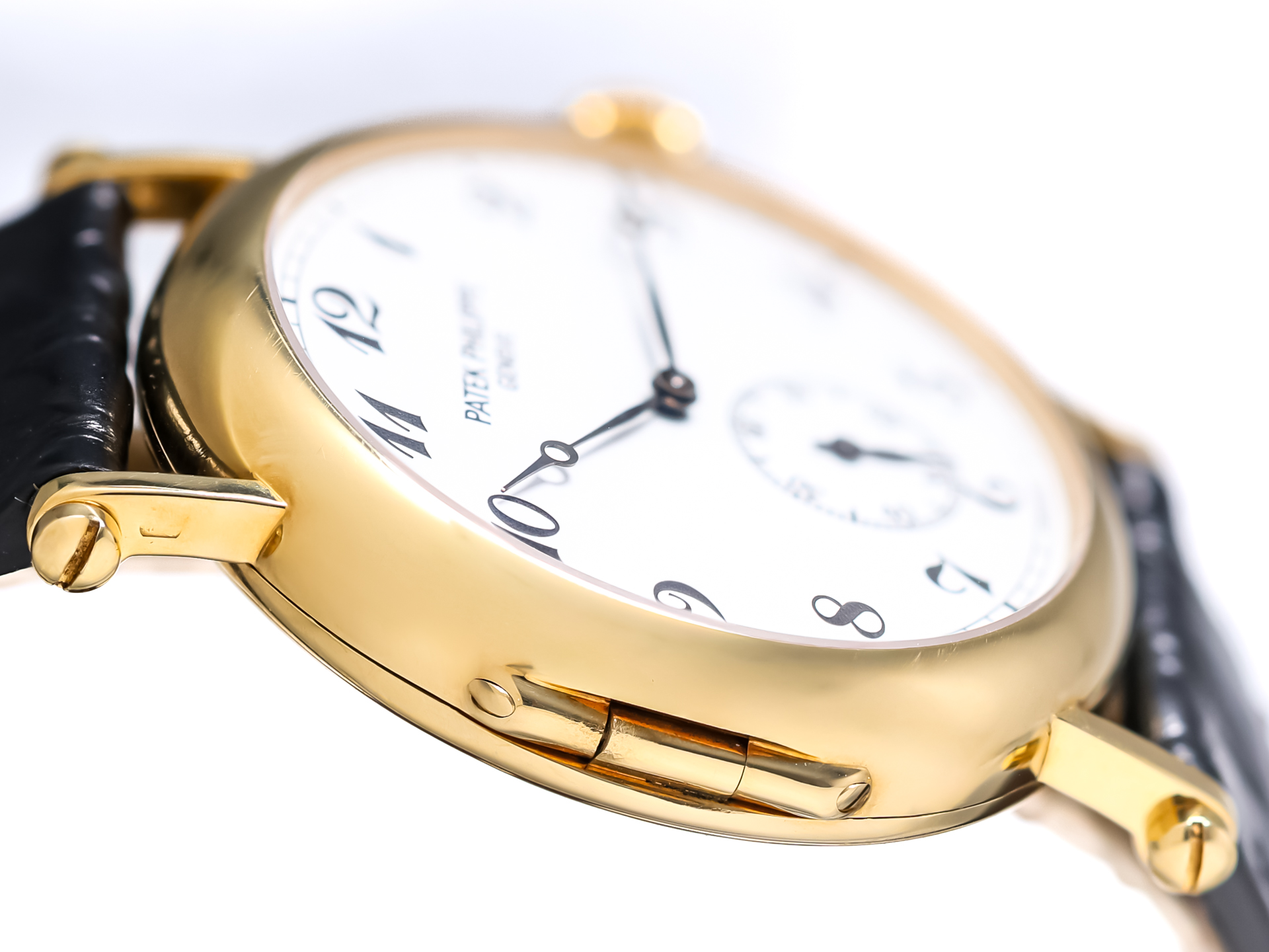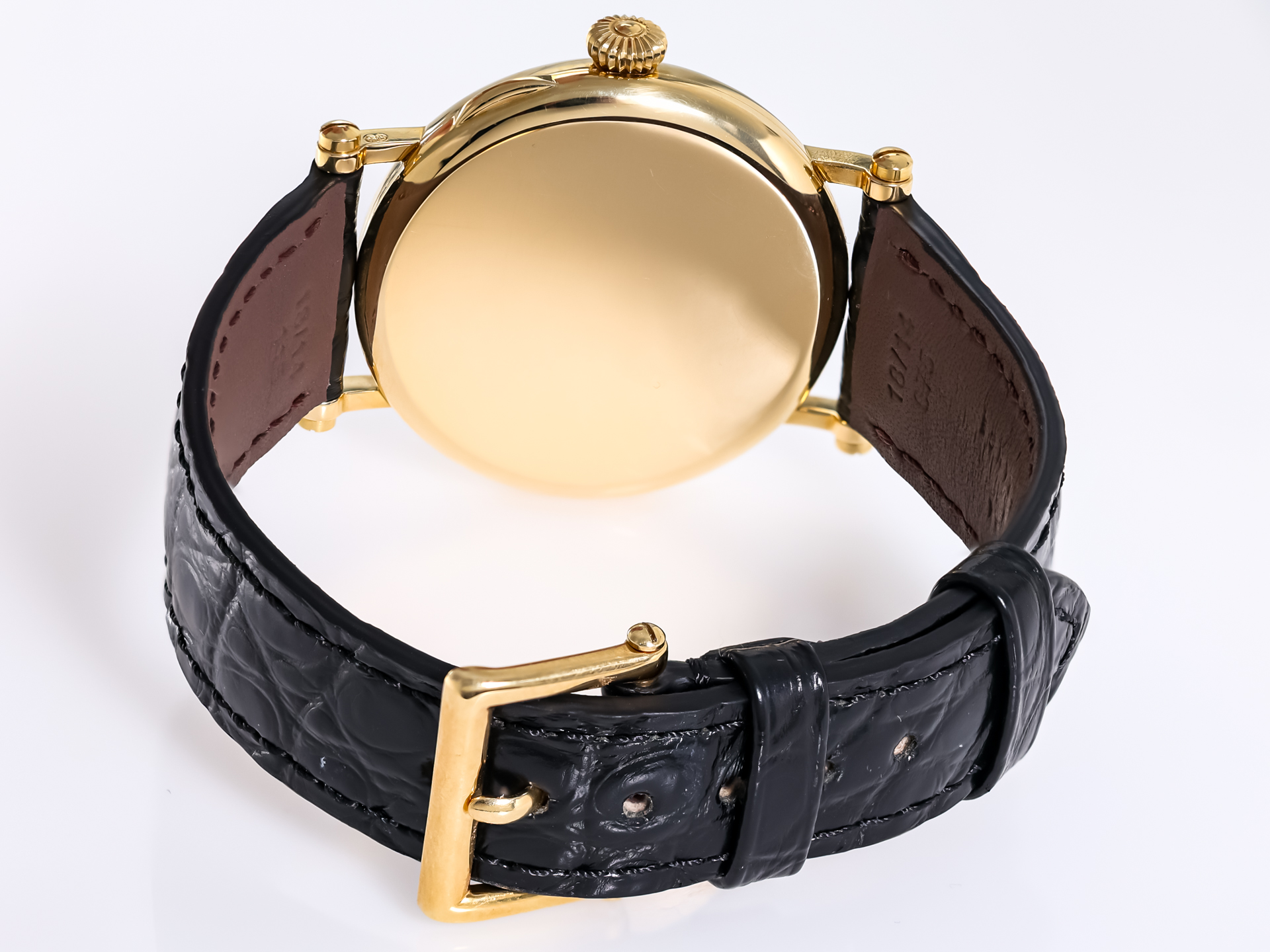 The refined Officer’s-style case in 18k yellow gold features elegant straight lugs and a beautifully hinged case back (engraved with the jubille date 1839-1989) that opens to reveal the movement—an homage to classic officer’s watches from the early 20th century. With its perfectly balanced 33 mm proportions, the watch embodies the understated elegance and timeless design philosophy that defines the Calatrava line.