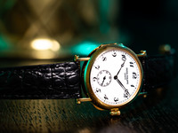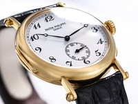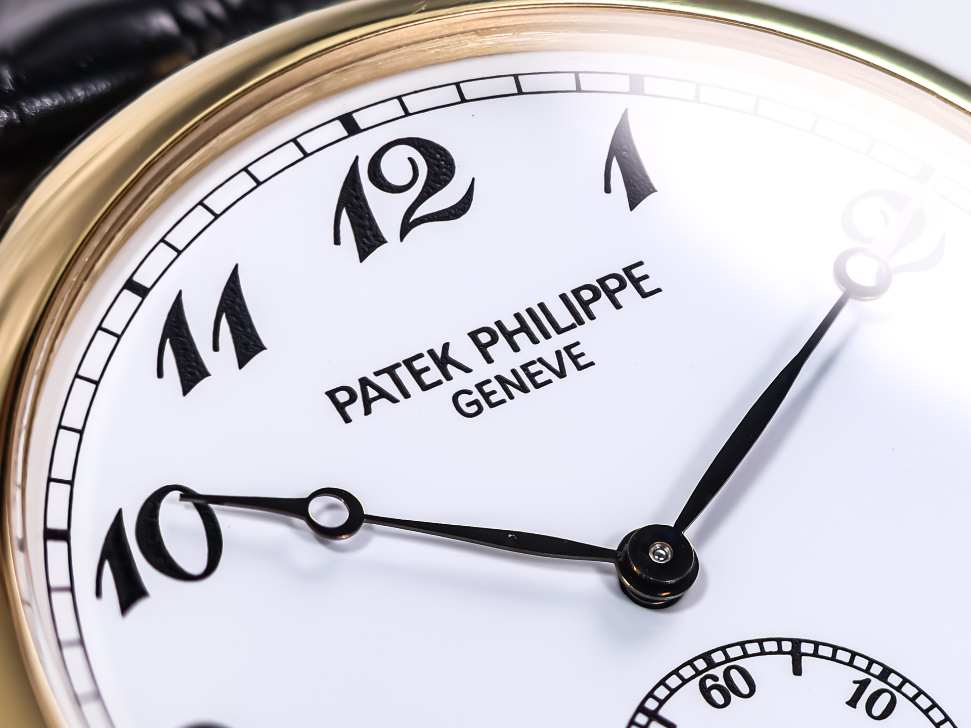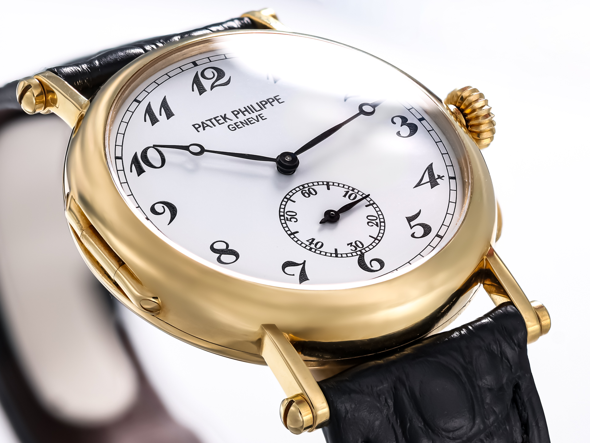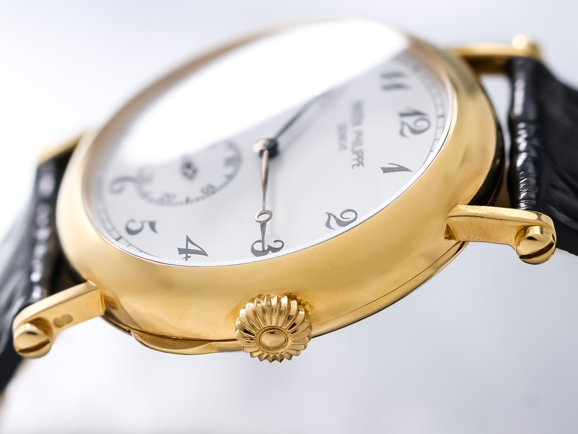 The refined Officer’s-style case in 18k yellow gold features elegant straight lugs and a beautifully hinged case back (engraved with the jubille date 1839-1989) that opens to reveal the movement—an homage to classic officer’s watches from the early 20th century. With its perfectly balanced 33 mm proportions, the watch embodies the understated elegance and timeless design philosophy that defines the Calatrava line.
