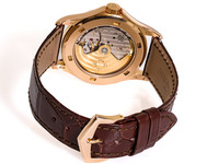 The case retains its elegant lines, including crown protection, highlighted by the smooth polished bezel and softly curved lugs. A sapphire crystal case back reveals the refined finishing of the movement within, a signature of Patek Philippe’s uncompromising standards.