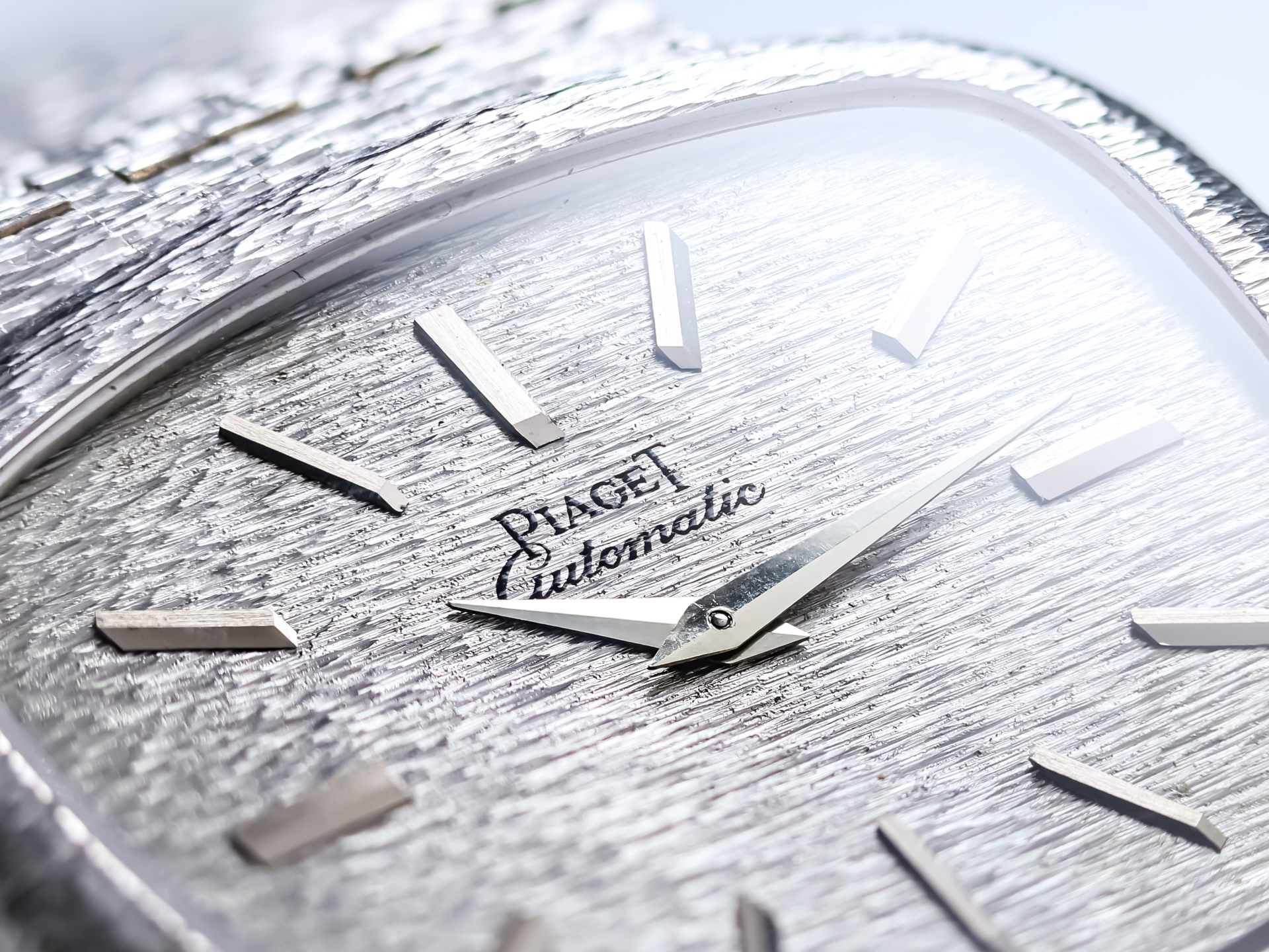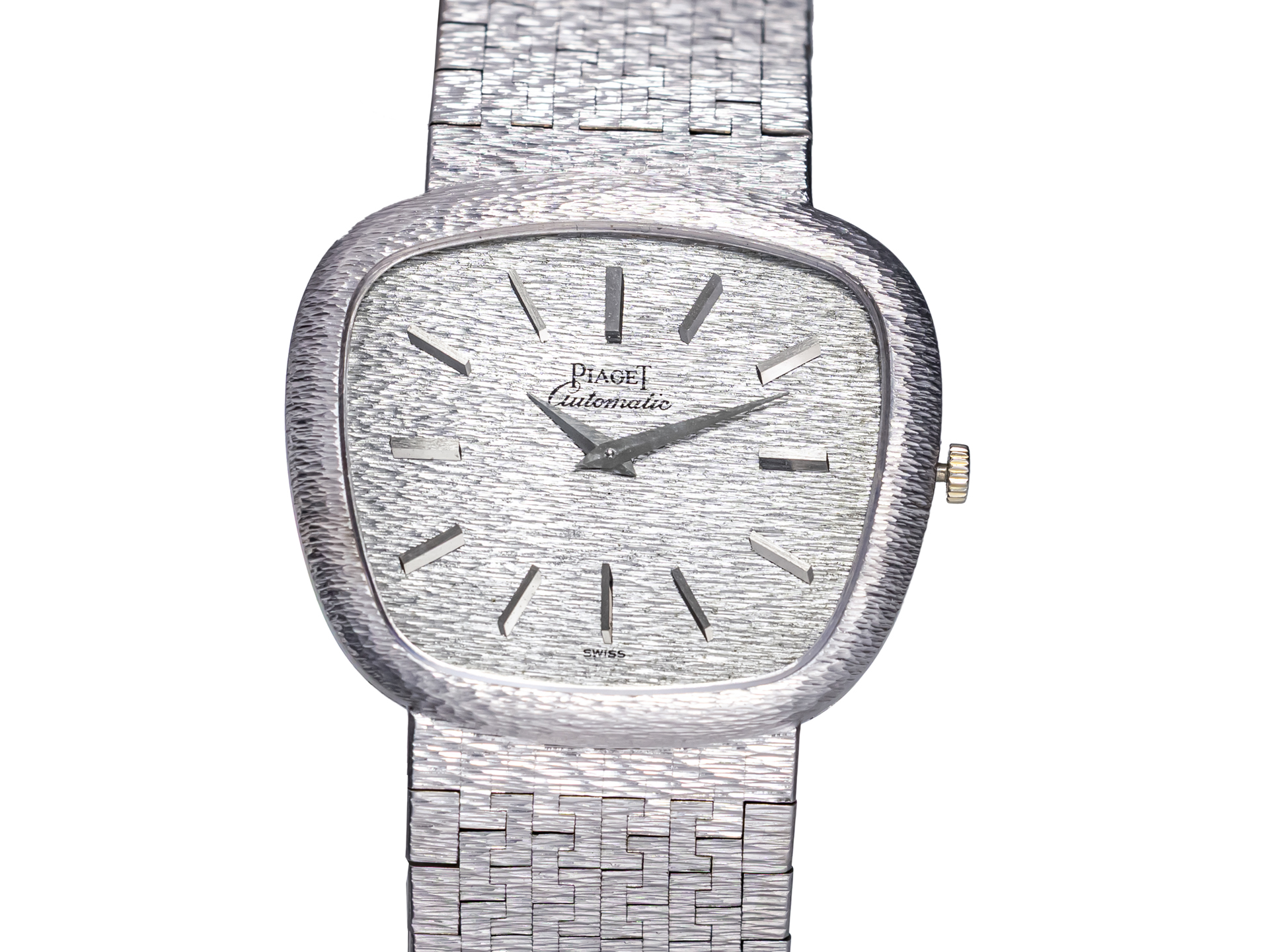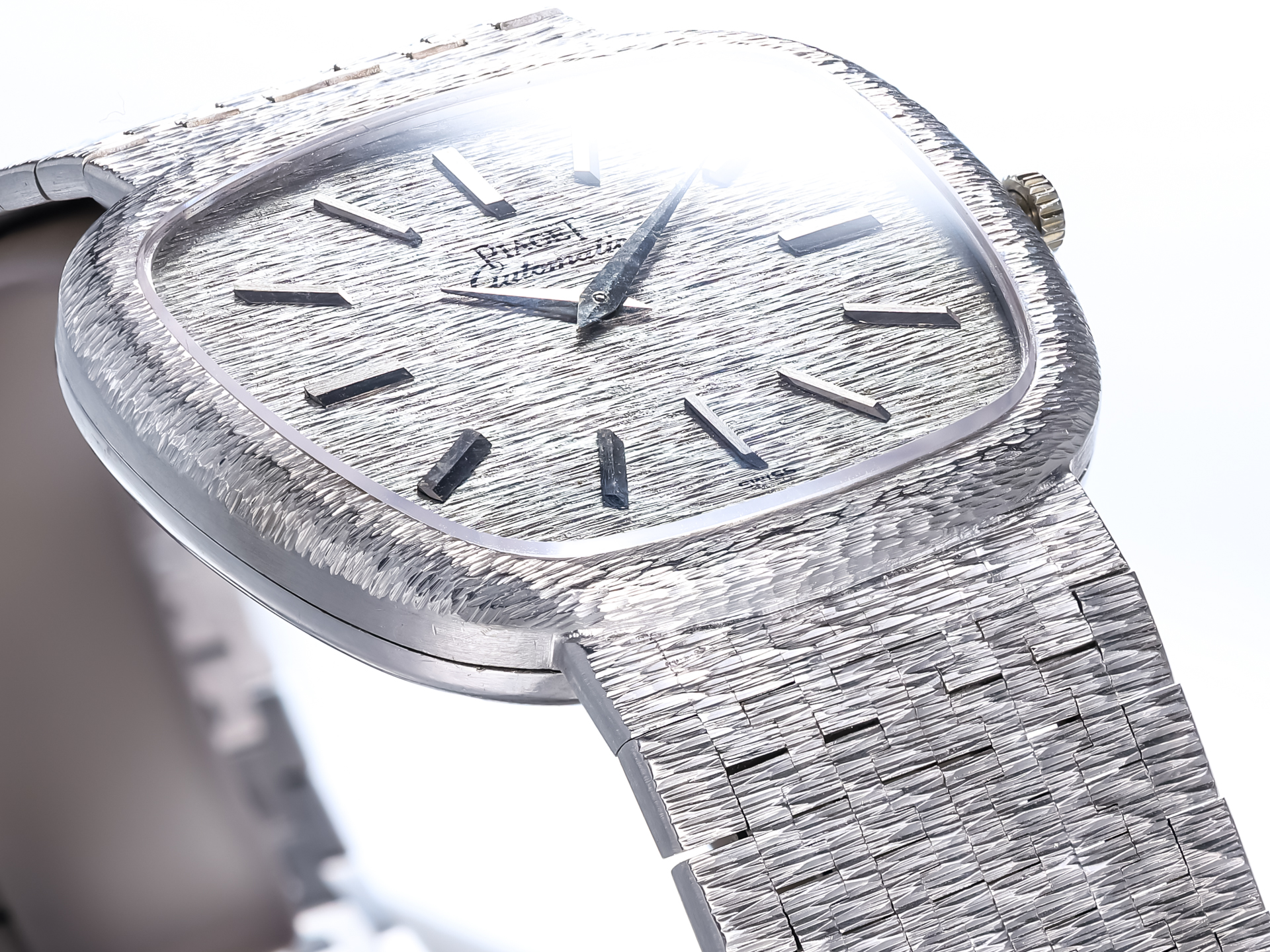 Piaget Vintage Trapeze Gentleman Automatic Ref. 13455A6 – 18k White Gold – Structured Milanese Bracelet & Dial – Box – 1971 – Very Rare – Mint