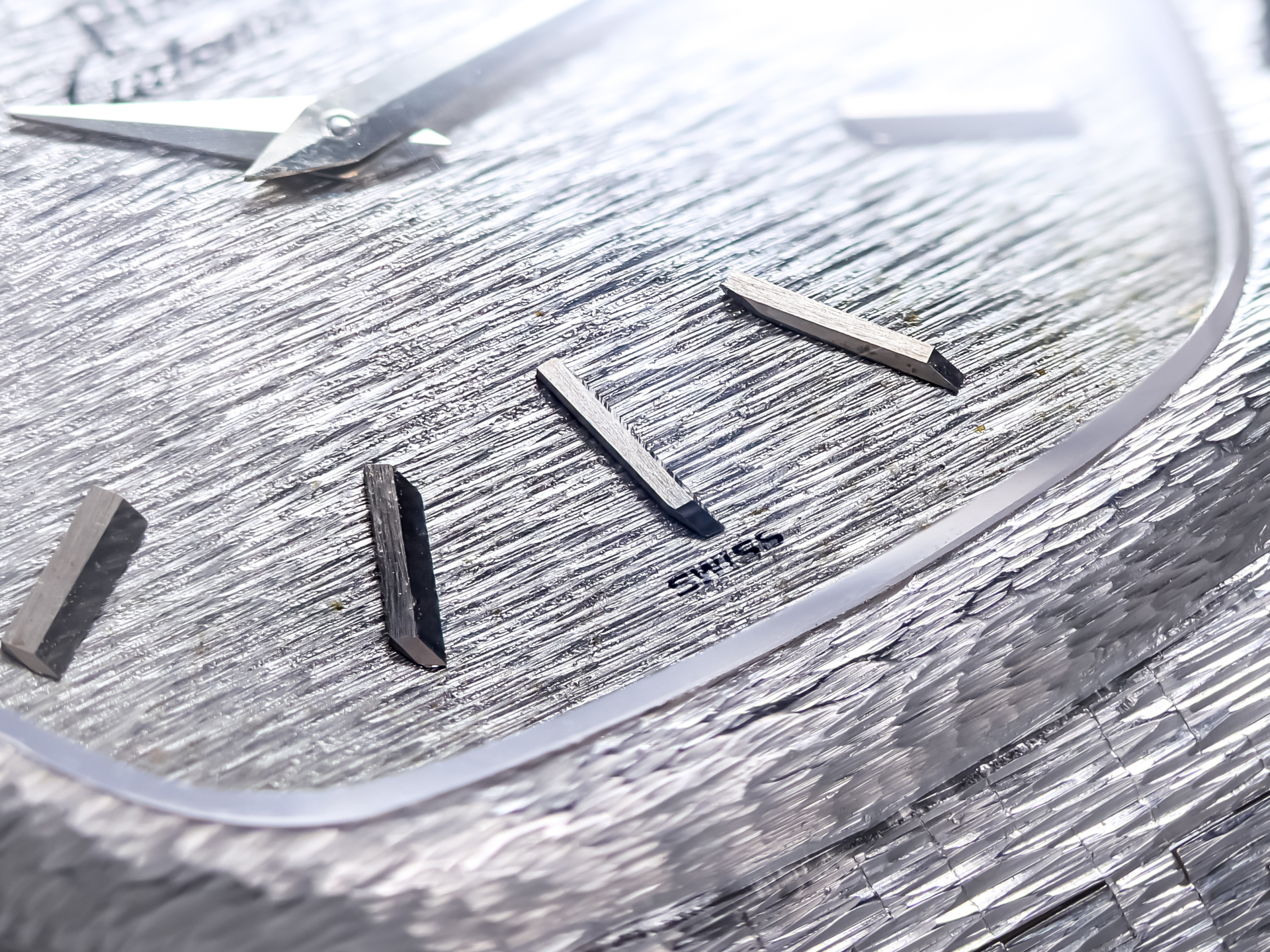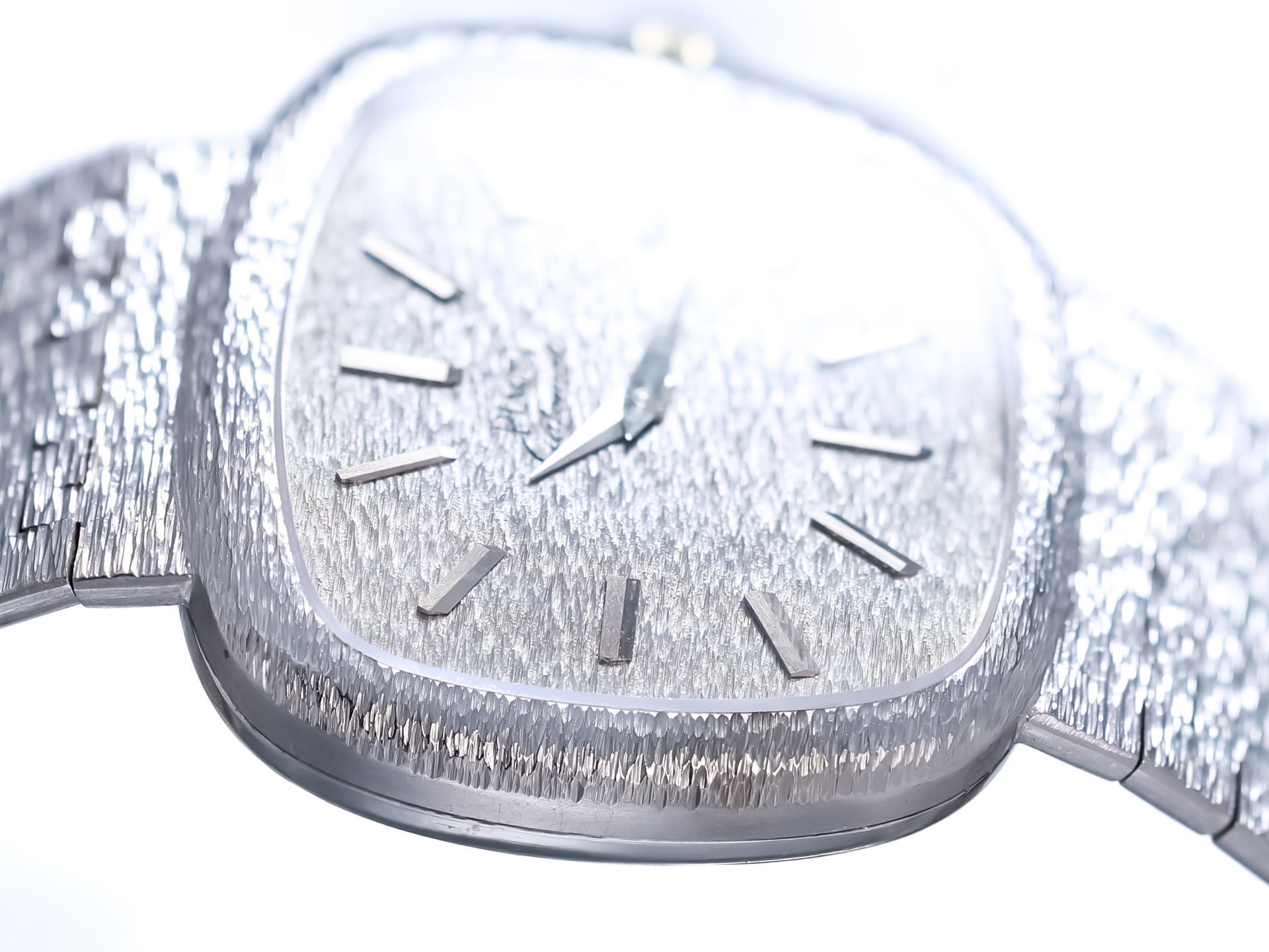 The perfect 18K solid white gold and hand engraved dial continues this cohesive artistic vision, featuring a matching textured finish that mirrors the bracelet’s structure. This rare and refined detail enhances the watch’s overall harmony, resulting in a striking yet understated appearance that rewards close appreciation.