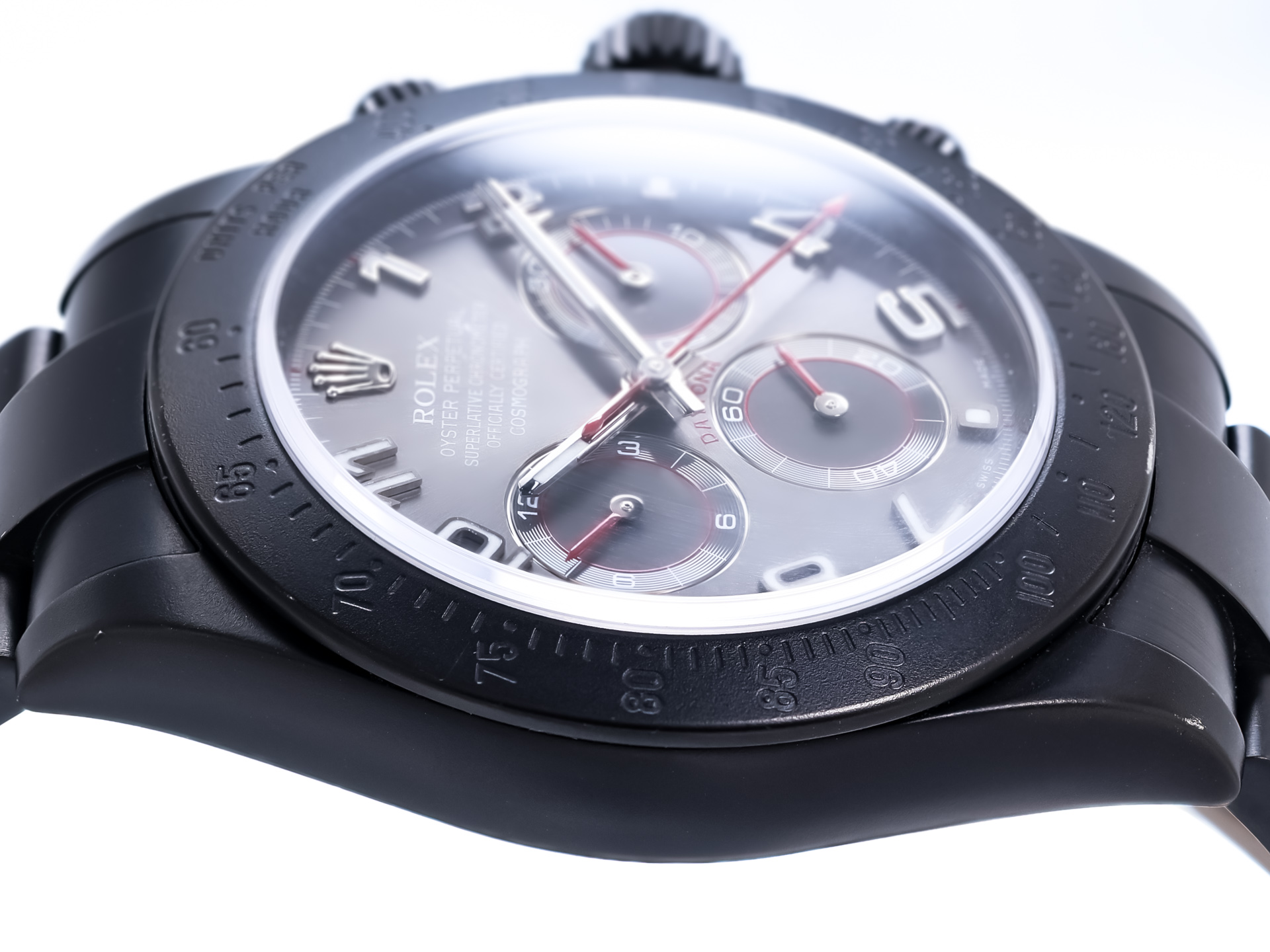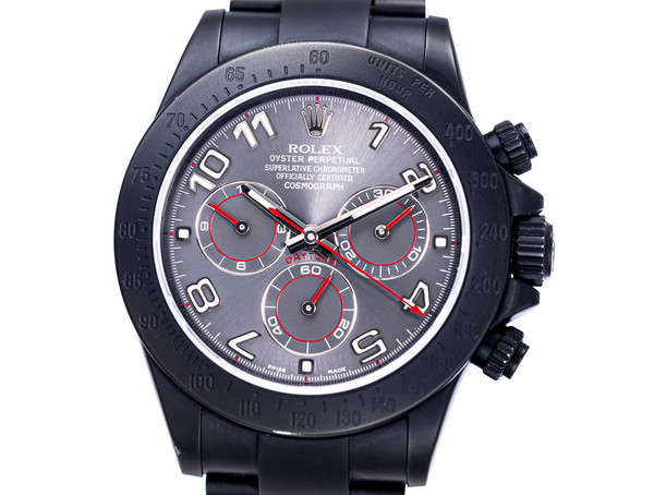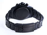 We are pleased to offer this striking and highly collectible Pro-Hunter Daytona Cosmograph “Stealth”, reference 116520, featuring a matte black DLC-coated stainless steel case and Oyster bracelet — a bold, covert reinterpretation of Rolex’s most legendary chronograph.