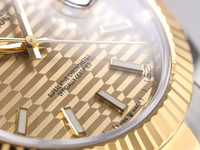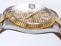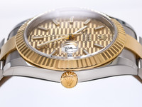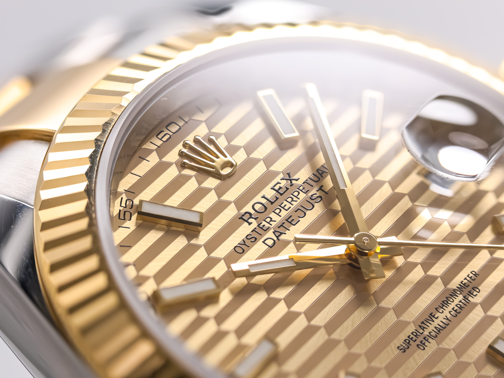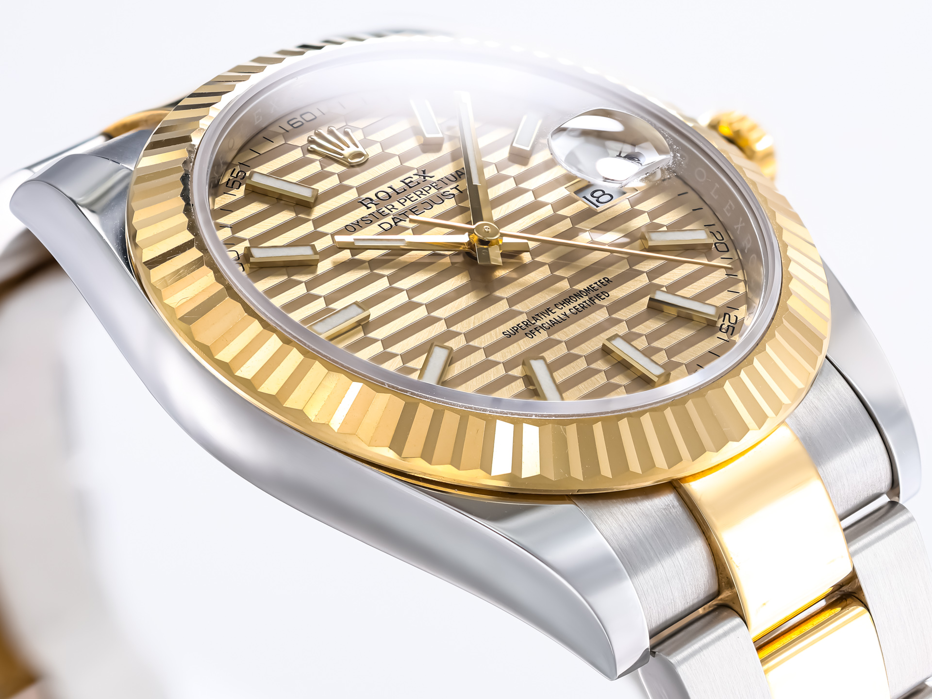 Measuring a versatile 41mm, the case is fitted with a solid yellow gold fluted bezel, radiating elegance and catching the light with every movement. The classic champagne fluted dial is adorned with applied gold hour markers and the instantly recognizable Cyclops magnifier at 3 o’clock, ensuring timeless legibility and charm.