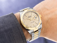 Fitted on the iconic two-tone Oyster bracelet with polished center links and an Easylink comfort extension system, this model balances everyday wearability with unmistakable prestige.