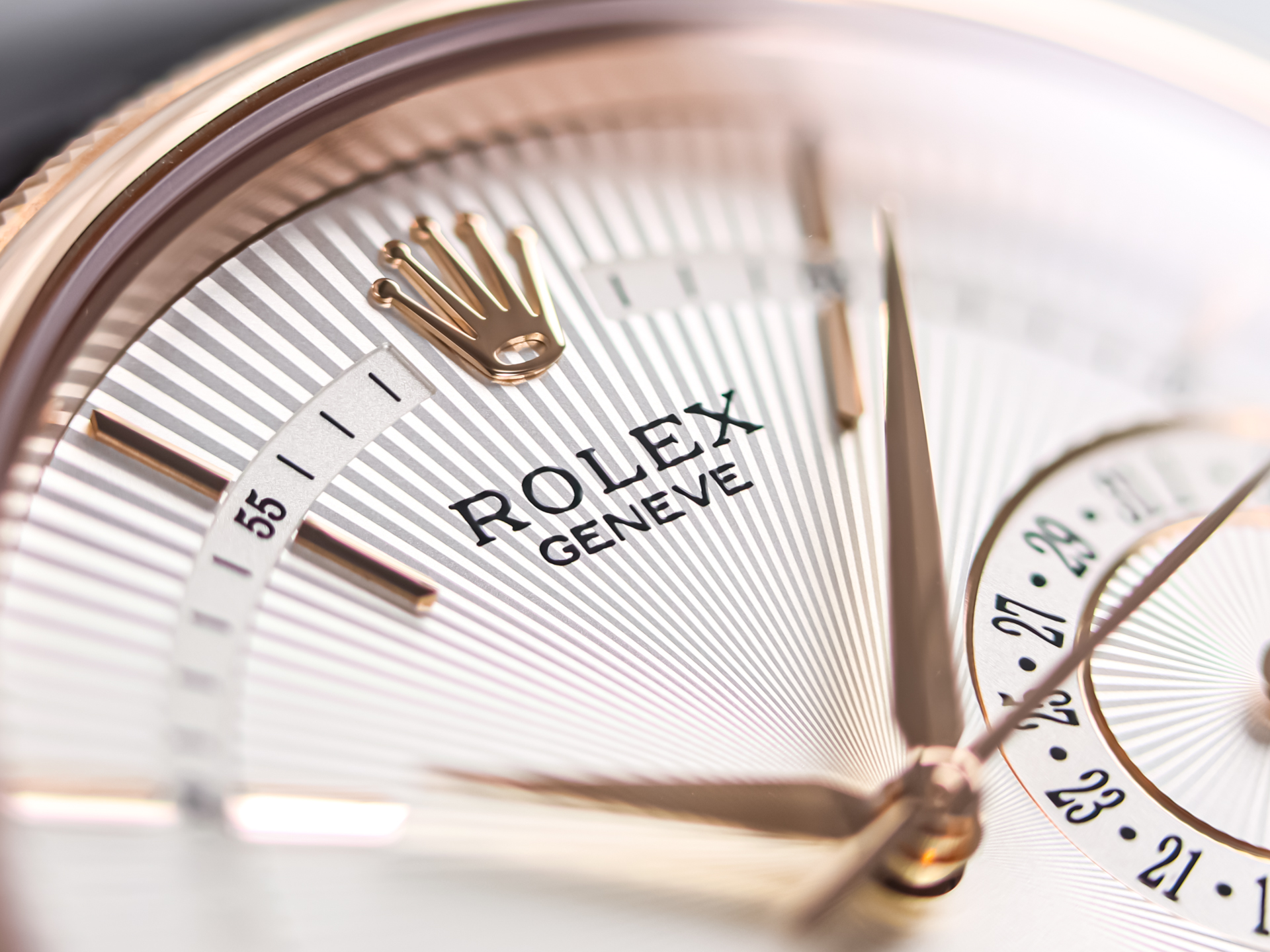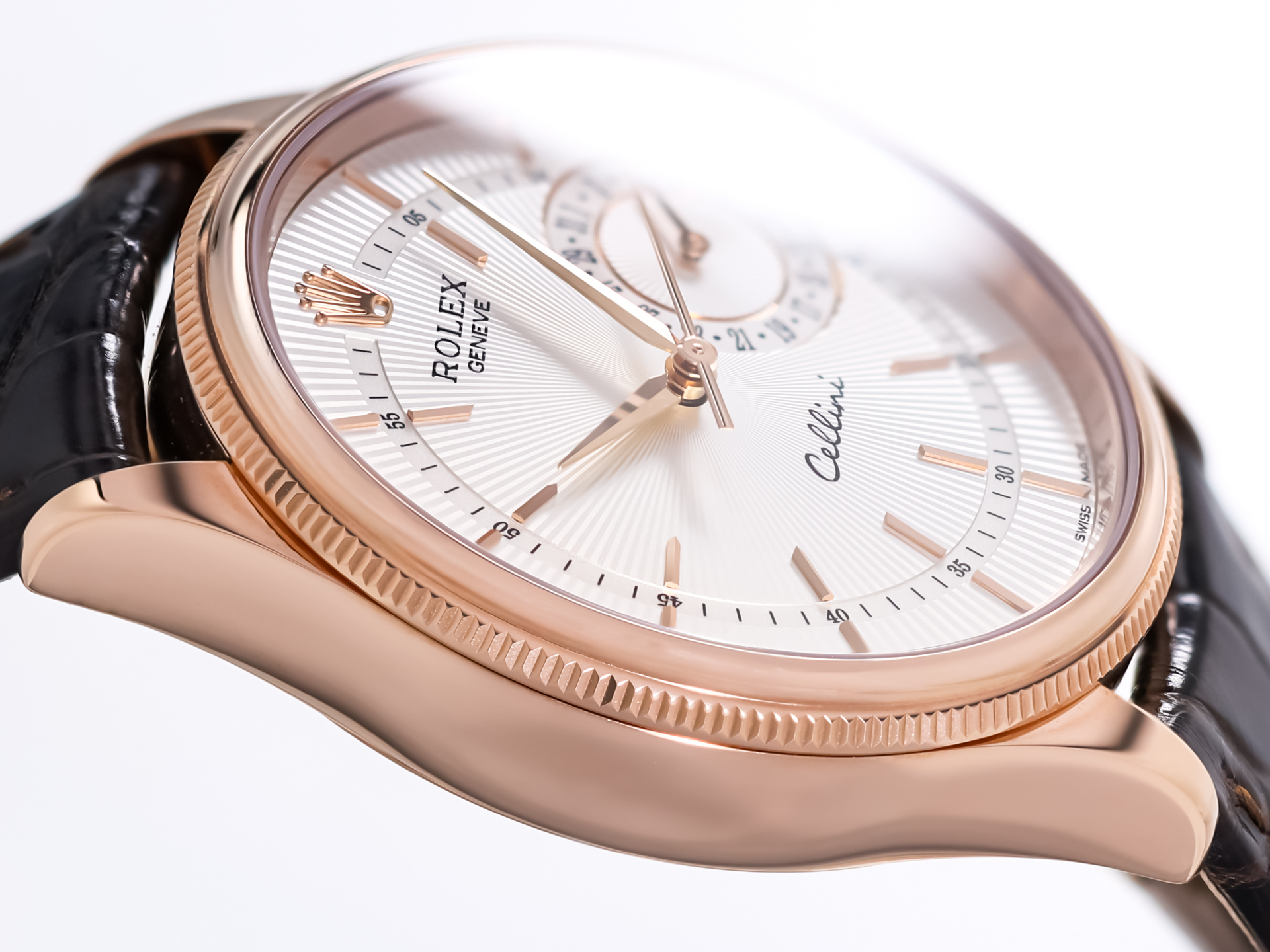 The elegant 39 mm case in Rolex’s proprietary Everose gold features the collection’s distinctive double bezel, combining a domed inner bezel with a finely fluted outer ring. This subtle yet refined design detail adds depth and character while maintaining the watch’s classic dress watch proportions.