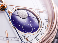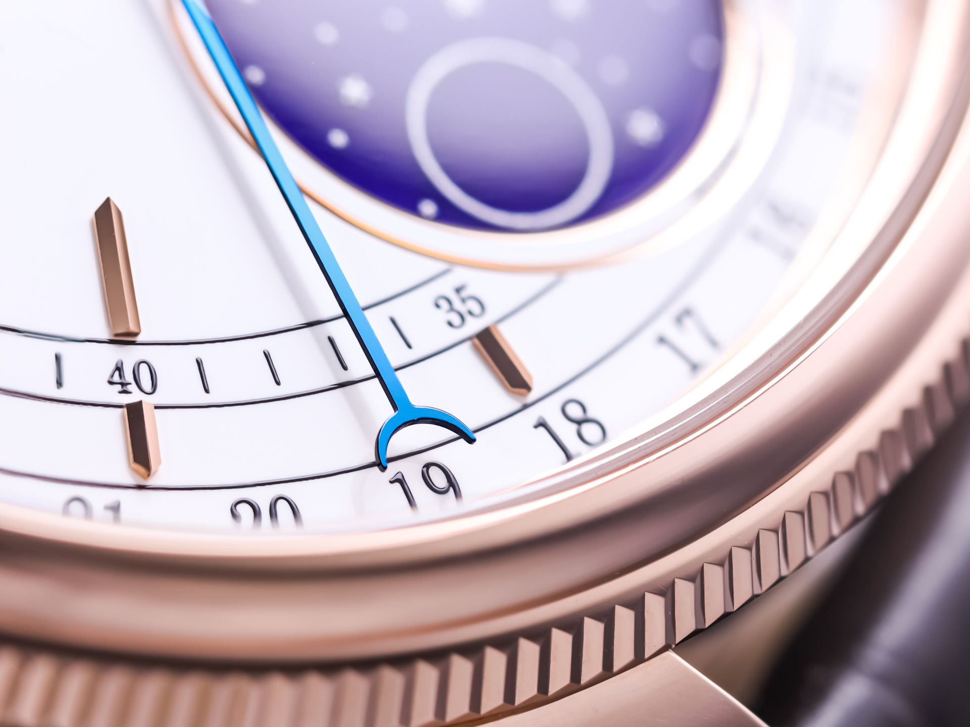 The lacquered white dial is both classic and expressive, featuring a striking moonphase display at 6 o’clock. The moonphase is rendered with a meteorite disc and a blue enamel sky, providing a rich contrast and a sense of depth rarely seen in modern Rolex designs. A date indication is displayed via a central hand pointing to a peripheral scale, enhancing both functionality and visual balance.