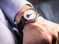 The watch is fitted with an elegant leather strap and an 18k Everose gold folding clasp, ensuring both comfort and security while maintaining its refined aesthetic.