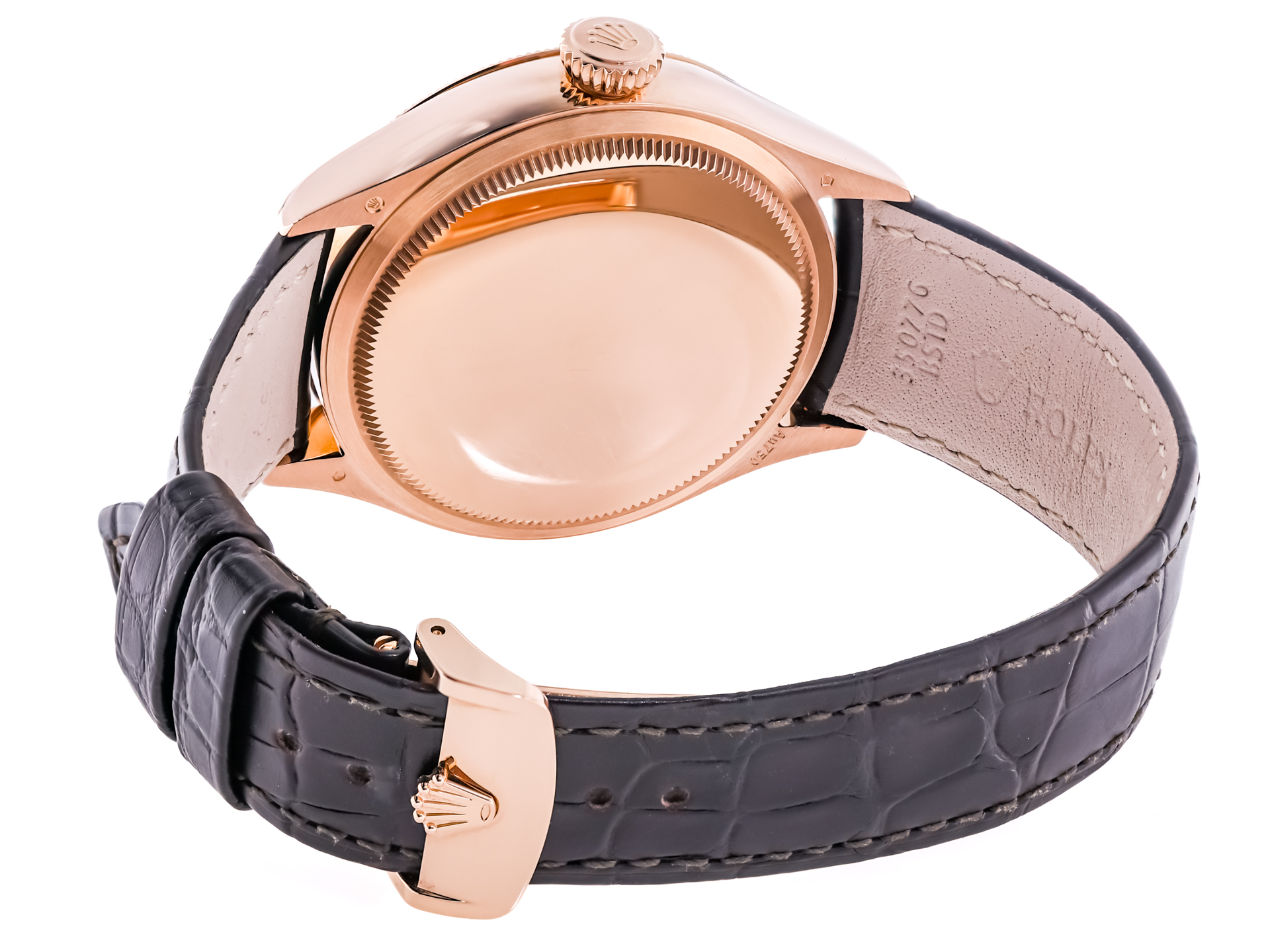 The 39 mm case is rendered in solid 18k Everose gold, Rolex’s proprietary rose gold alloy, offering a warm and luxurious presence on the wrist. Its slim, elegantly proportioned profile is complemented by the Cellini’s signature double bezel—one domed and one fluted—adding depth and subtle detail.
