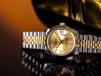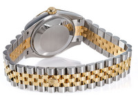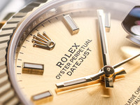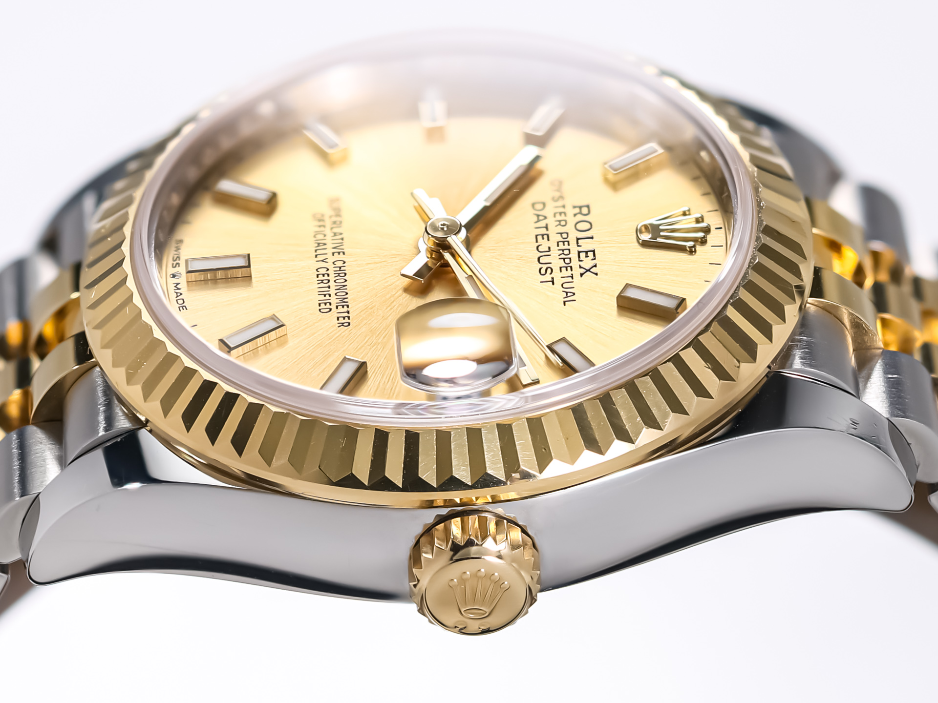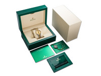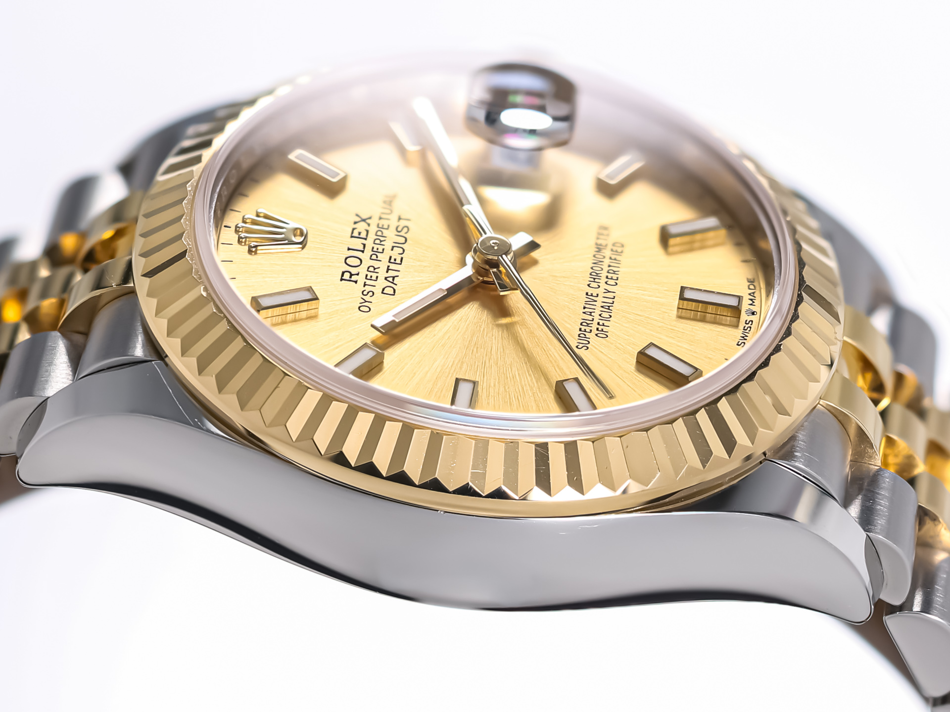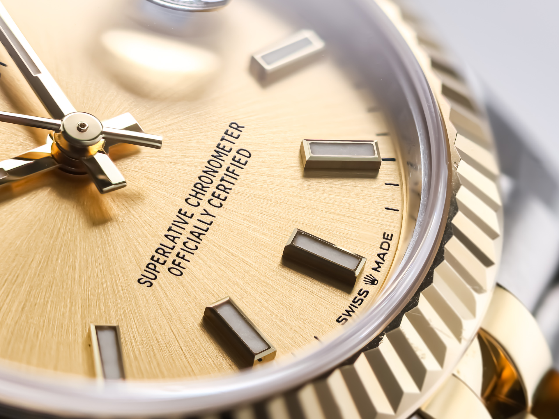 The dial is clean, legible, and refined — with applied hour markers (specify if diamond, Roman, or baton), gold hands, and the characteristic Cyclops lens over the date window at 3 o’clock.