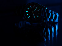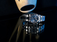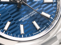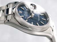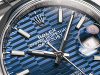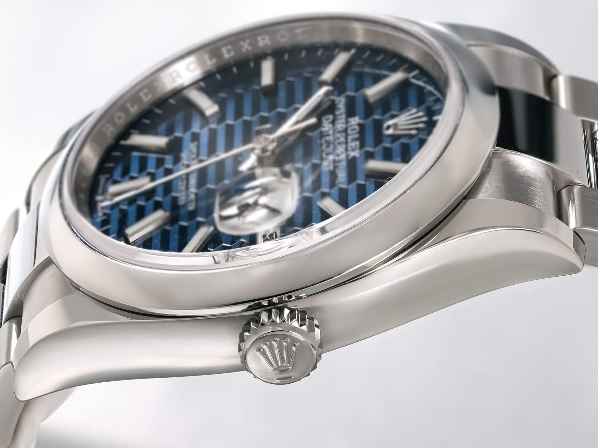 The standout feature of this watch is its striking blue motif dial, whose refined textured pattern adds depth and character while maintaining Rolex’s signature legibility. Applied baton hour markers filled with Chromalight and polished hands ensure excellent visibility in all conditions, preserving the Datejust’s reputation as the ultimate everyday luxury watch.