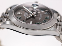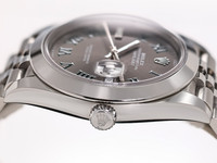 Crafted in Oystersteel, the 41mm case is fitted with a smooth polished bezel, giving the watch a contemporary yet refined profile. The standout feature is the distinctive slate grey dial, accented by green-outlined Roman numerals, a color combination affectionately known among collectors as the “Wimbledon” — in homage to Rolex’s long-standing partnership with the legendary tennis tournament.