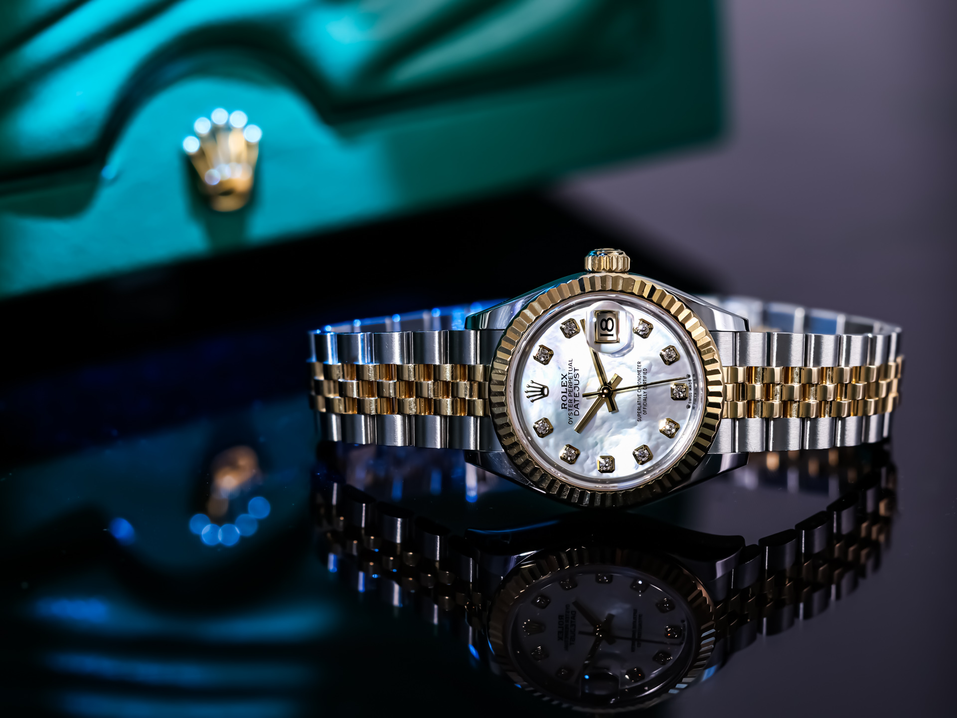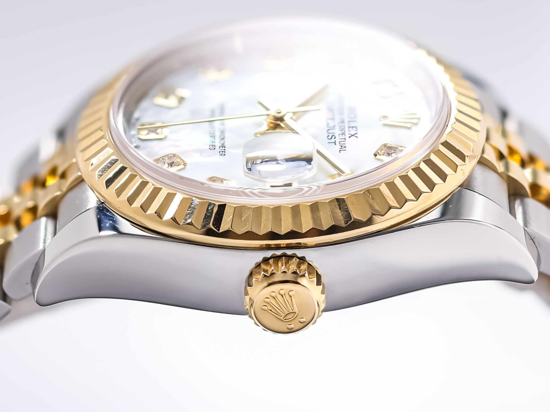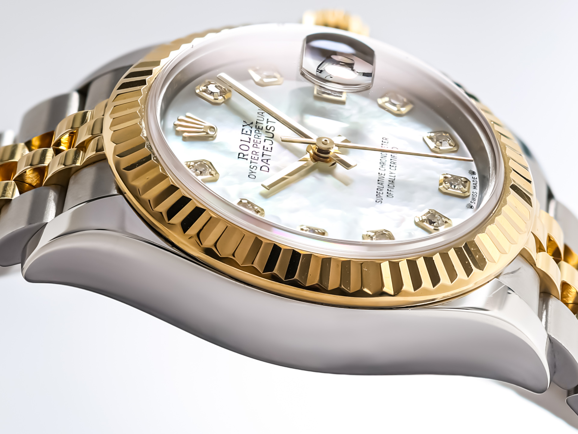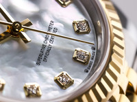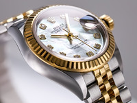 This model effortlessly combines classic Rolex design with a touch of opulence, featuring a stunning mother-of-pearl dial with diamond hour markers, making it a standout piece for any occasion.