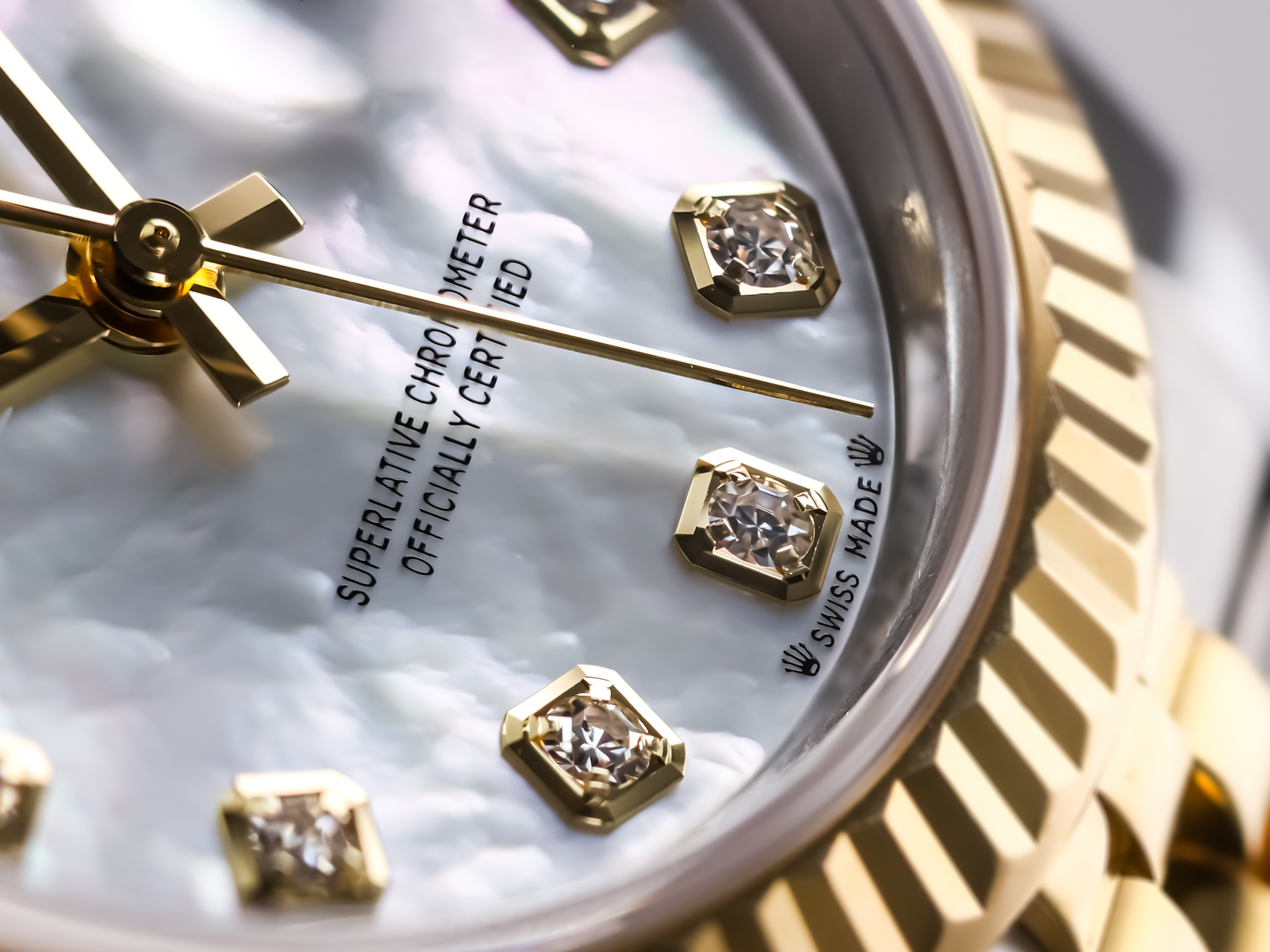 At the heart of this Datejust is a captivating mother-of-pearl dial—a delicate and iridescent surface that subtly shifts in color with every movement. The natural variations in the pearl’s texture give each watch a unique, one-of-a-kind appeal. Complementing this already luxurious dial are diamond hour markers, adding a brilliant sparkle to the watch’s refined aesthetic. These diamonds enhance the dial’s elegance, providing an elevated and glamorous touch.