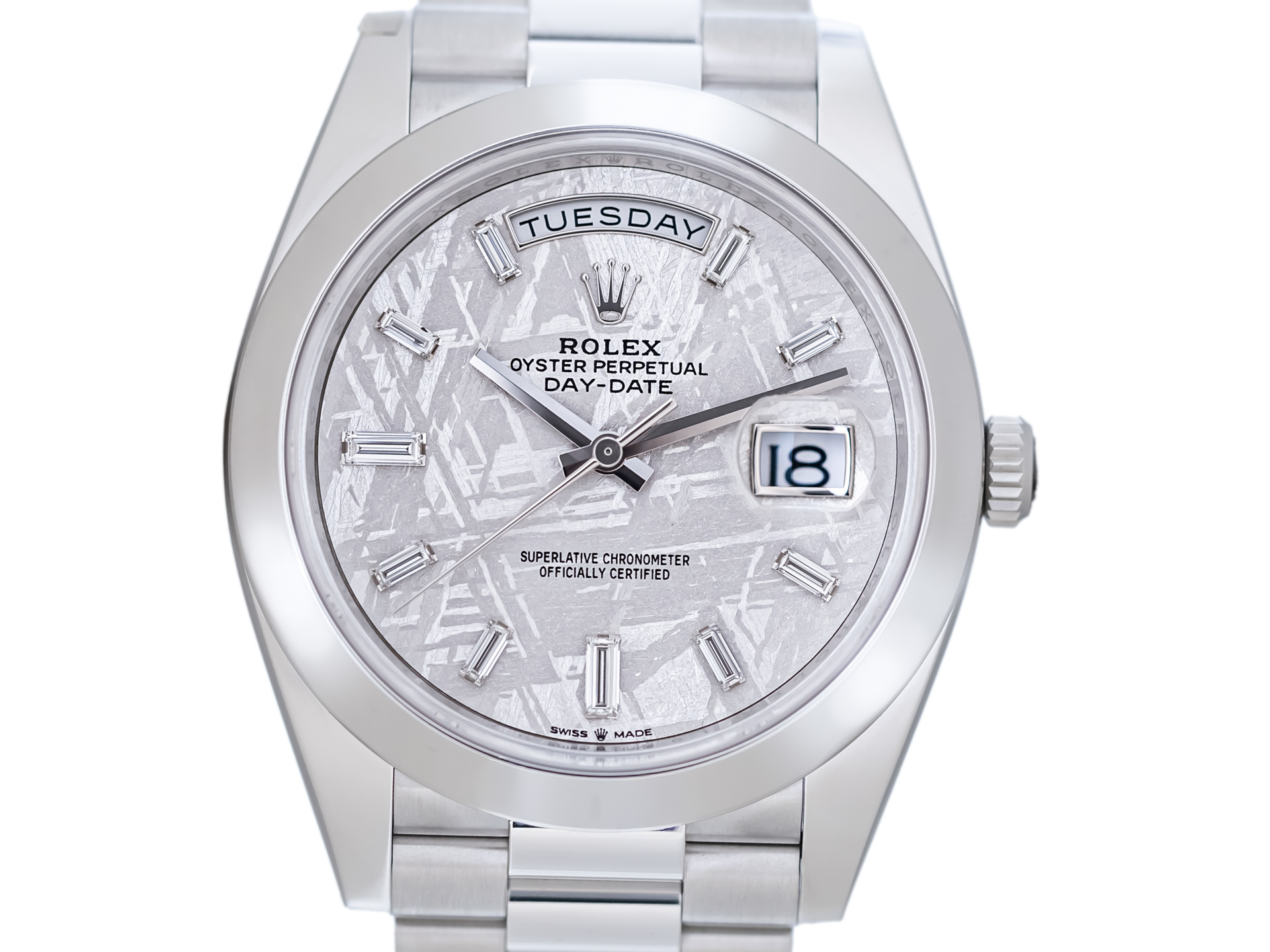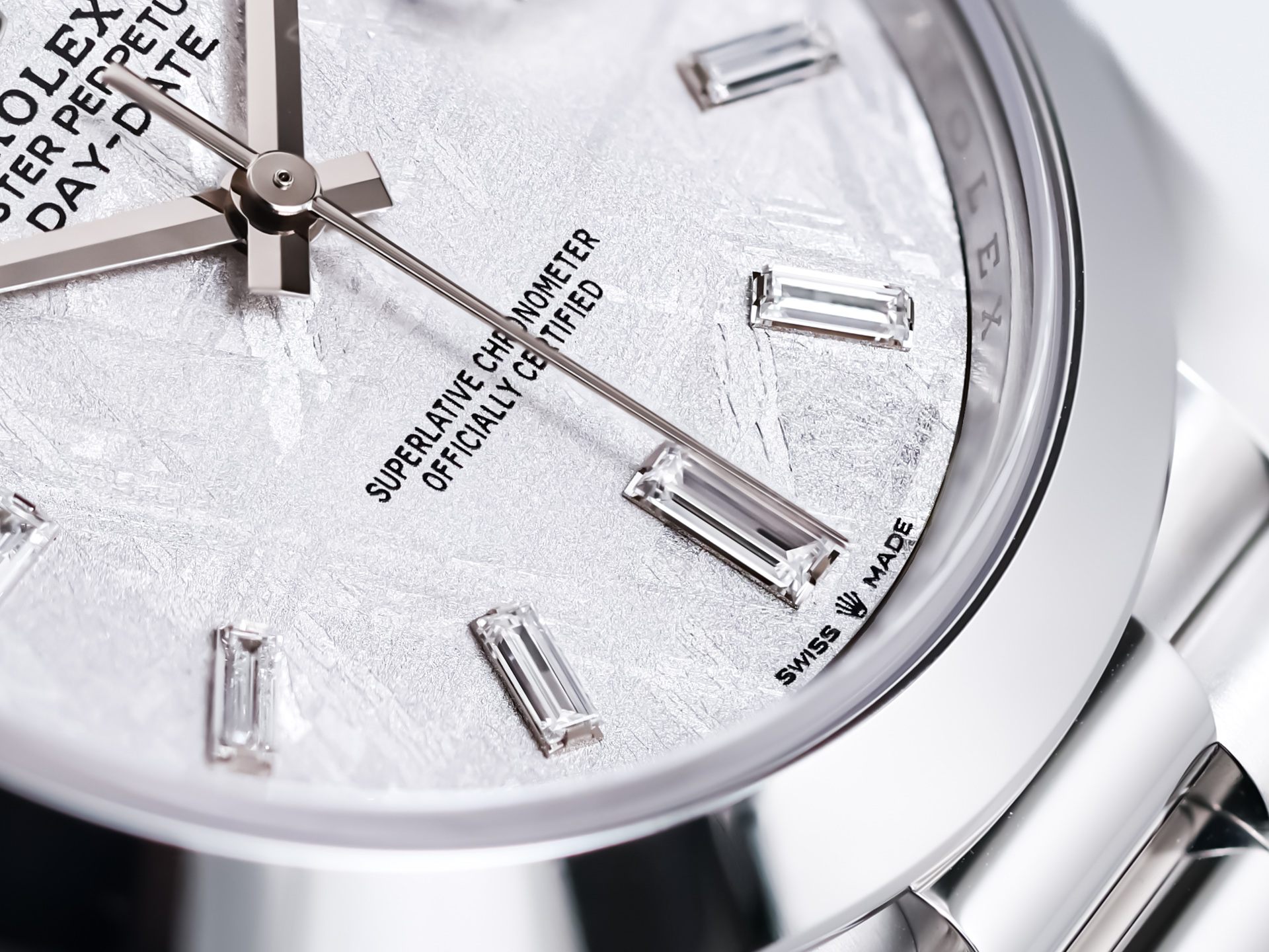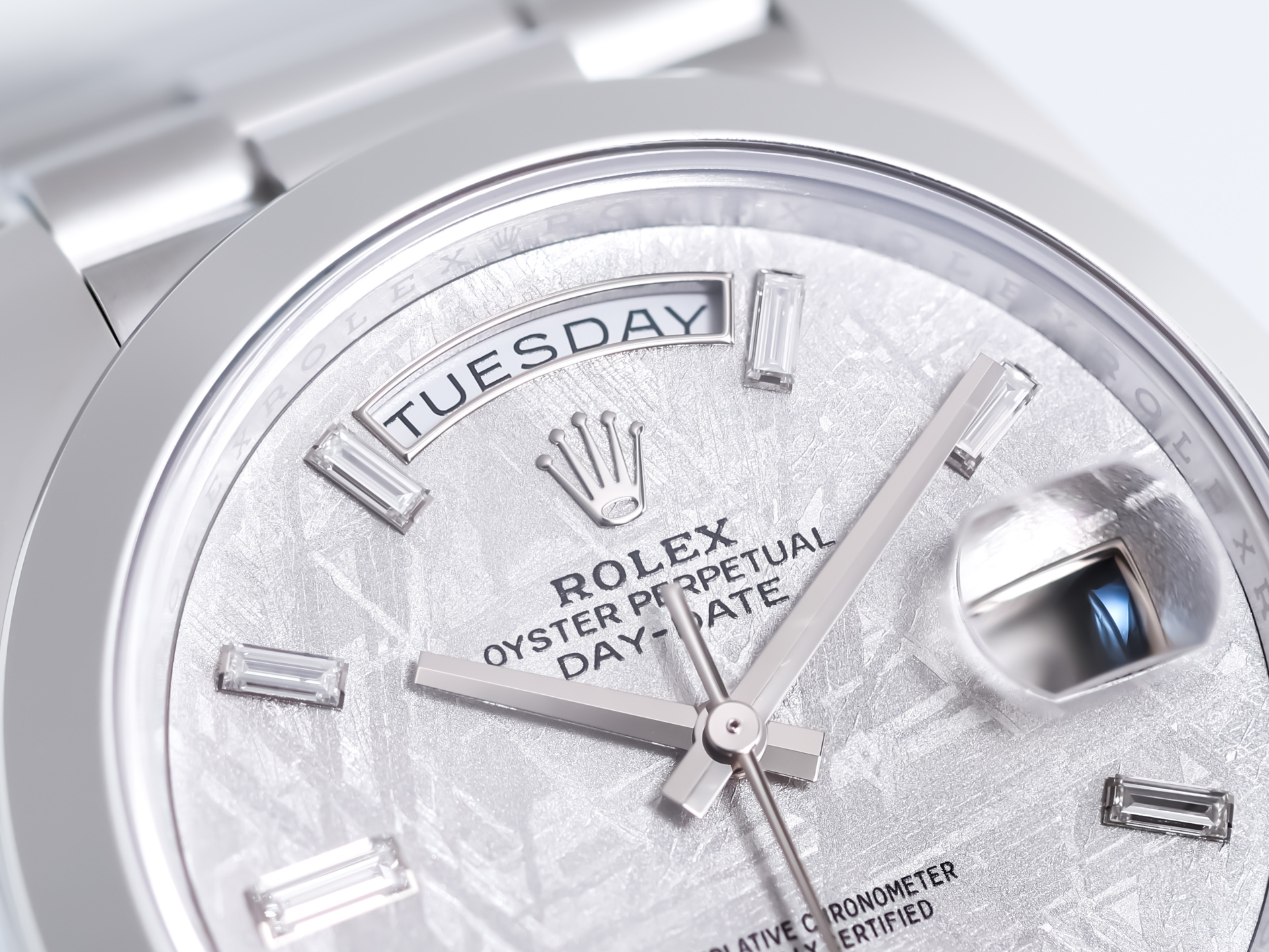 Boasting a striking flat bezel and a rare meteorite dial adorned with diamond baguette hour markers, this model exemplifies elegance and exclusivity. Now discontinued, the reference 228206 has become highly sought after by collectors and connoisseurs alike.