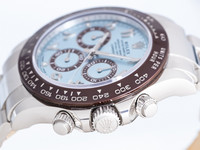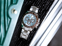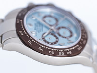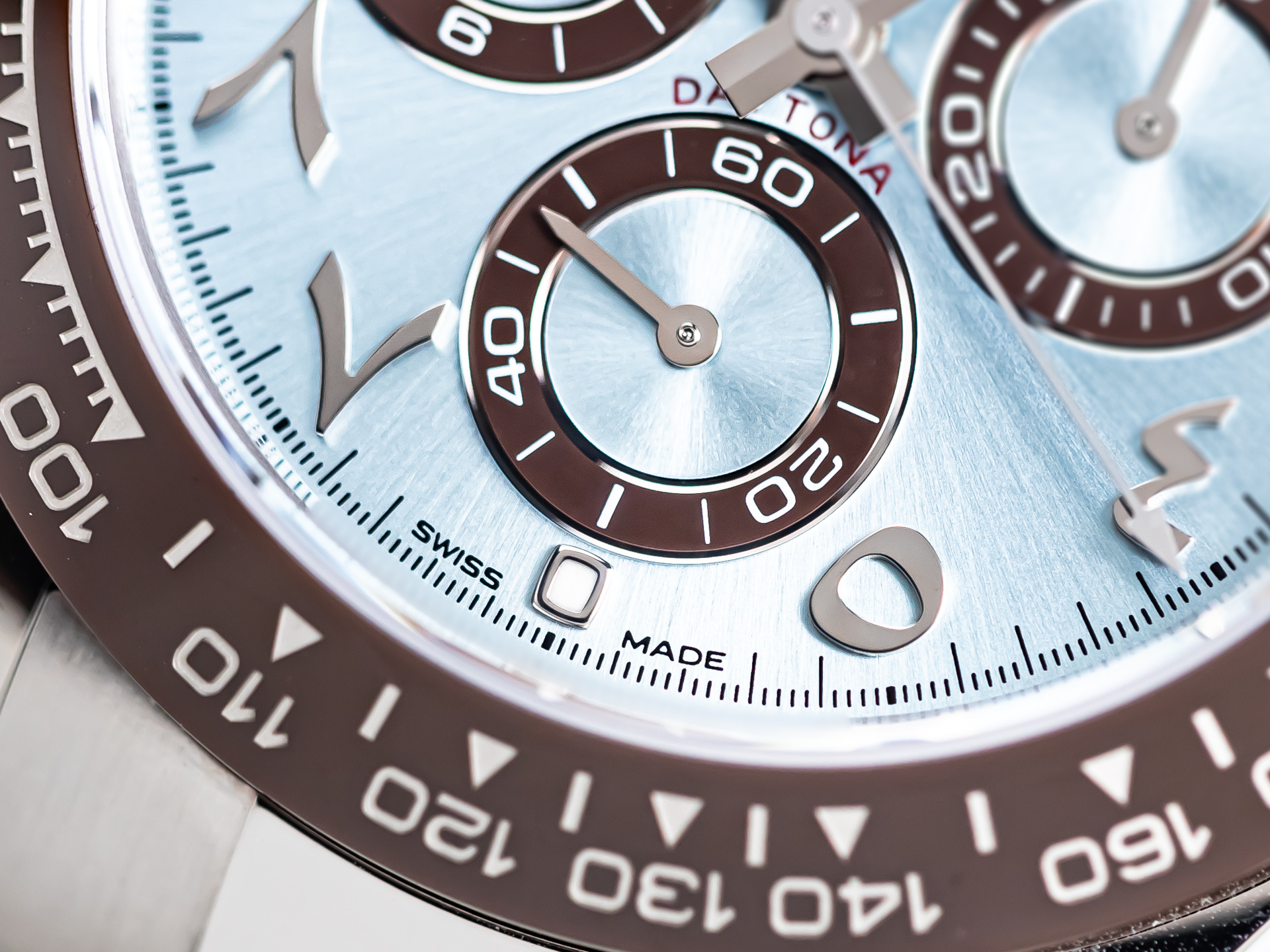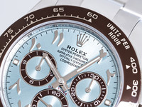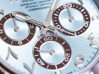 The ice blue dial is both iconic and refined — its sunray finish shifting in tone with the light. The contrasting brown subdials and matching Arabic numerals give this piece a unique, contemporary edge, while the red “Daytona” signature pays tribute to its racing pedigree.