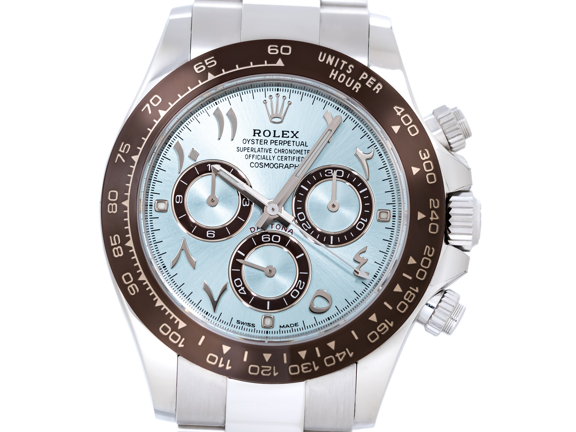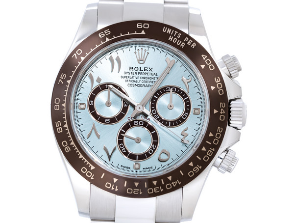 “A bold statement in precious metal, performance, and exclusivity — the Platinum Daytona with Arabic dial is a collector’s grail, combining Rolex’s most advanced chronograph technology with one of its most desirable and distinguished configurations.”
