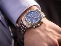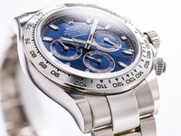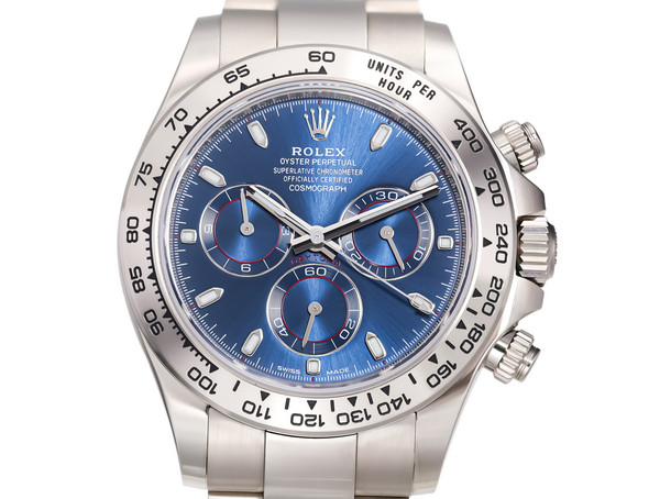 The vivid blue dial is the defining feature of this reference, providing a bold yet elegant contrast against the white gold case. The sunburst finish enhances depth and light play, while the applied hour markers and chronograph subdials maintain excellent legibility and visual harmony. This configuration is widely appreciated for its versatility, combining sportiness with refined aesthetics.