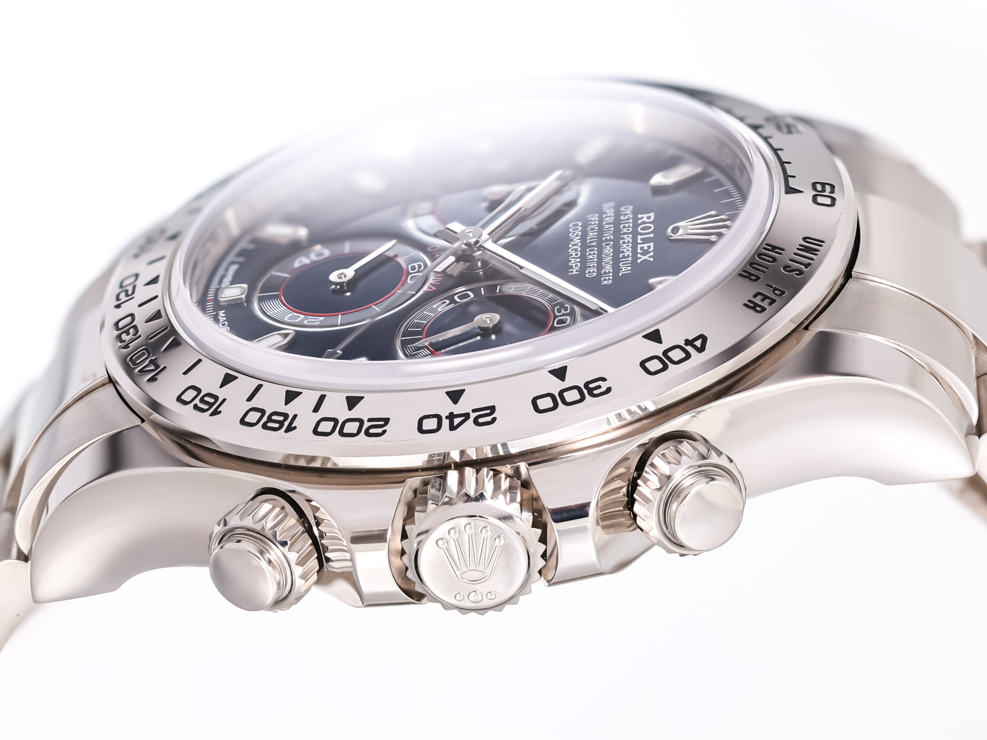 The 40 mm case is rendered in solid 18k white gold, offering a discreet yet substantial presence on the wrist. Its polished surfaces and perfectly proportioned case design reflect Rolex’s continuous refinement of the Daytona, ensuring both comfort and timeless appeal.