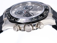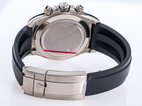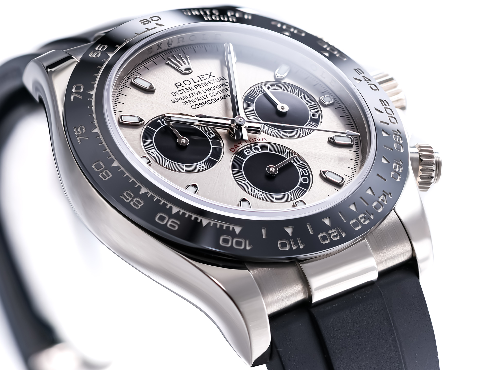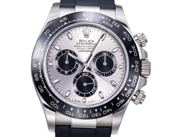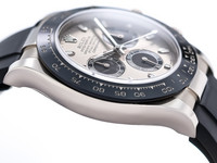 The 116519LN stands out with its 40mm white-gold case, paired with the high-contrast black Cerachrom bezel—an ultra-resistant ceramic developed by Rolex to deliver exceptional durability and long-lasting beauty. Complementing the case is the signature Oysterflex bracelet, a sophisticated elastomer strap reinforced with flexible titanium-nickel blades, fitted with an 18k white-gold folding Oysterlock clasp. The result is unmatched comfort with the luxurious presence of solid gold.