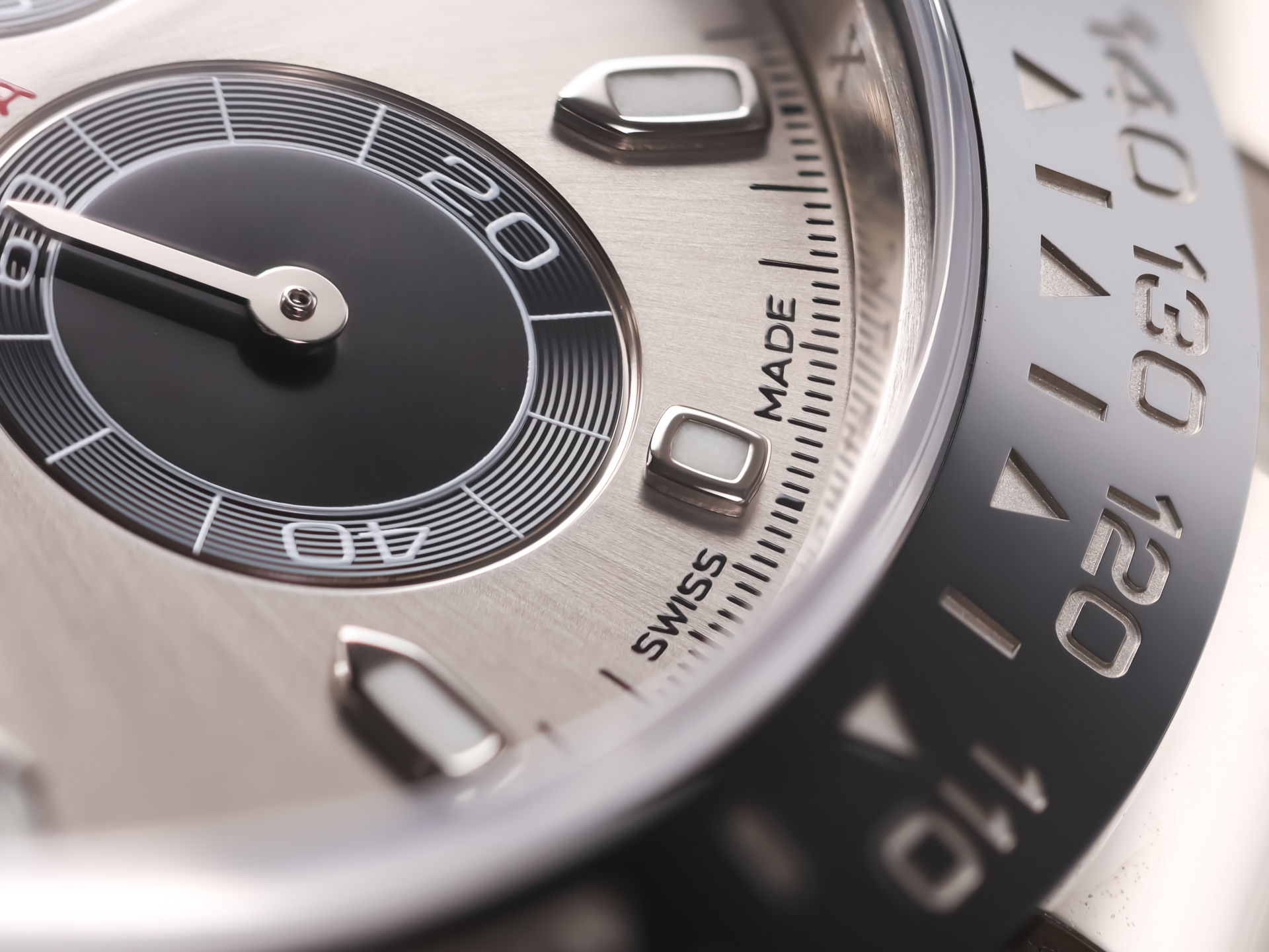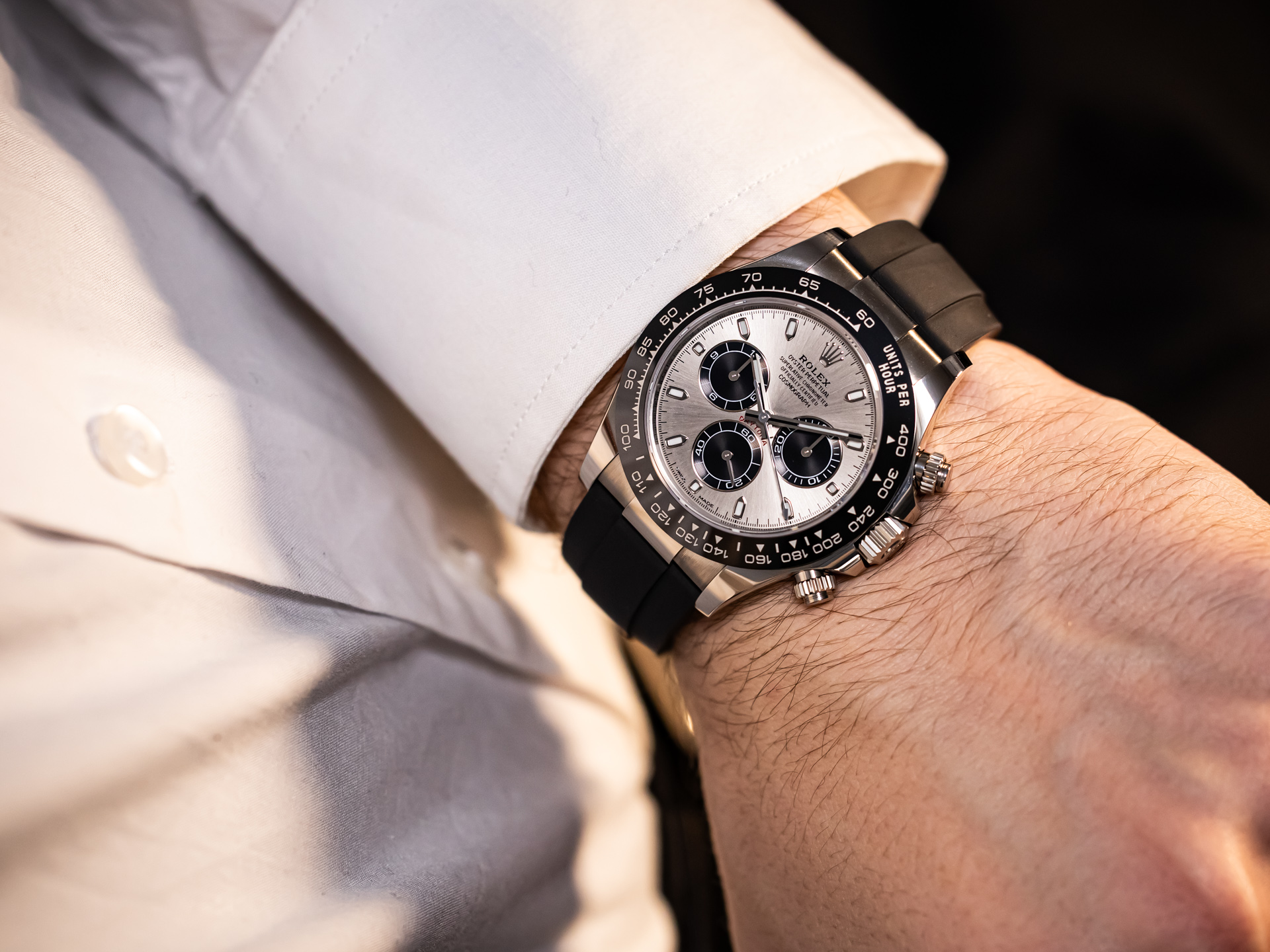 Paired with Rolex’s innovative Oysterflex bracelet and secured by a white gold Oysterlock clasp, the watch combines the durability of a metal core with the flexibility and comfort of elastomer, giving the Daytona a contemporary, sport-luxury character.