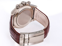 We are pleased to present this exceptional and highly rare example of the Rolex Daytona Cosmograph crafted in 18k white gold and fitted with its original brown crocodile leather strap and matching 18k white gold folding clasp.