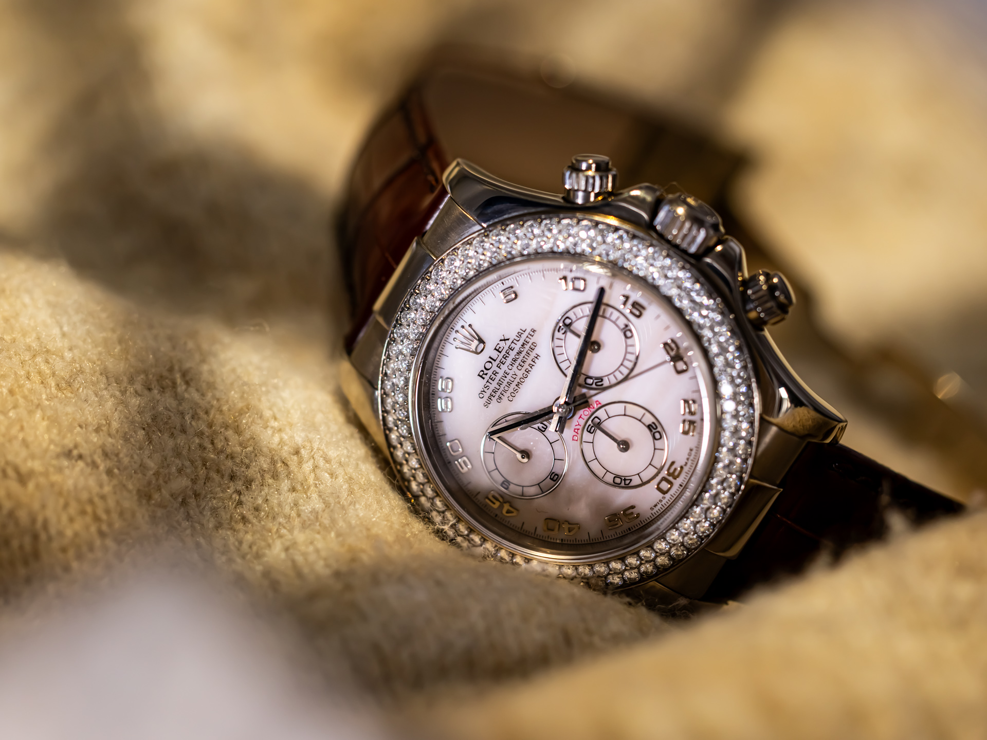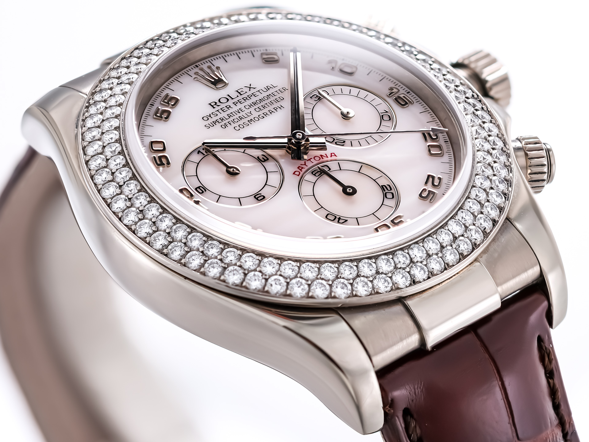 Manufactured in 2002, this reference has long since been discontinued and stands out not only for its precious metal construction but also for its factory-set diamond bezel. The double row of brilliant-cut diamonds—original to Rolex—adds a layer of sophistication rarely seen on Daytona models, marking it as a standout within the collection.