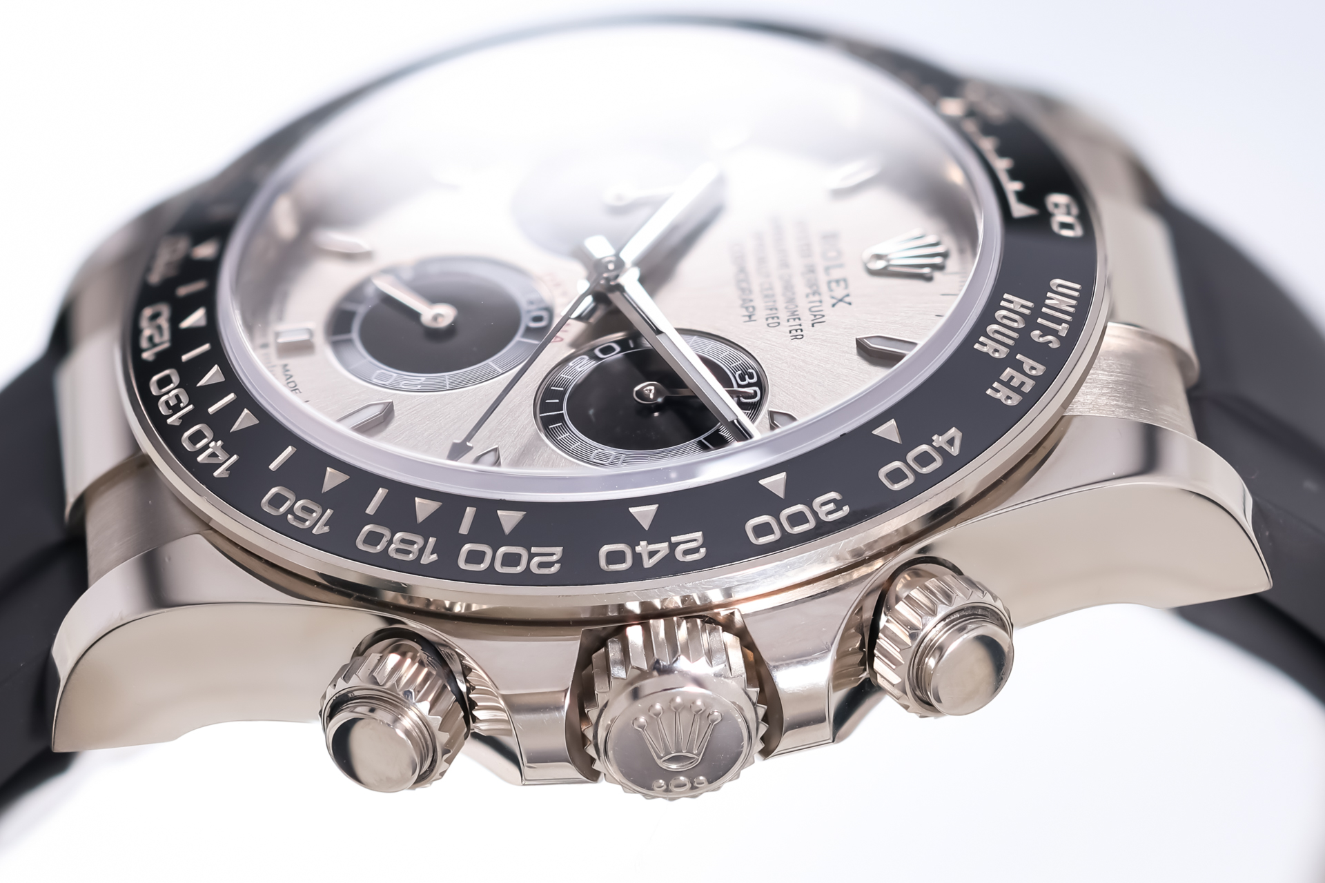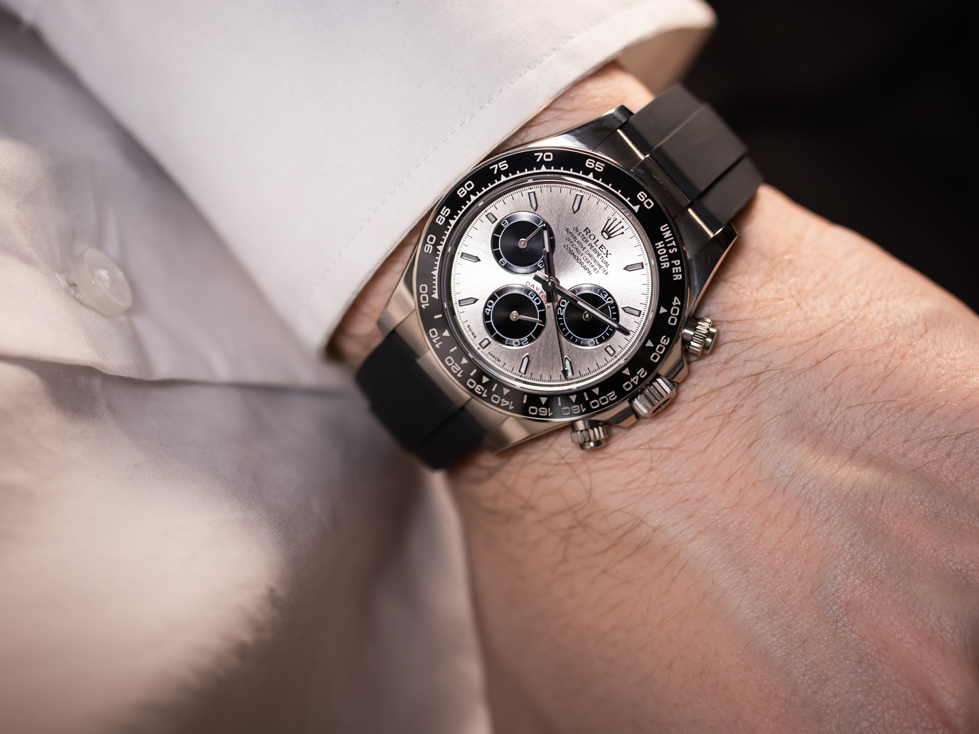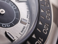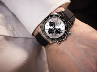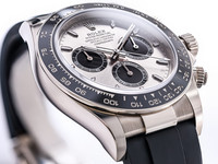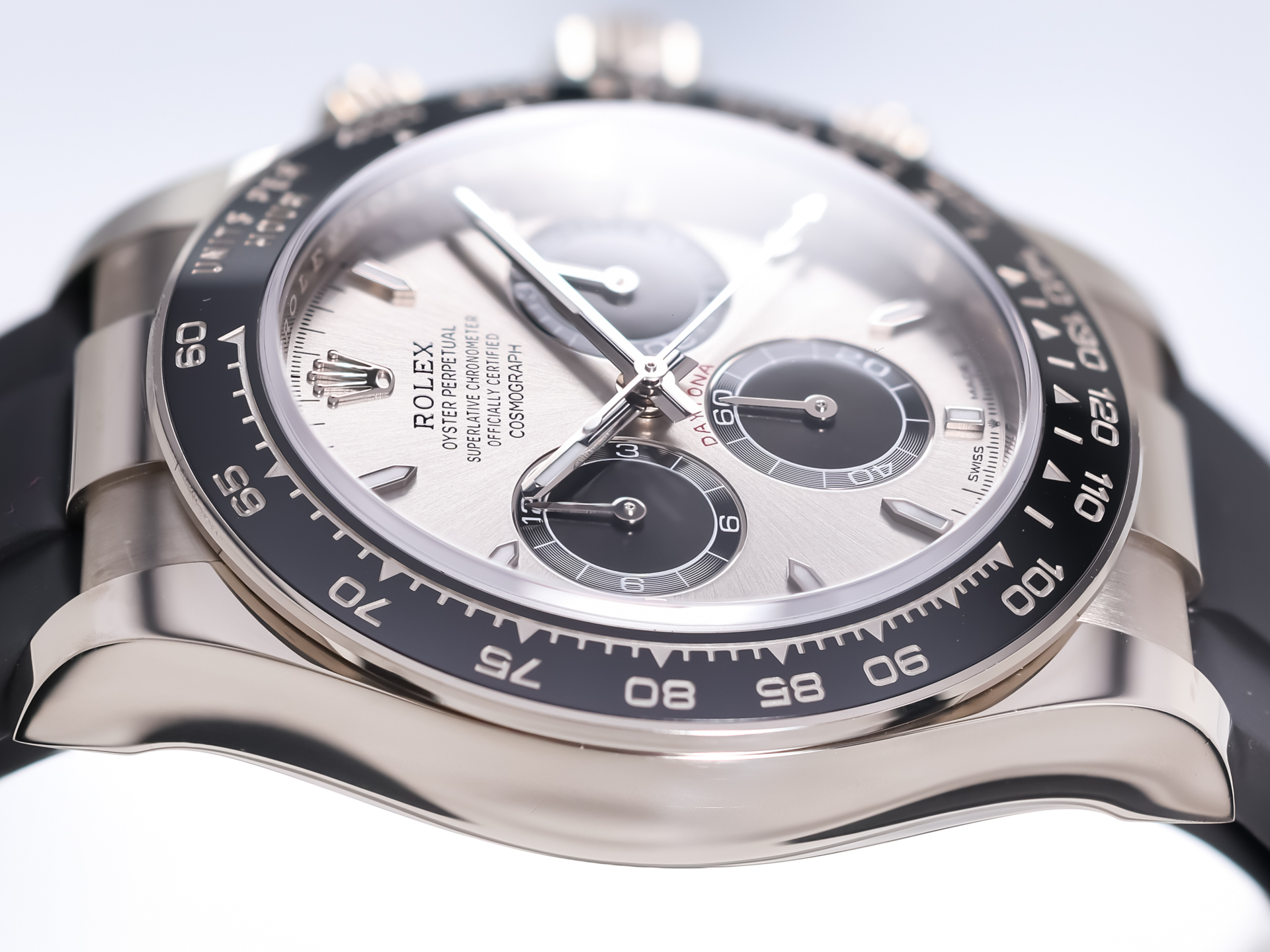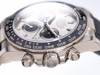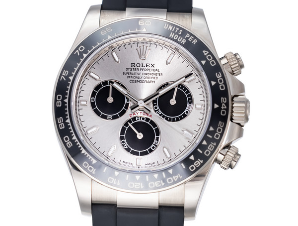The 40 mm case is forged from solid 18k white gold, combining understated elegance with unmistakable presence. The model features Rolex’s black Cerachrom bezel with engraved tachymetric scale, offering exceptional scratch resistance and long-term durability while enhancing the modern, technical aesthetic of the watch.