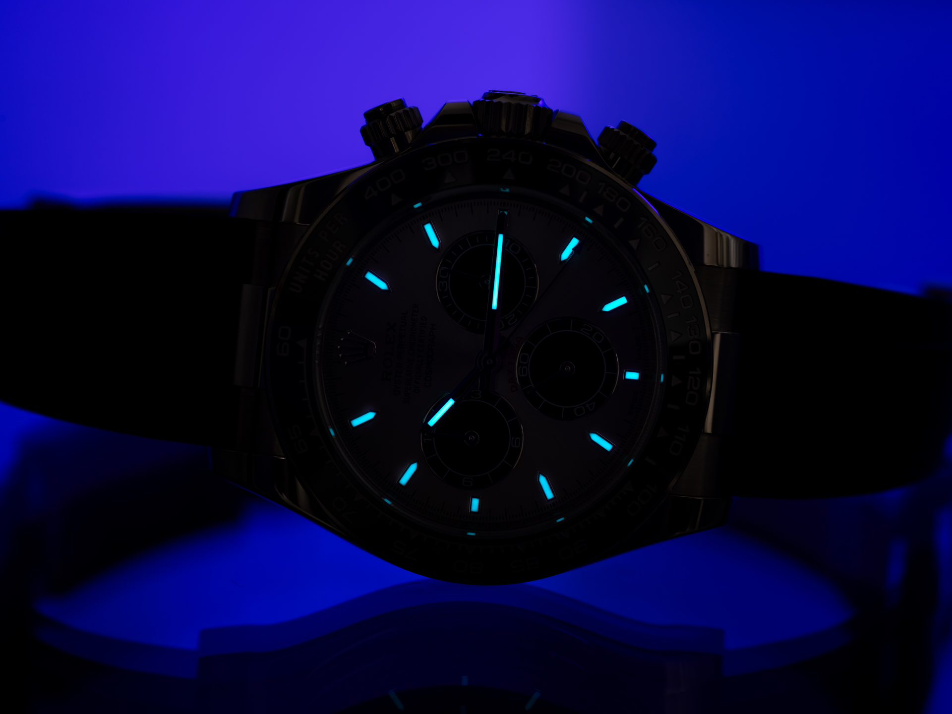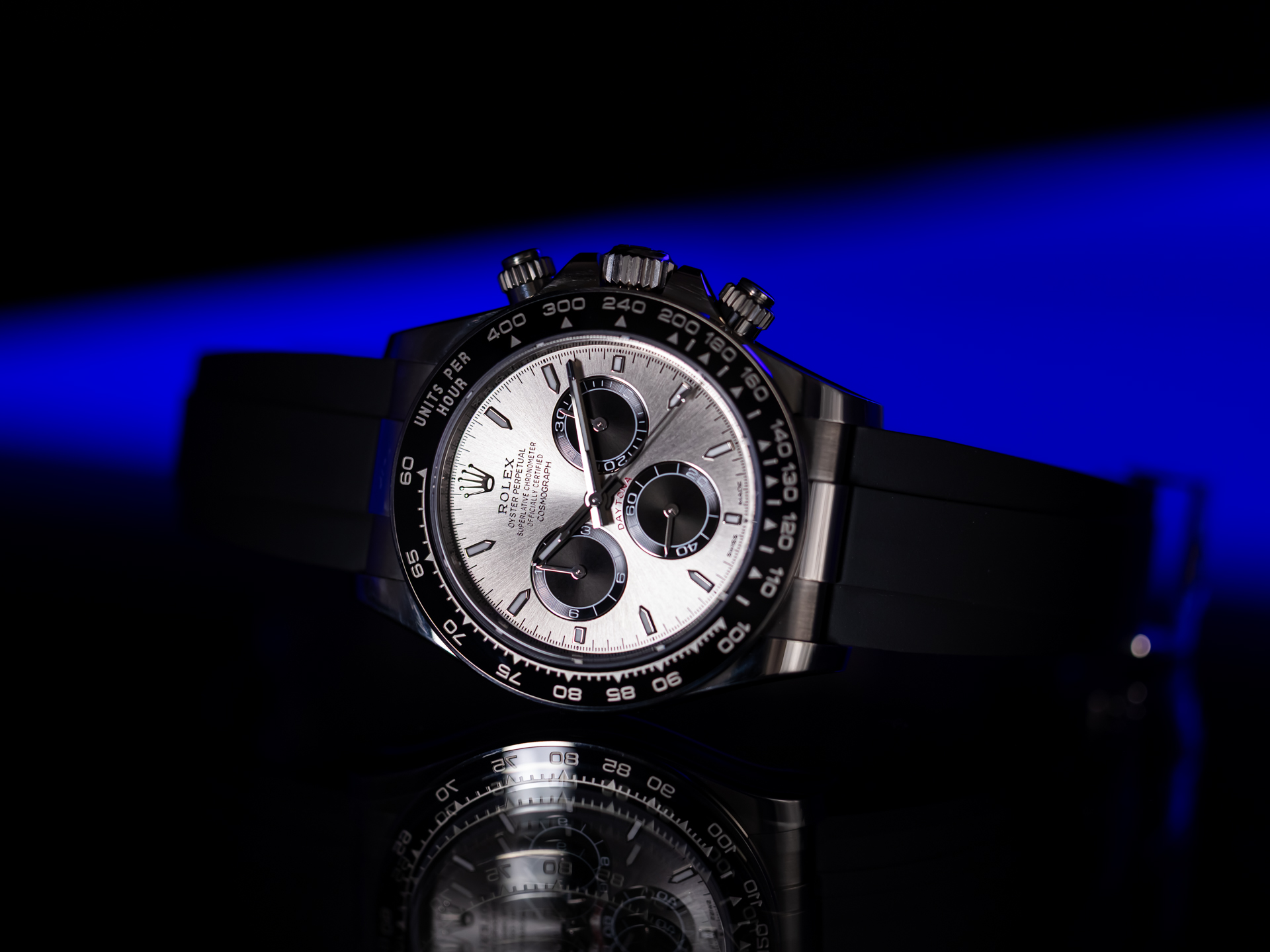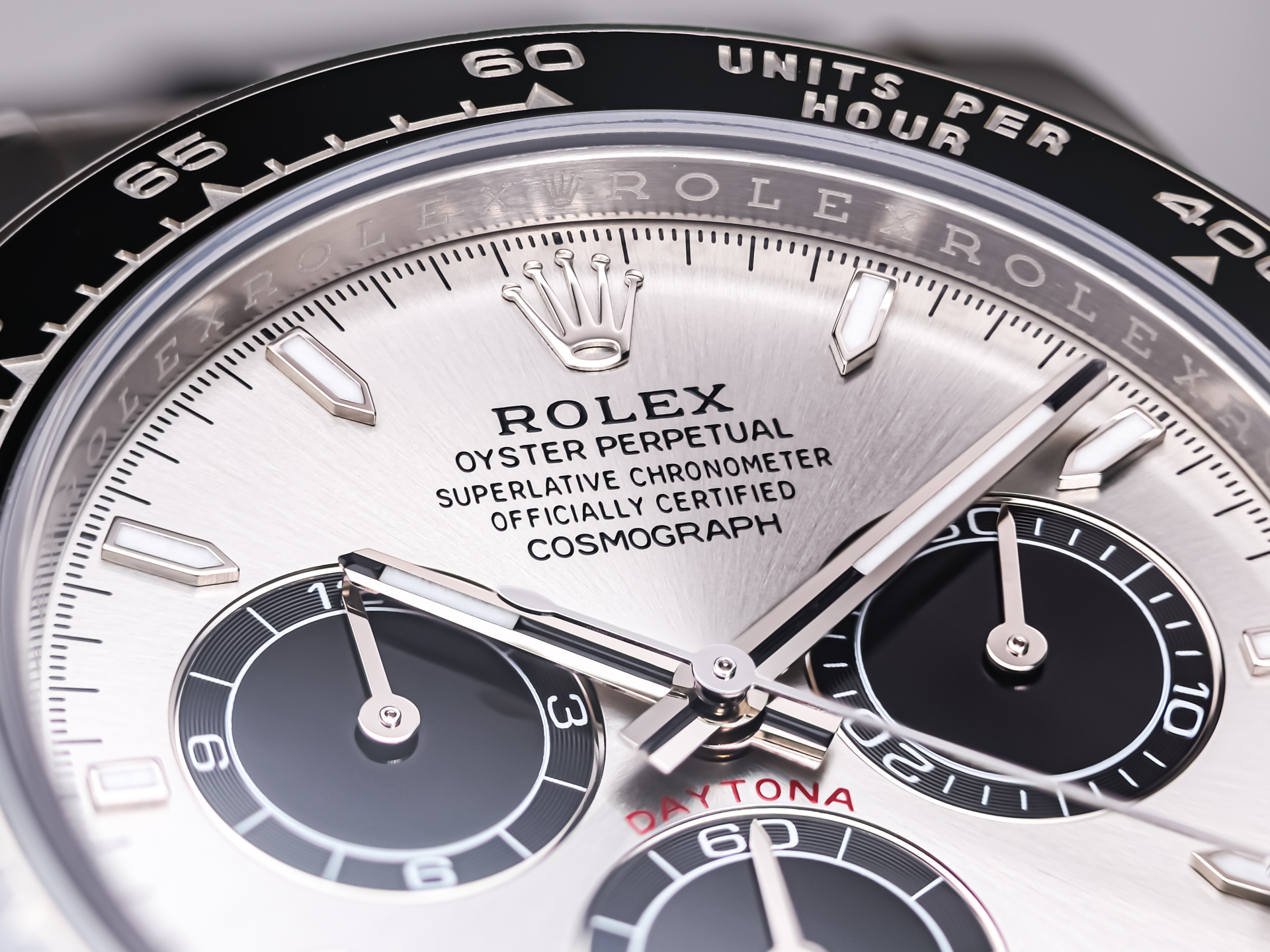 The 40 mm case is forged from solid 18k white gold, combining understated elegance with unmistakable presence. The model features Rolex’s black Cerachrom bezel with engraved tachymetric scale, offering exceptional scratch resistance and long-term durability while enhancing the modern, technical aesthetic of the watch.