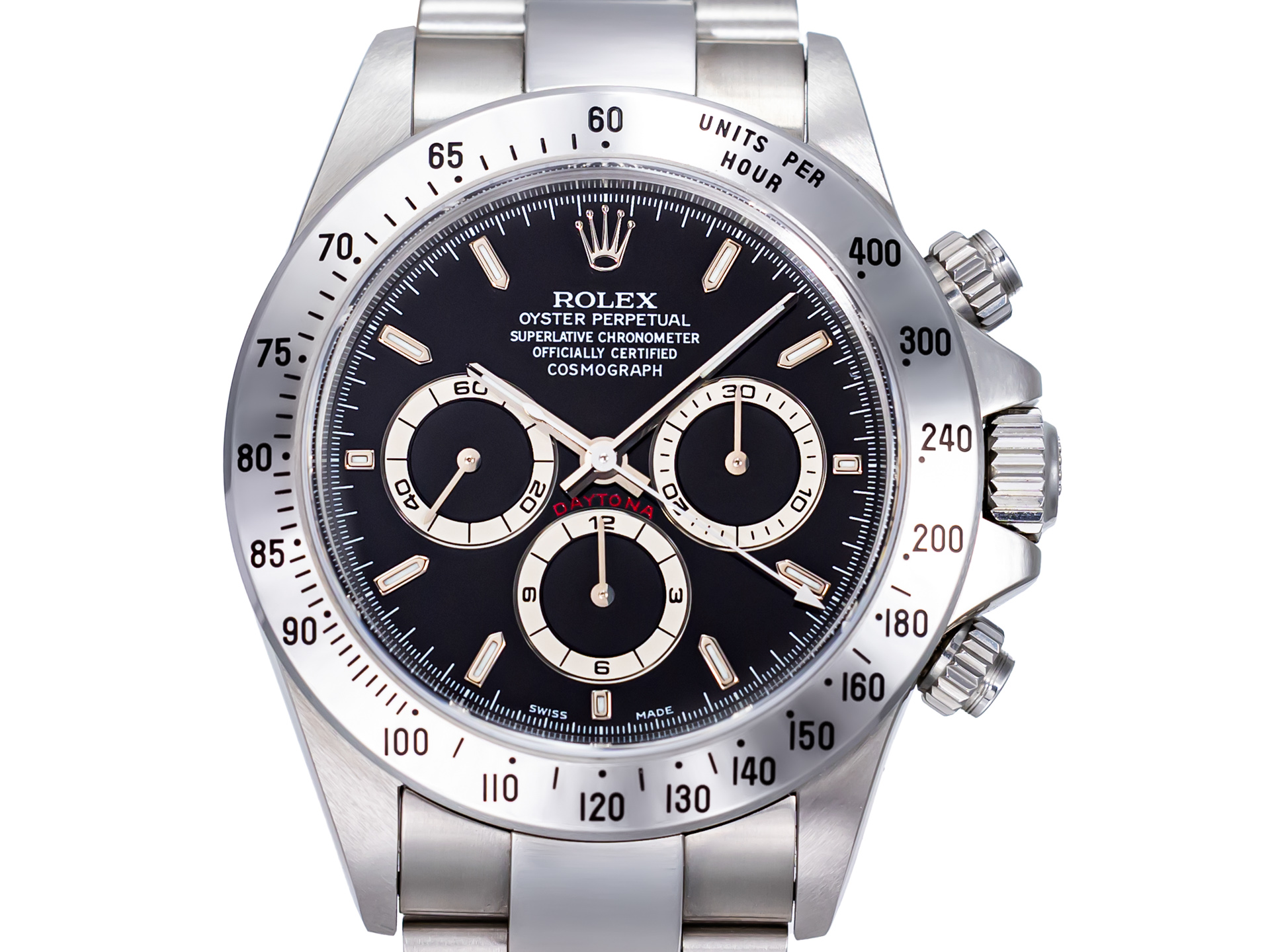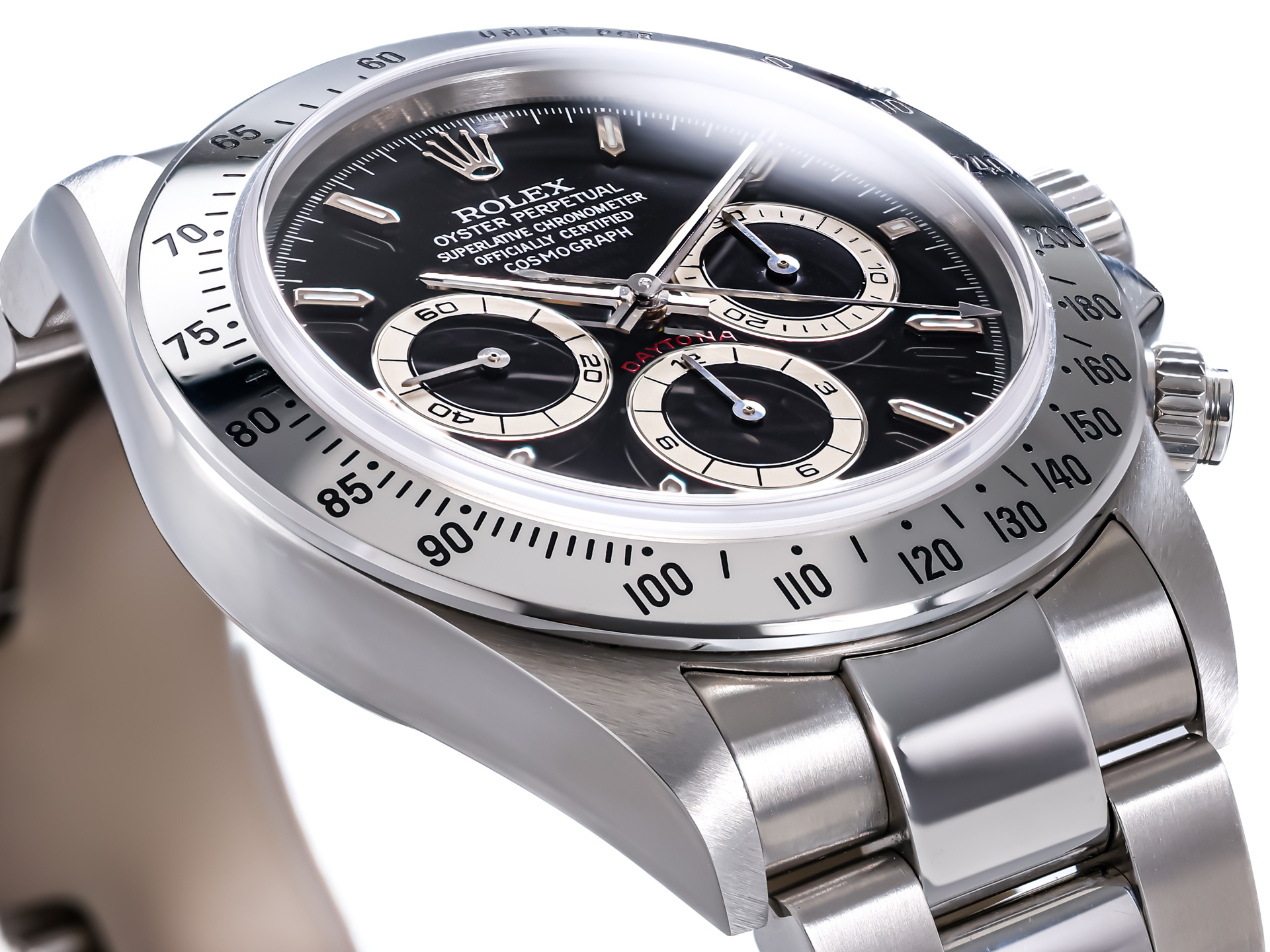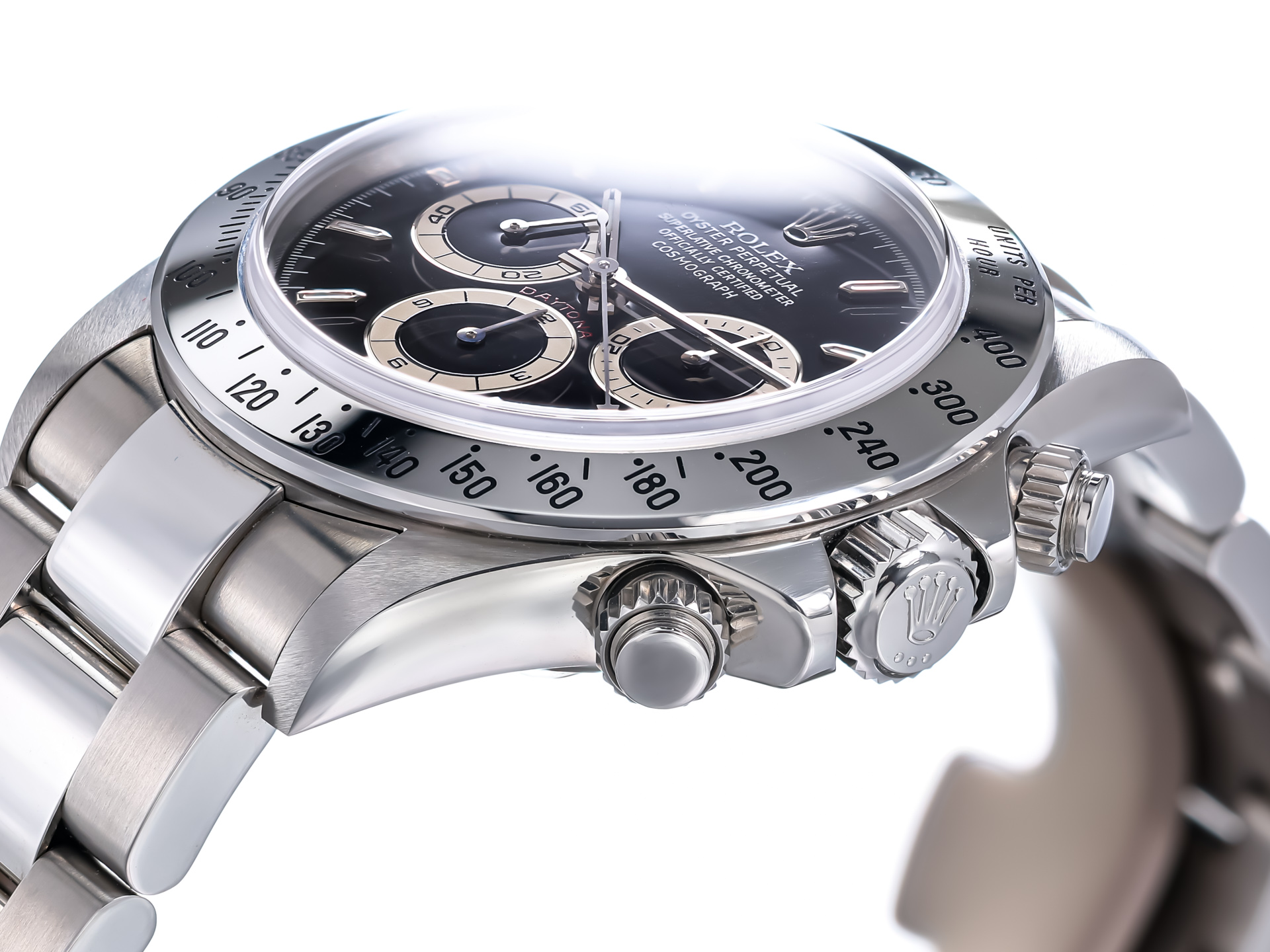 The 40mm stainless steel Oyster case remains in untouched, factory-original condition with sharp edges, untouched lugs, and perfect satin and polished surfaces. The steel tachymeter bezel, engraved up to 400 units per hour, complements the sporty yet timeless aesthetic.