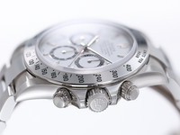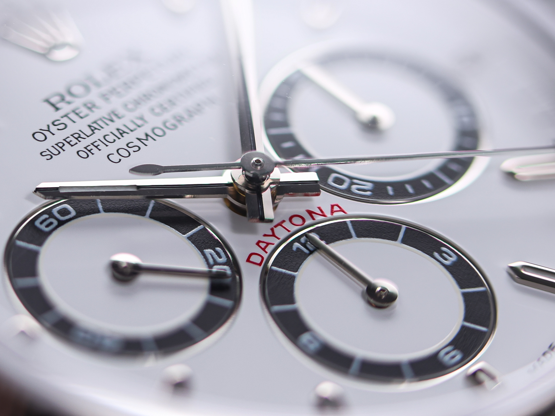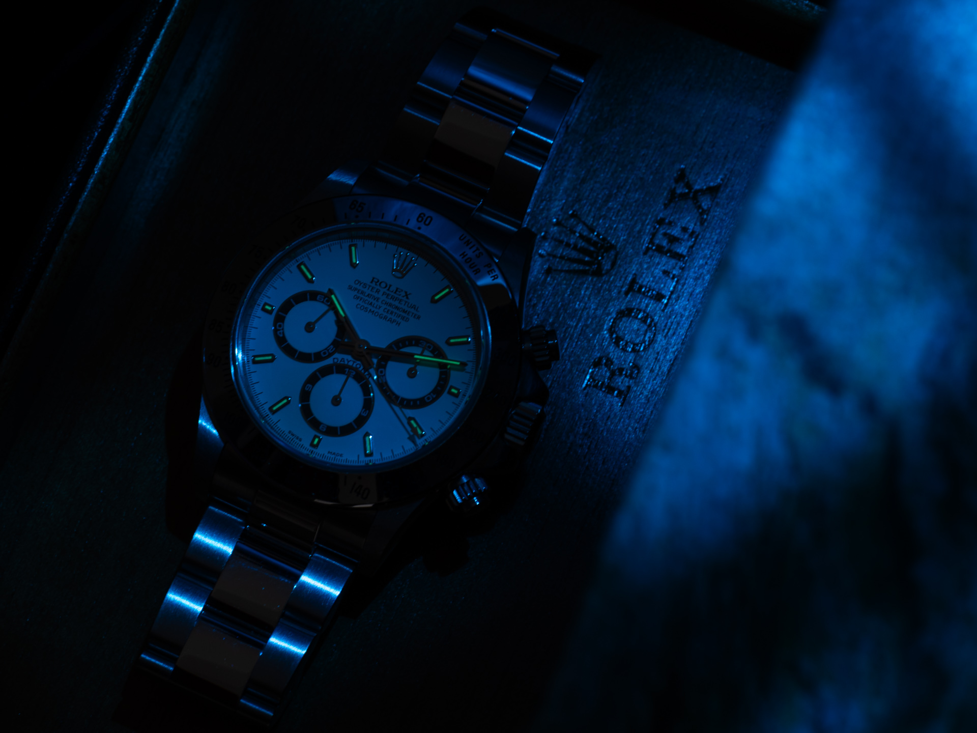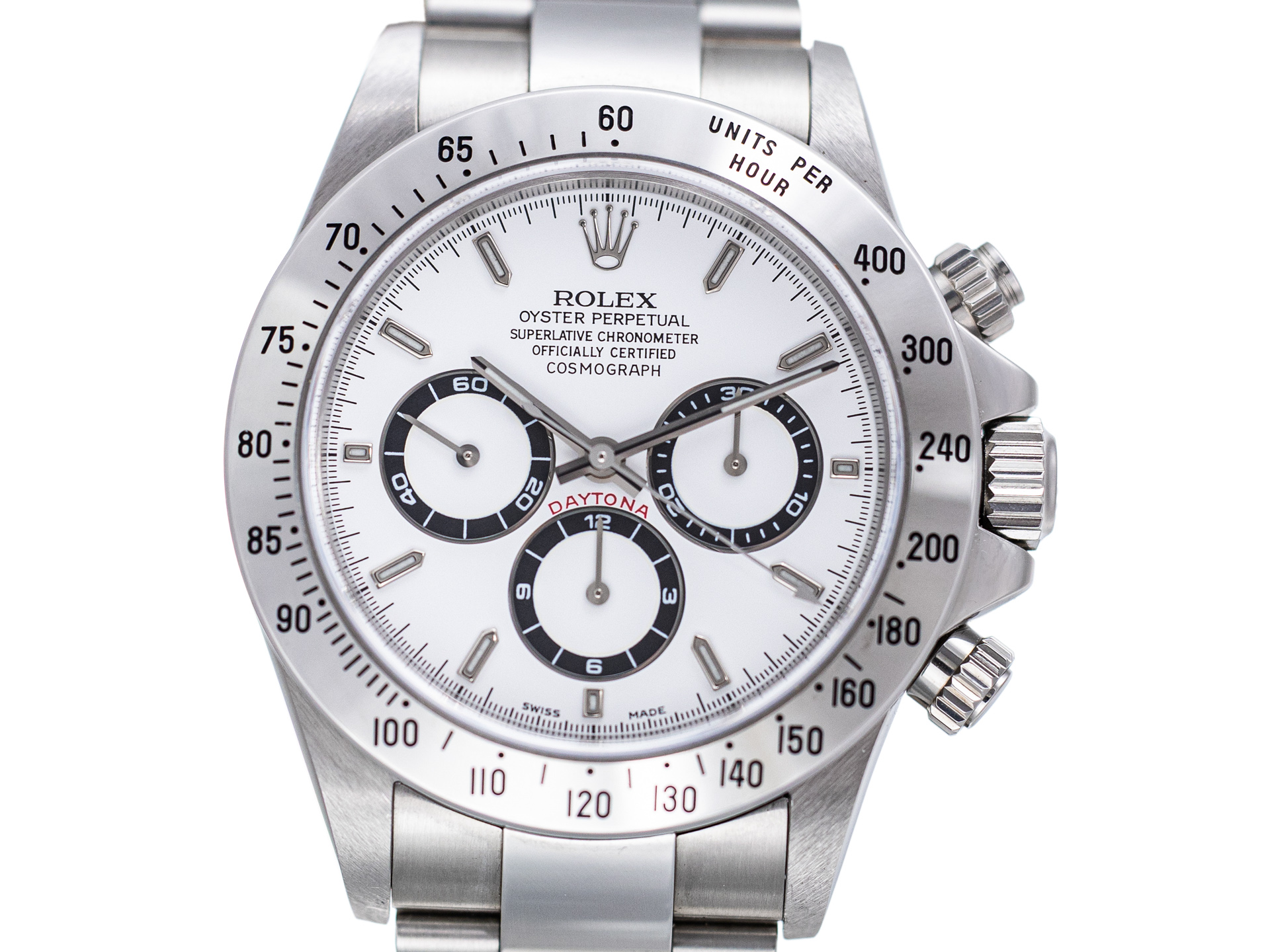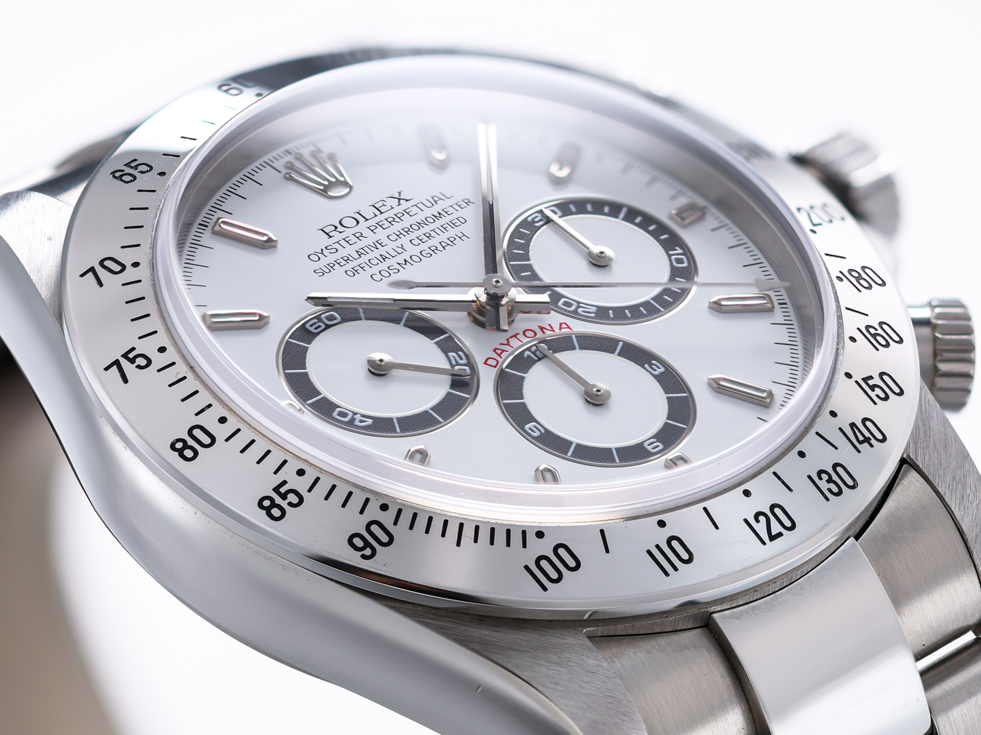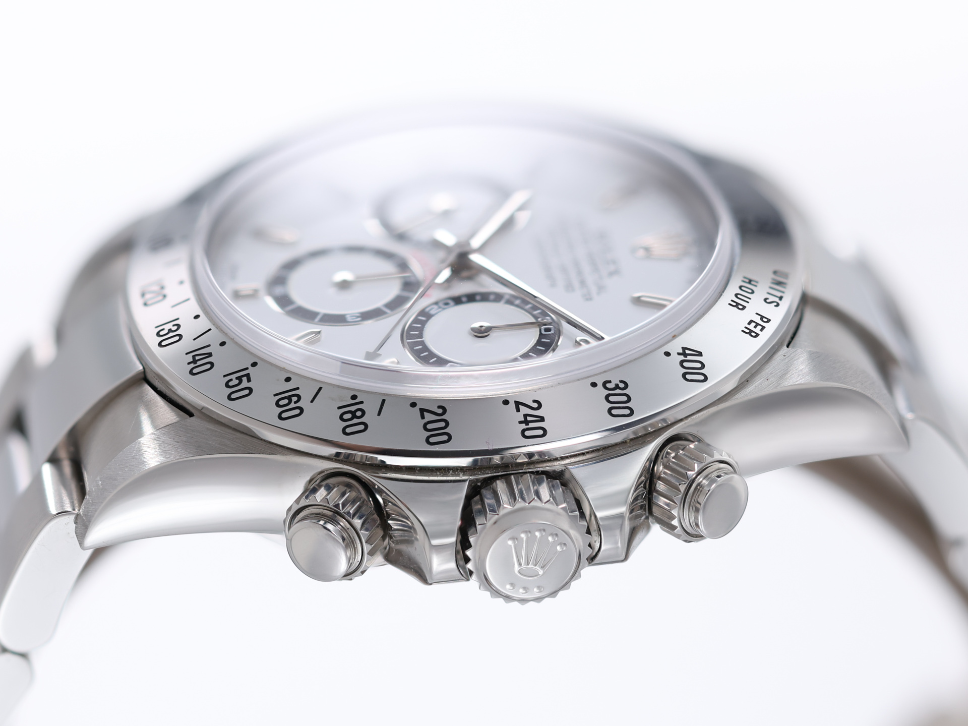 The white Tritium dial—correct for early A-series production—features applied steel hour markers with luminous plots that have begun to show a soft, creamy tone, a hallmark of originality. The subdials are surrounded by crisp black rings, maintaining the perfect contrast that defines the classic Daytona aesthetic.