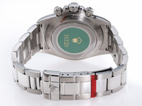 The tachymeter bezel, calibrated to 400 units per hour, remains pristine, while the original green holographic sticker on the caseback confirms its untouched state.