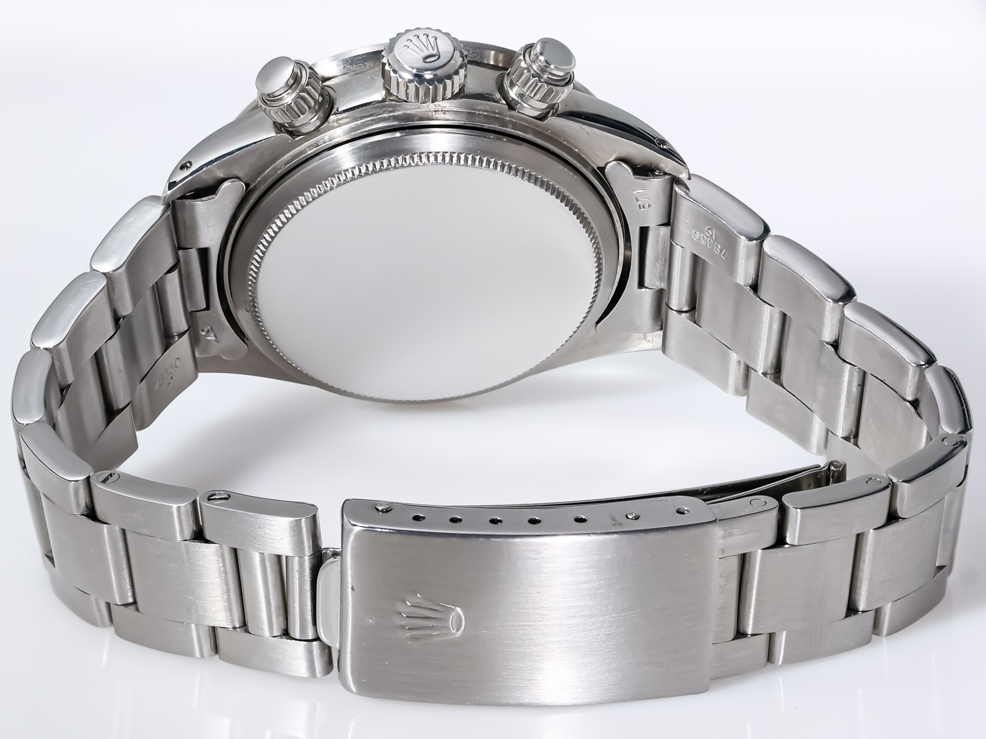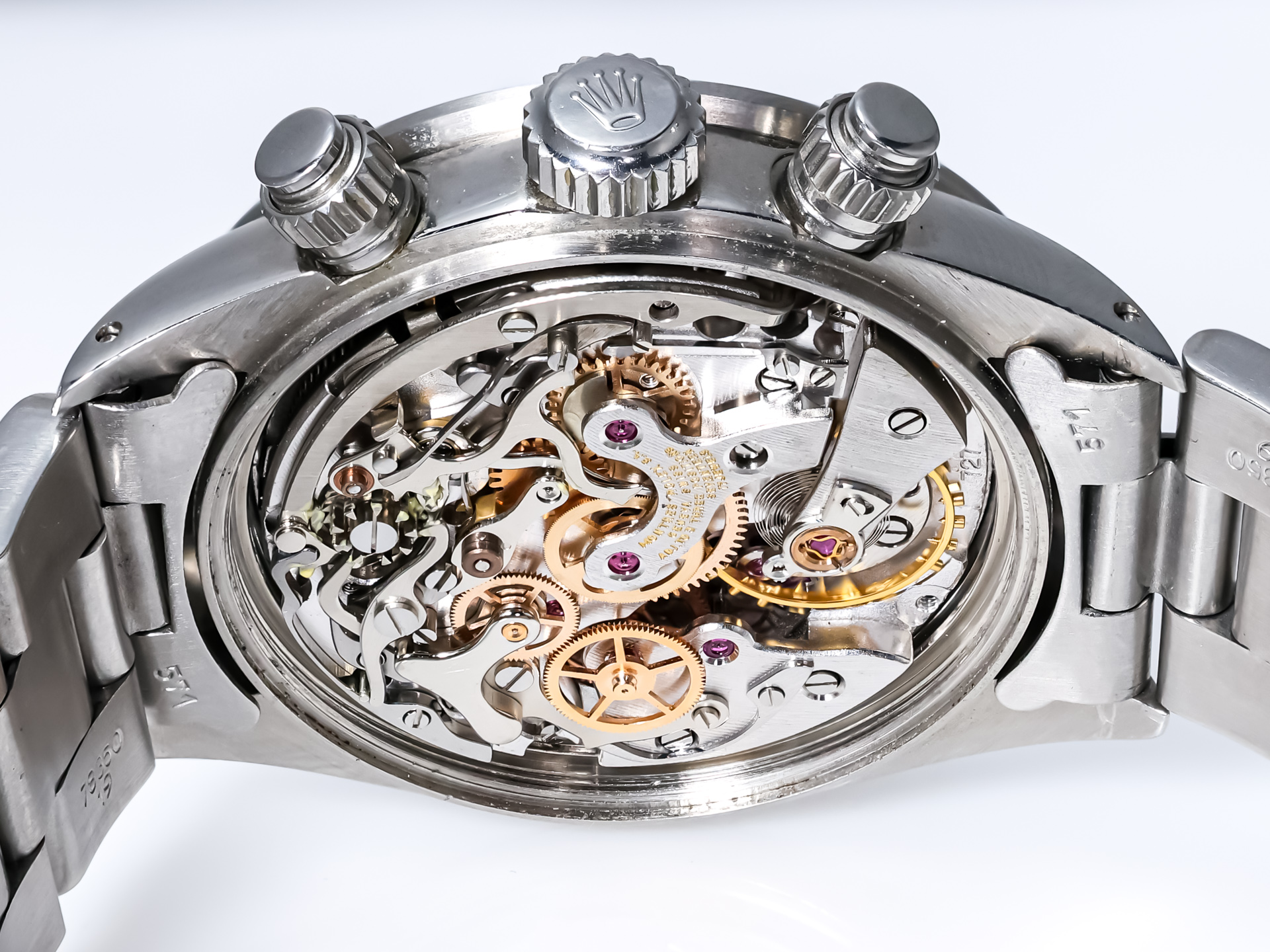 At its heart beats the Rolex Caliber 727, a hand-wound chronograph movement descended from the renowned Valjoux 72, celebrated for its precision, reliability, and proven performance in motorsport timing. The mechanism winds smoothly and performs to specification, underscoring Rolex’s uncompromising craftsmanship of the era.