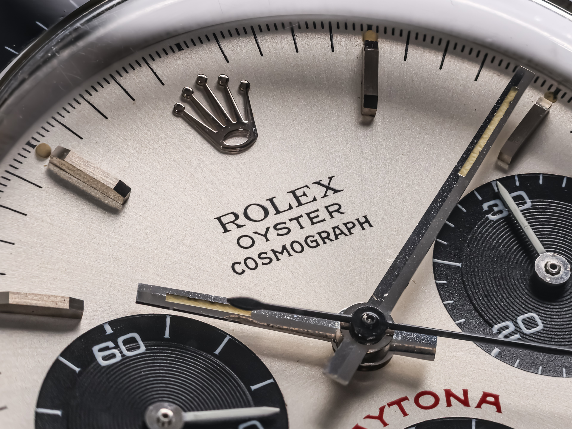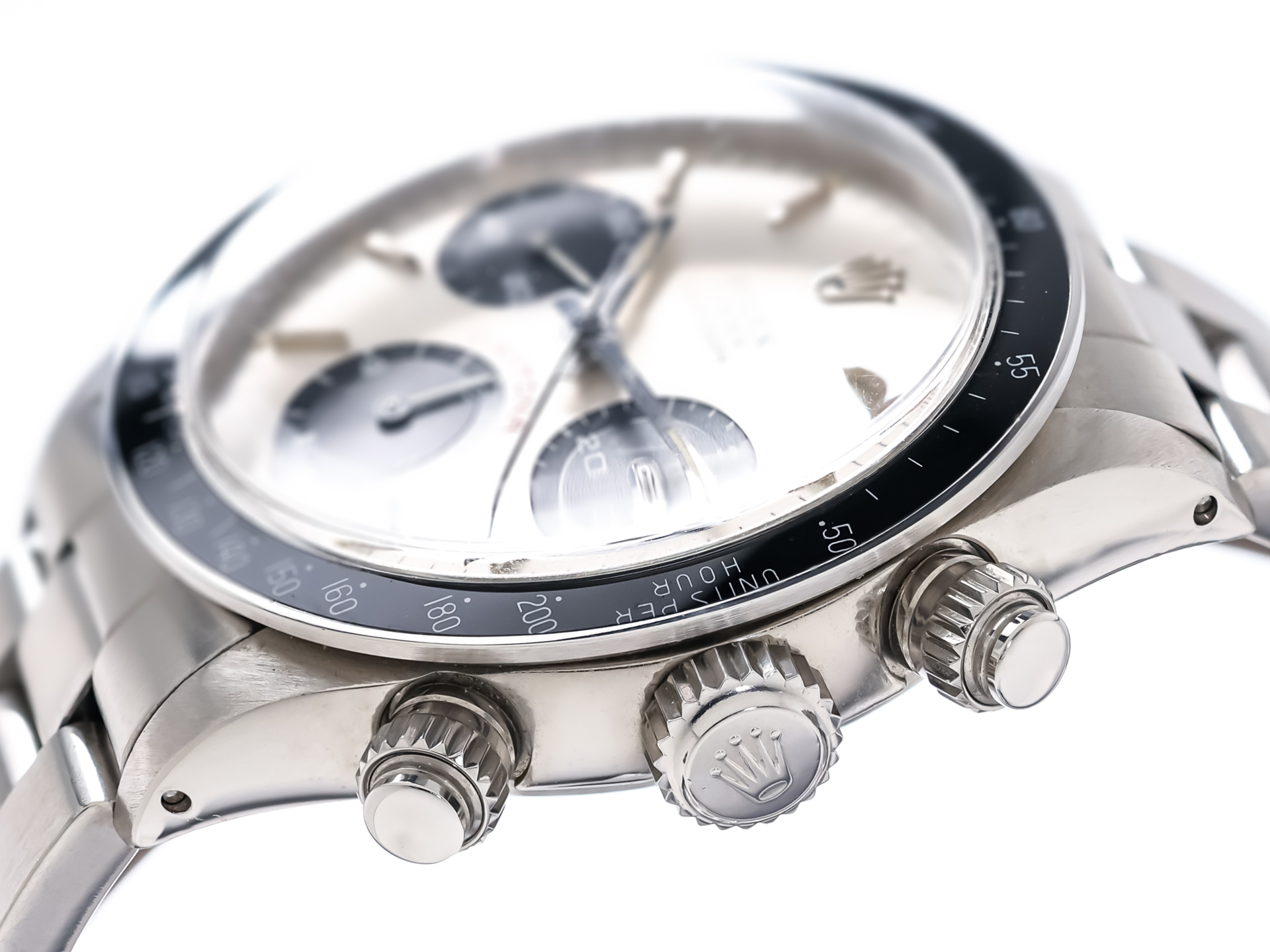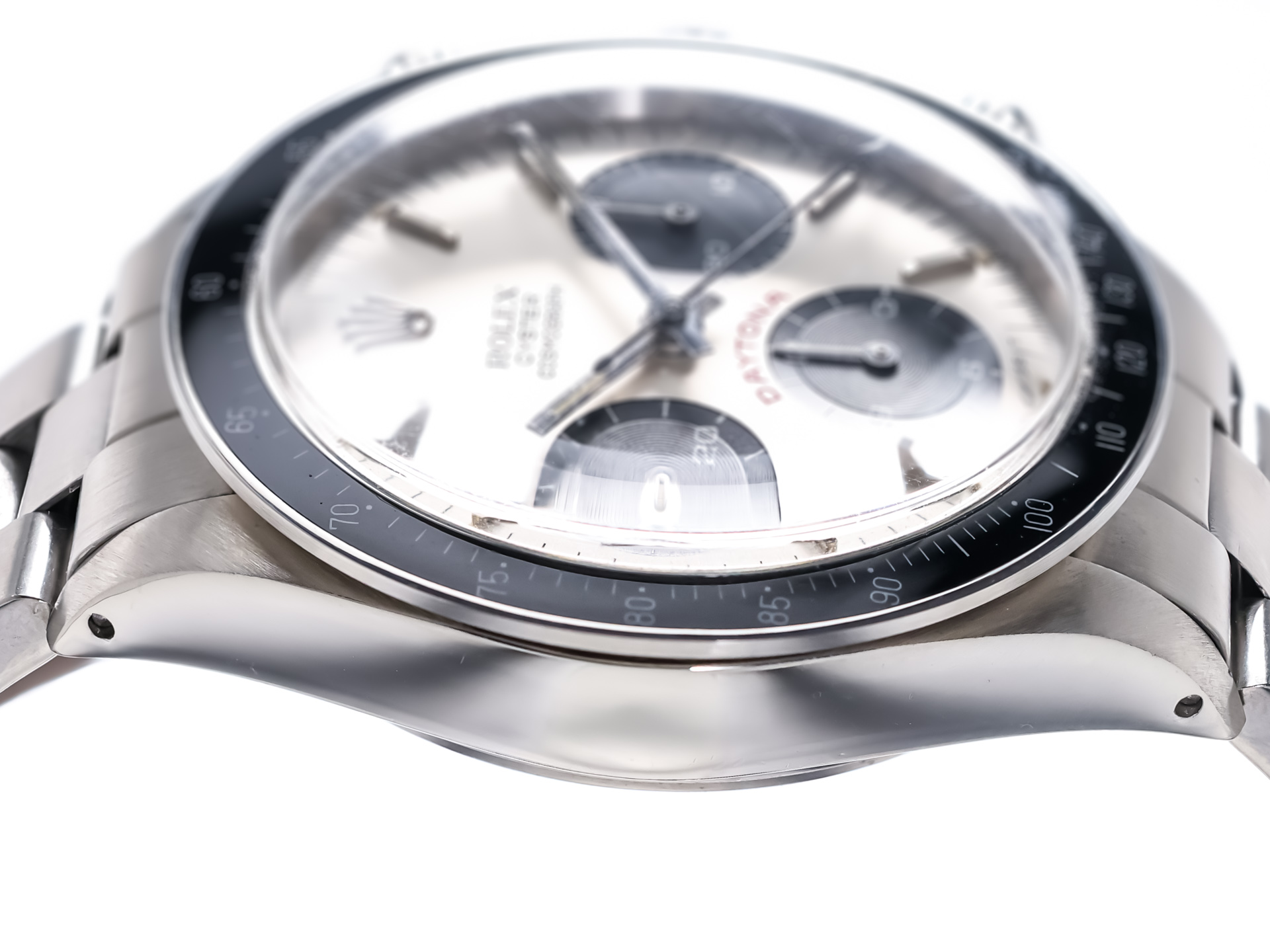 Produced in 1978, this timepiece remains in excellent vintage condition, retaining sharp case edges, strong crown guards, and crisp screw-down pushers. The silver tritium dial displays stunning contrast with its black sub-registers and the bold red “Daytona” script above the 6 o’clock counter, all framed by a black acrylic bezel insert calibrated to 200 units per hour.