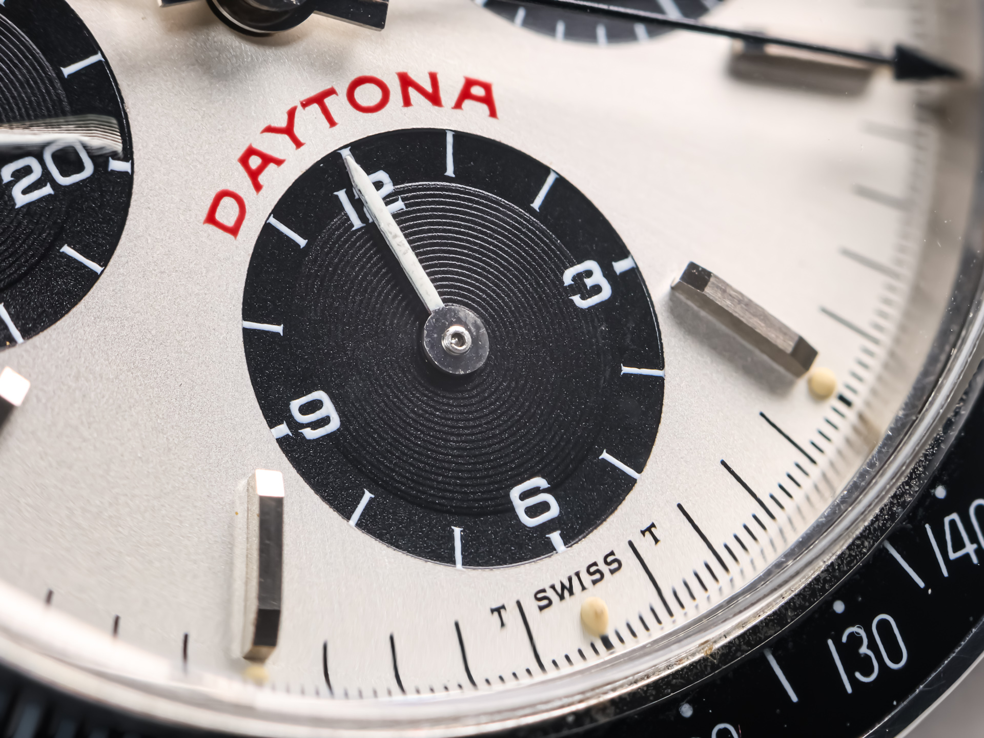 This is one of the most celebrated and collectible vintage chronographs of all time. It features the coveted “Big Red Daytona” designation on the Titium dial.