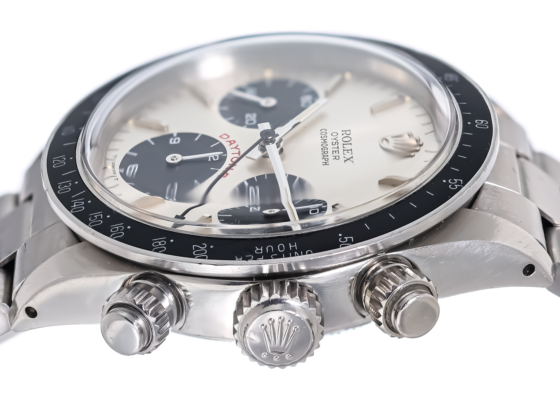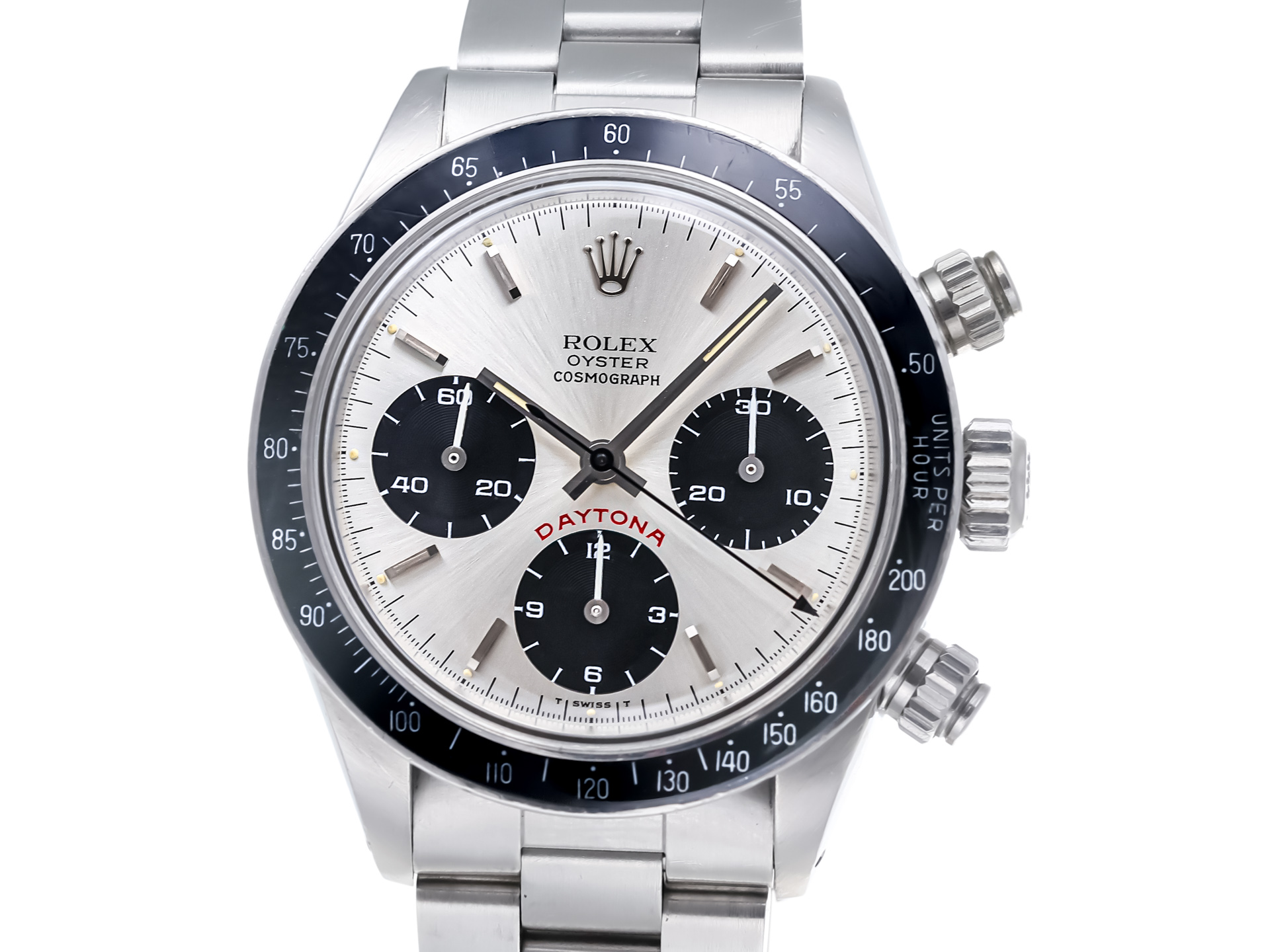 We are proud to present this legendary Rolex Daytona Cosmograph Ref. 6263, in stainless steel with a steel Oyster bracelet.