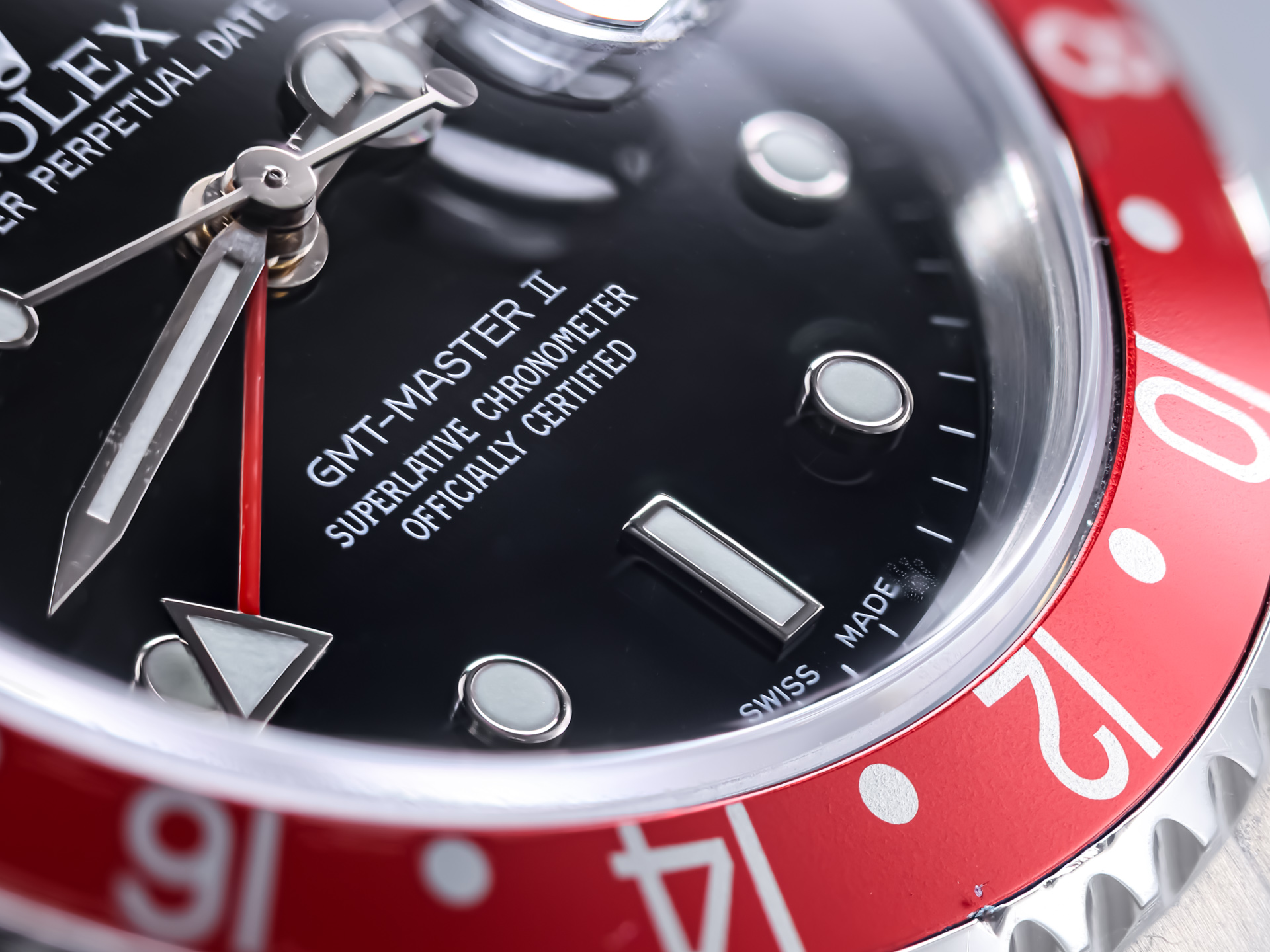 The black dial remains in excellent condition, featuring luminous hour markers and Mercedes hands with Super-LumiNova fill for reliable visibility. The red GMT hand provides the essential dual-time functionality that defines the model, while the date aperture at 3 o’clock with Cyclops magnification integrates seamlessly into the dial’s balanced layout. Together, these elements create a timeless presentation that has made the 16710 one of the most beloved travel watches ever produced.