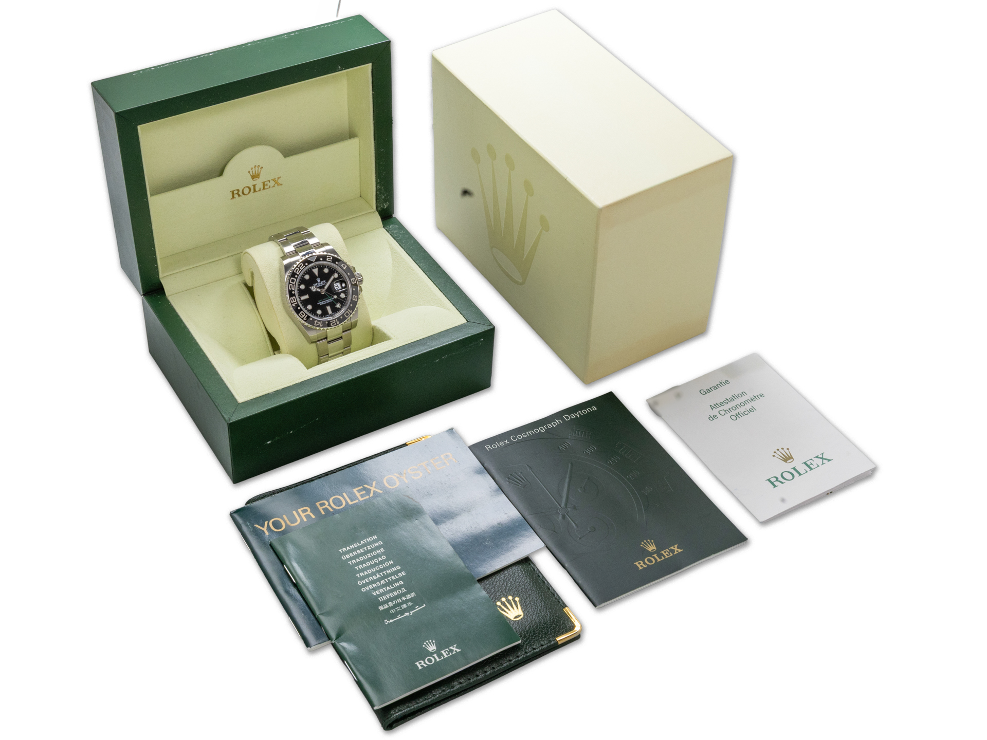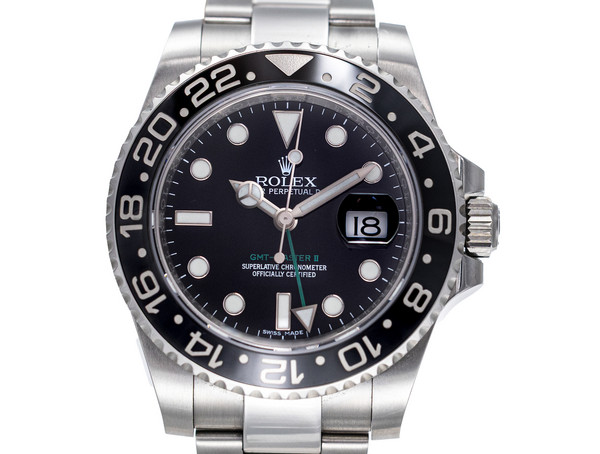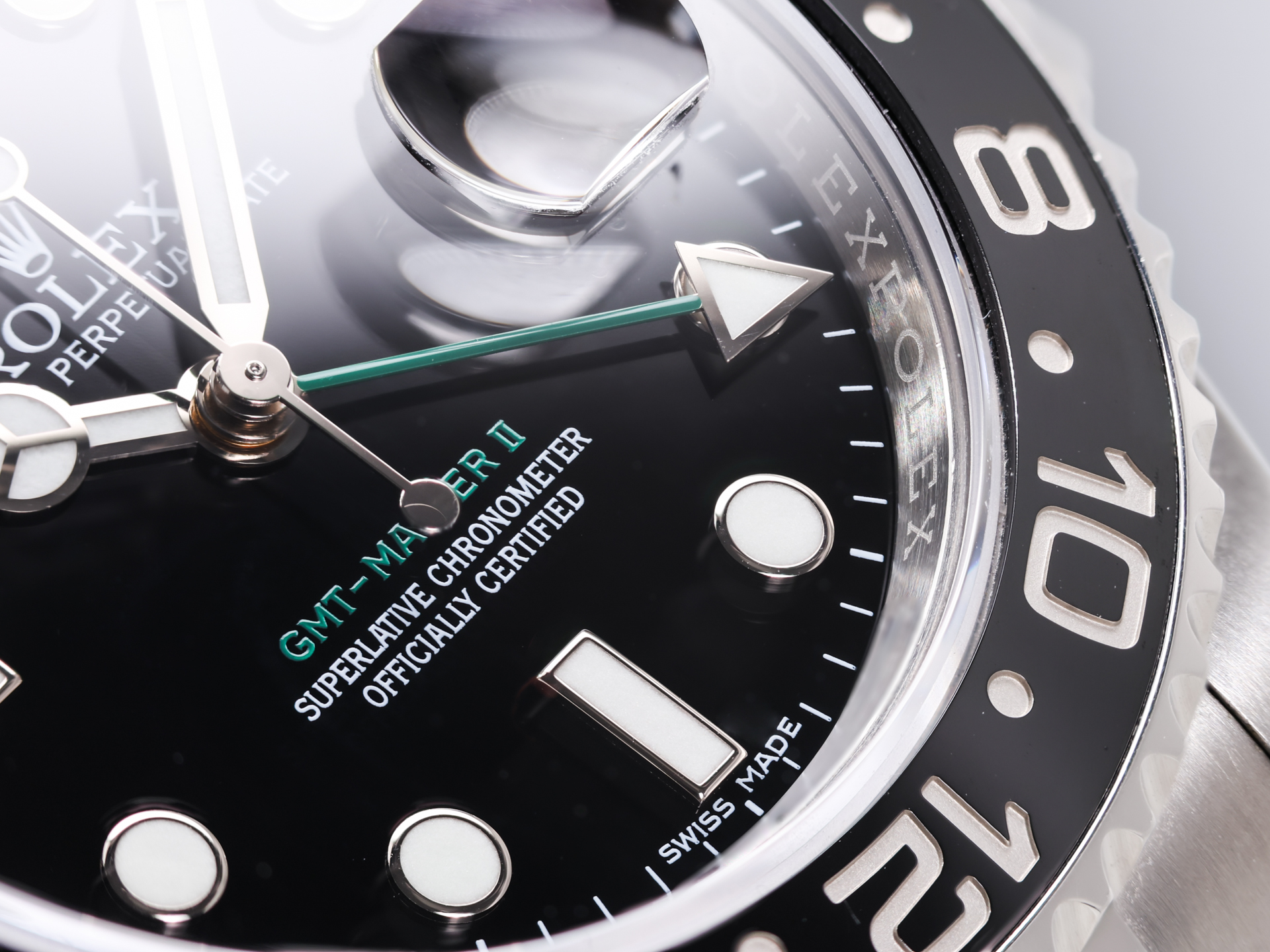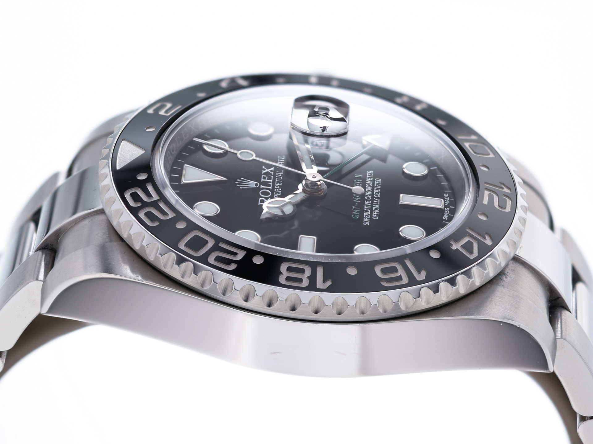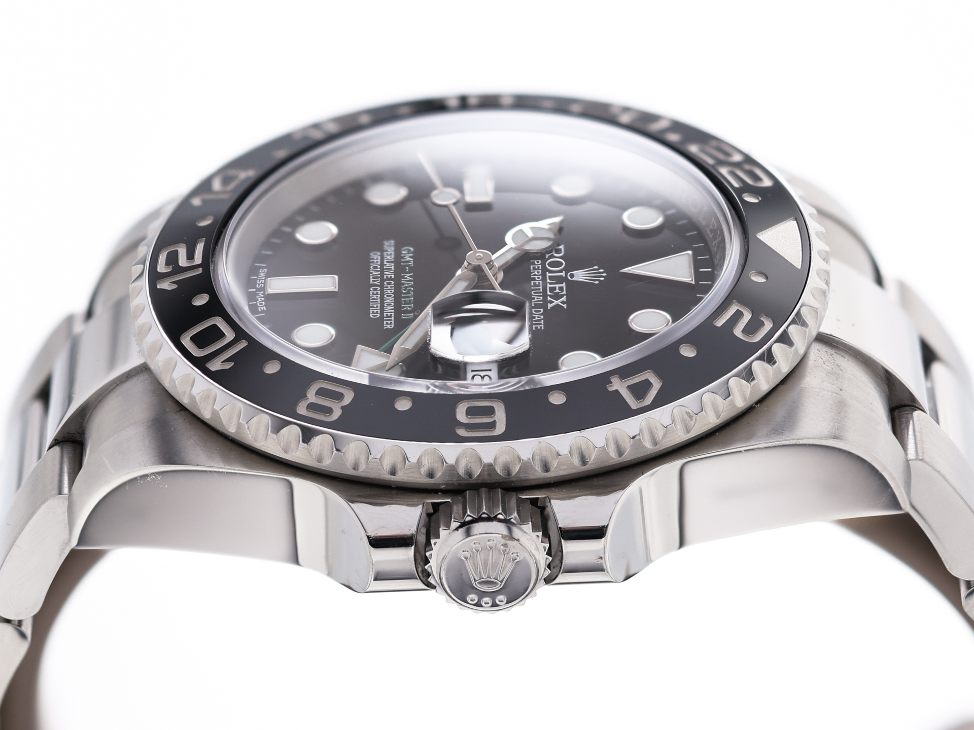 The Rolex GMT-Master II Ref. 116710LN is a bold evolution of Rolex's legendary pilot's watch, created for international air travel in the 1950s and now the ultimate choice for globetrotters and busy professionals who master multiple time zones.