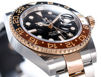 Housed in a 40 mm case of Everose Rolesor—a signature combination of Oystersteel and 18 ct Everose gold—this reference offers a warm, sophisticated aesthetic that sets it apart from the purely utilitarian GMTs of the past. The defining feature is the bidirectional rotatable bezel fitted with a two-color Cerachrom insert in black and brown ceramic. This seamless transition of colors, with numerals PVD-coated in pink gold, provides a refined contrast that evokes the vintage "Root Beer" heritage while maintaining a contemporary, scratch-resistant finish.