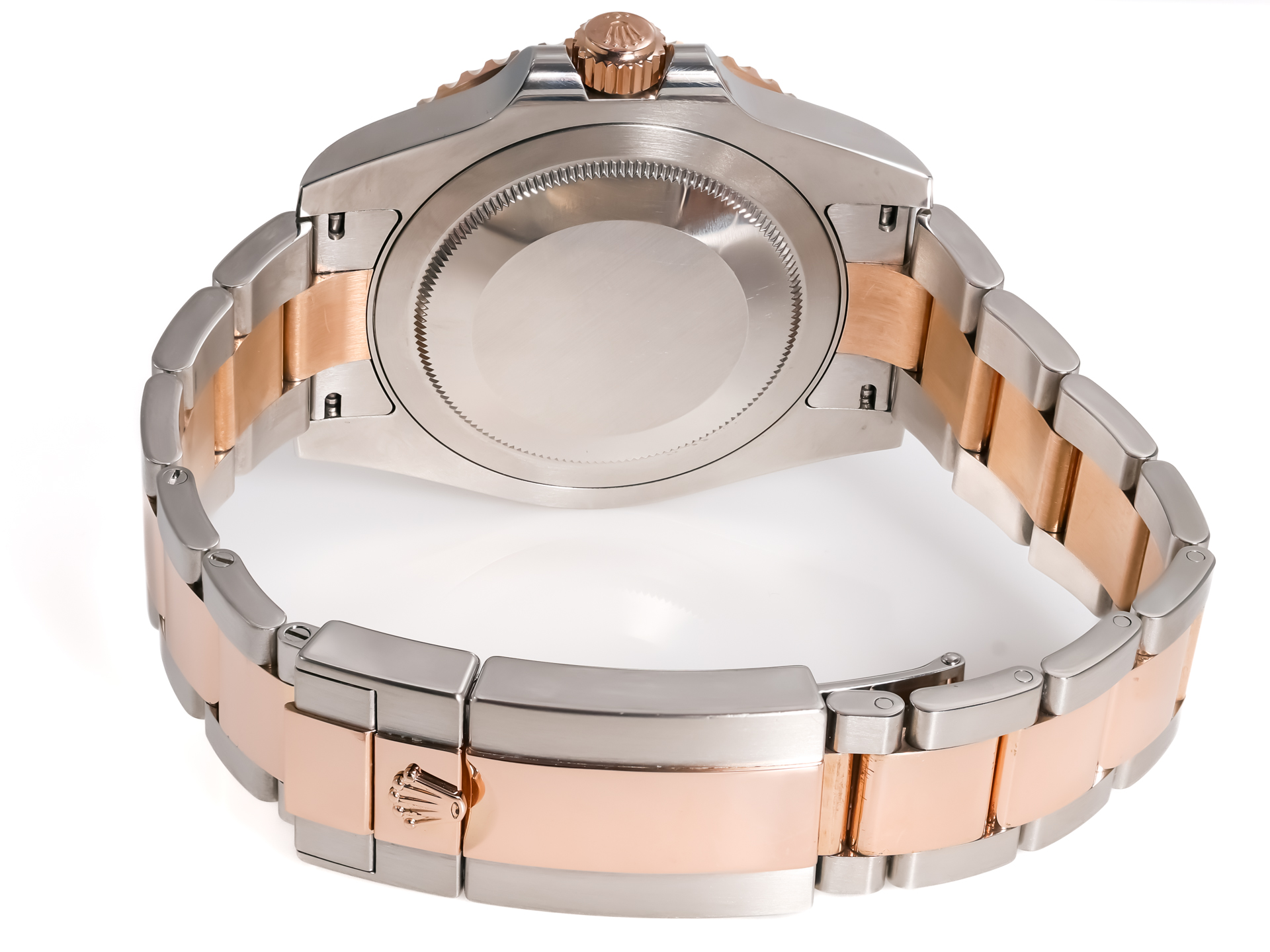 The watch is presented on the iconic Oyster bracelet, featuring center links in 18 ct Everose gold and outer links in Oystersteel. It is equipped with the Oysterlock folding safety clasp and the Easylink comfort extension link, allowing the wearer to increase the bracelet length by approximately 5 mm for maximum comfort in any climate.