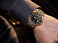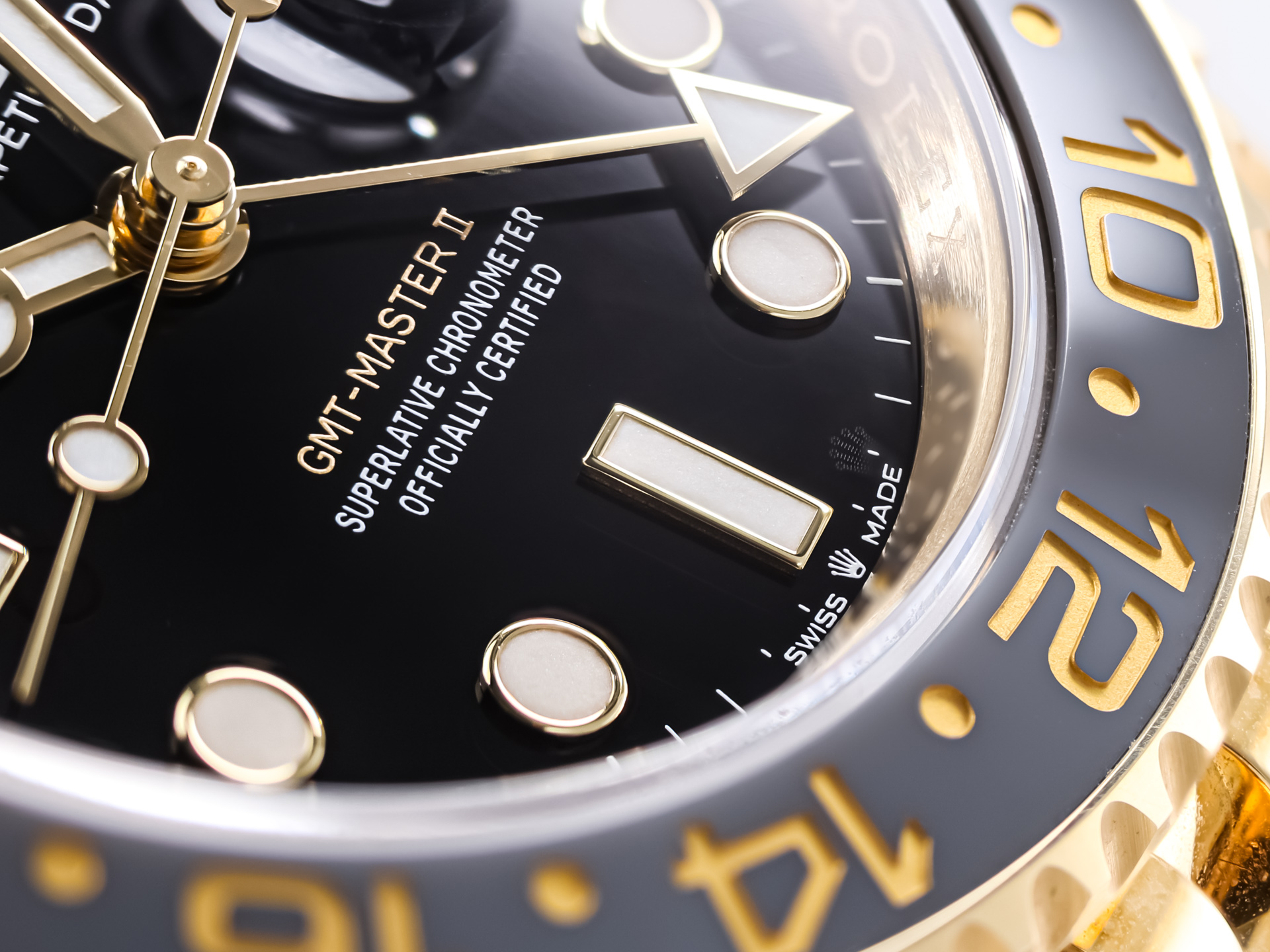 The watch features a 40 mm case made from Rolex’s proprietary 18k yellow gold alloy, offering exceptional durability, a rich warm tone, and a flawless finish. The bidirectional rotatable bezel is fitted with a black and grey Cerachrom insert (GRNR), manufactured from virtually scratch-proof ceramic and adorned with gold-filled engraved numerals, allowing for the easy tracking of a second time zone.